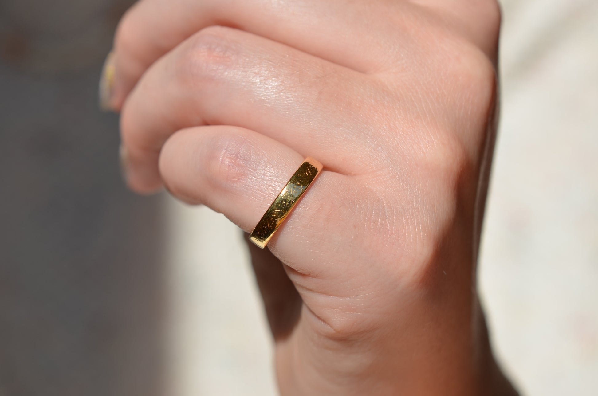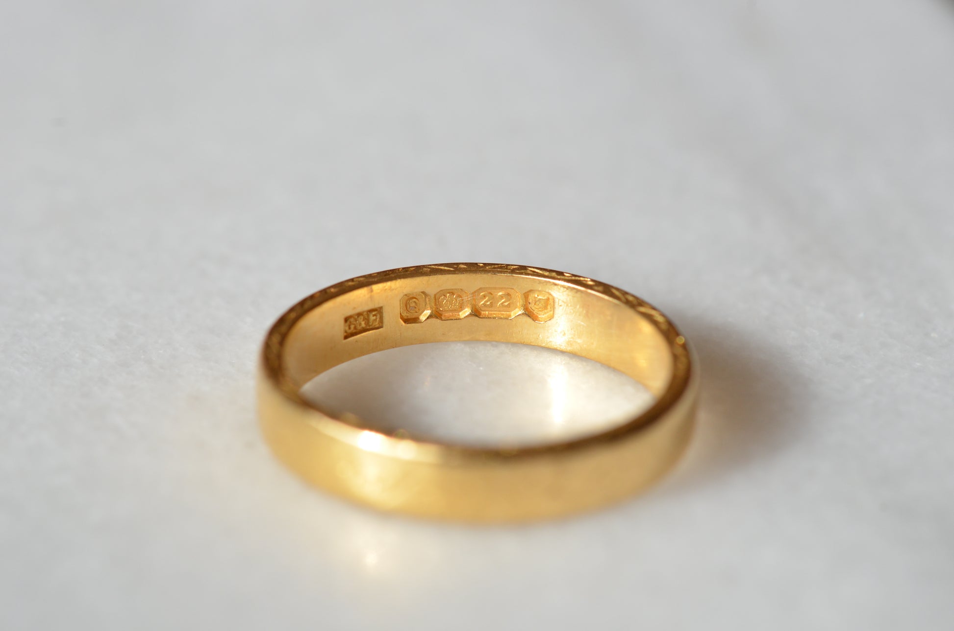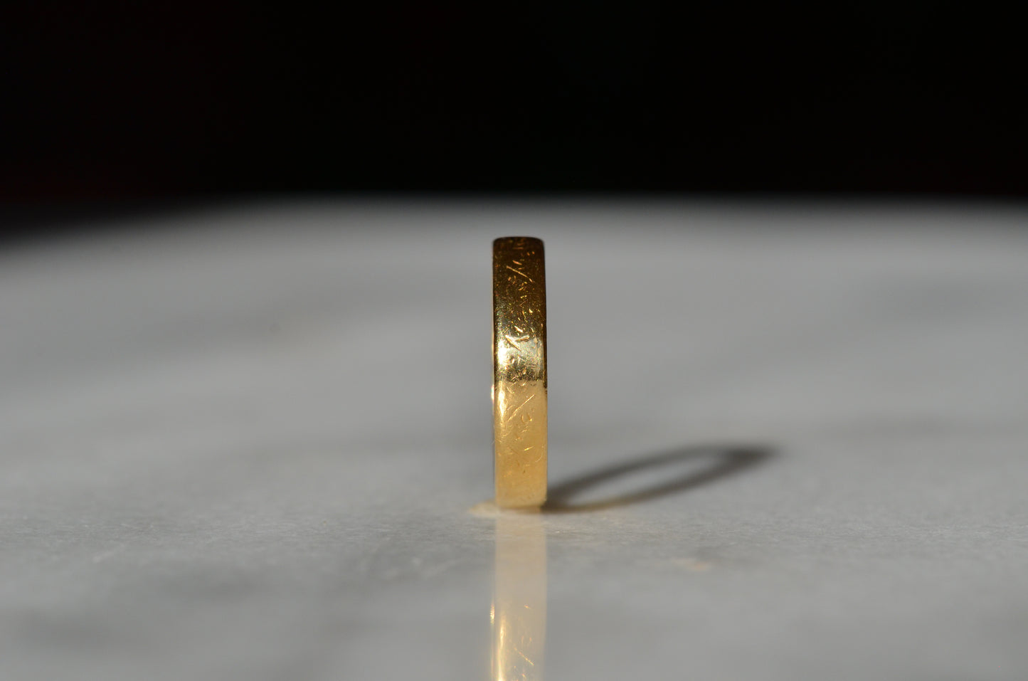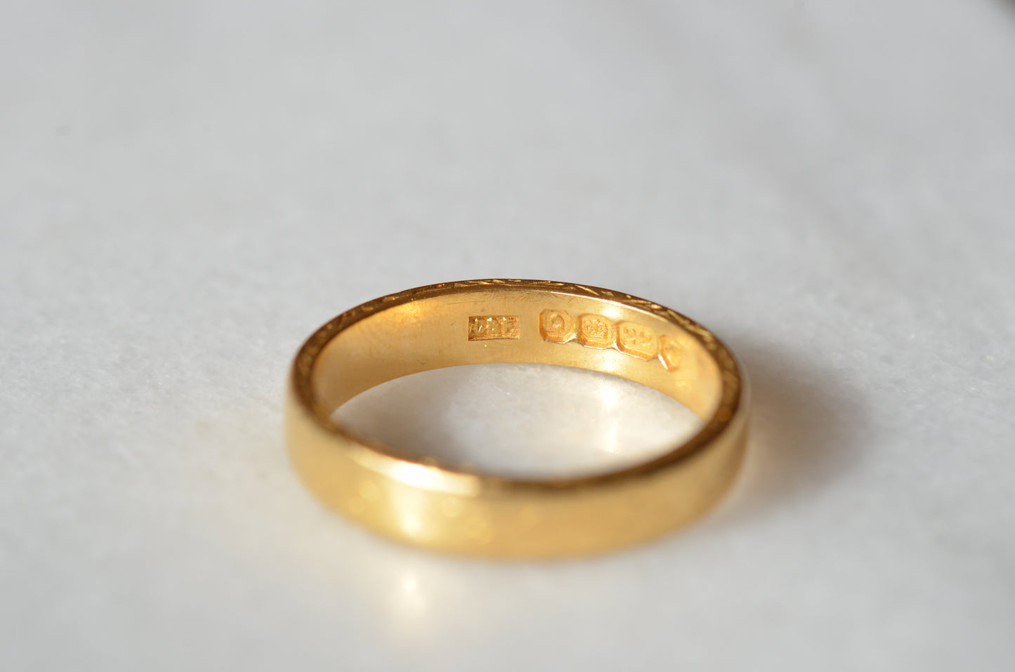 Gold alloys are softer in higher karats, so while this band once bore an intricate foliate-pattern engraving, it's been well loved and well worn, leaving only the traces of the engraved detail. The engraving remains a little crisper along the two sides of the band, giving a sense of the delicate swirling design.