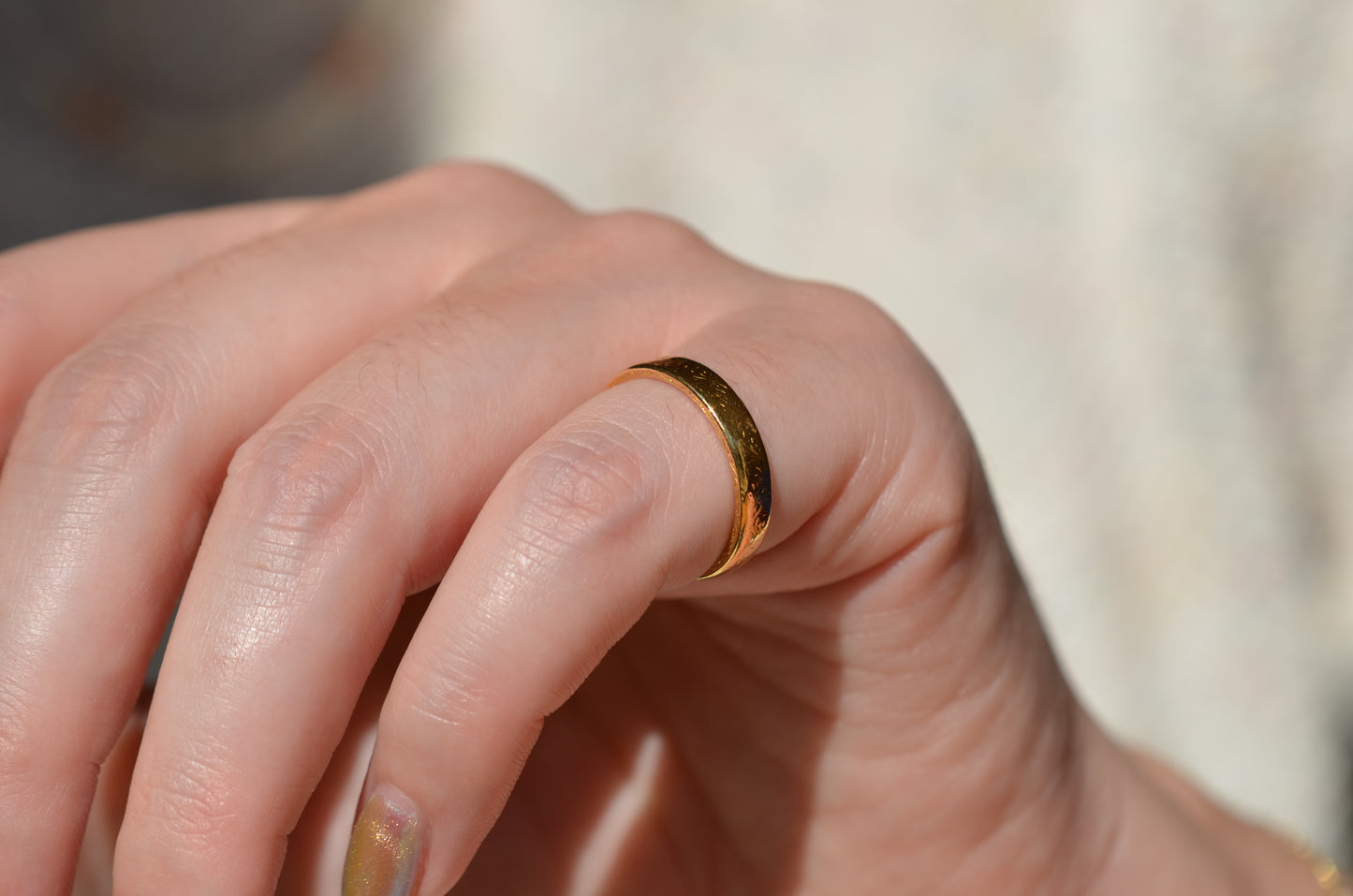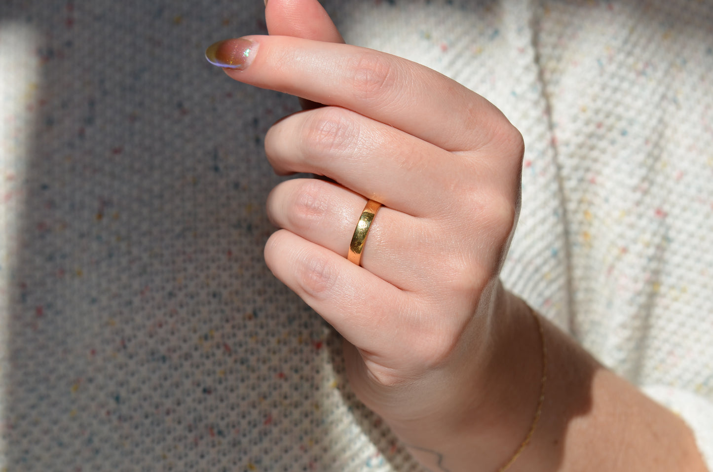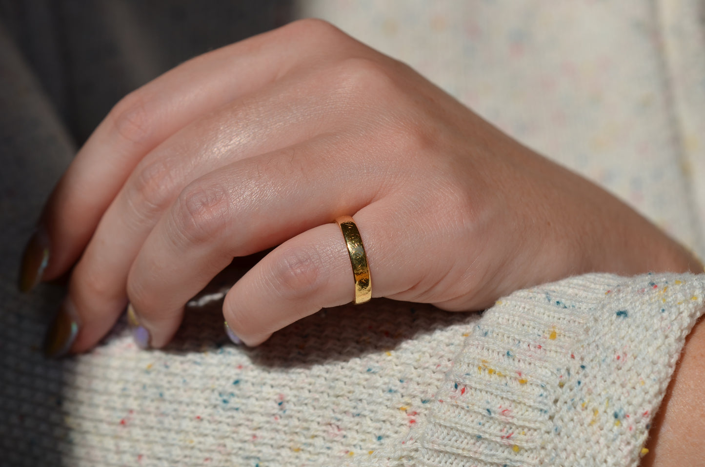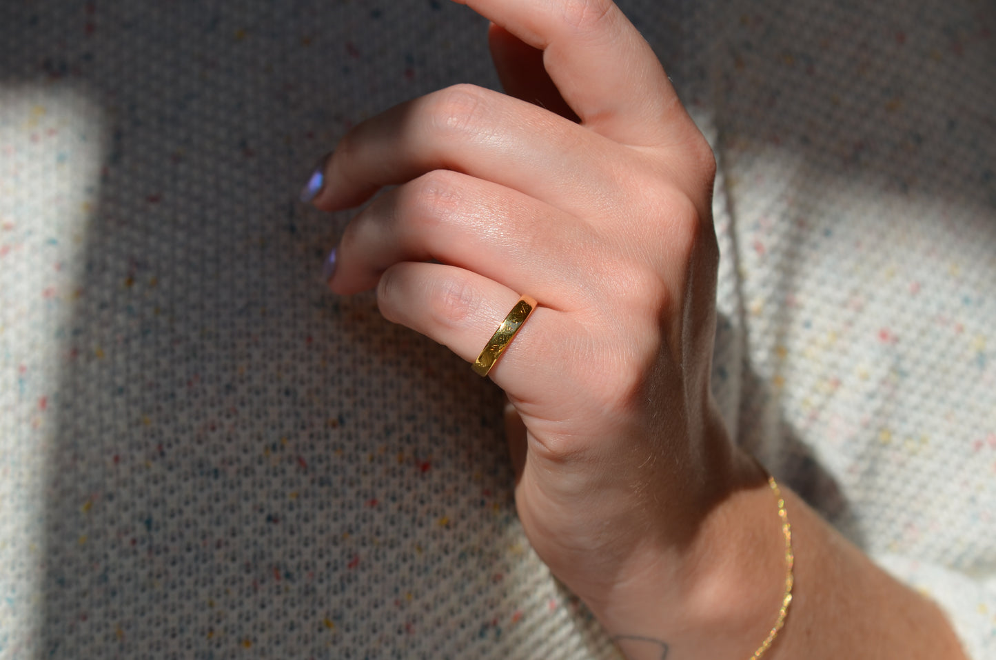 Gold alloys are softer in higher karats, so while this band once bore an intricate foliate-pattern engraving, it's been well loved and well worn, leaving only the traces of the engraved detail. The engraving remains a little crisper along the two sides of the band, giving a sense of the delicate swirling design.
