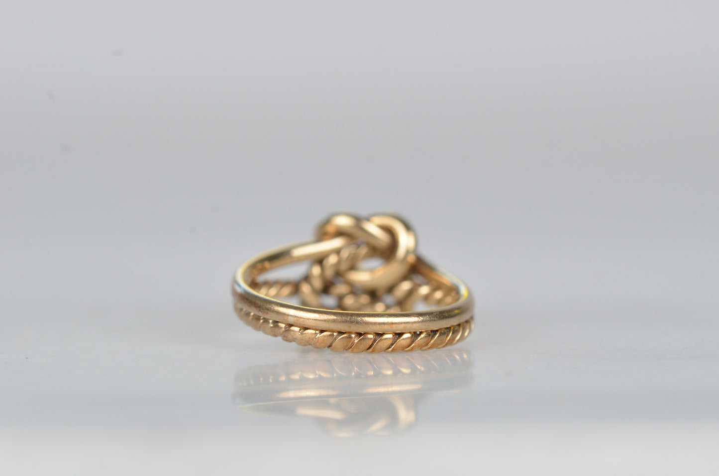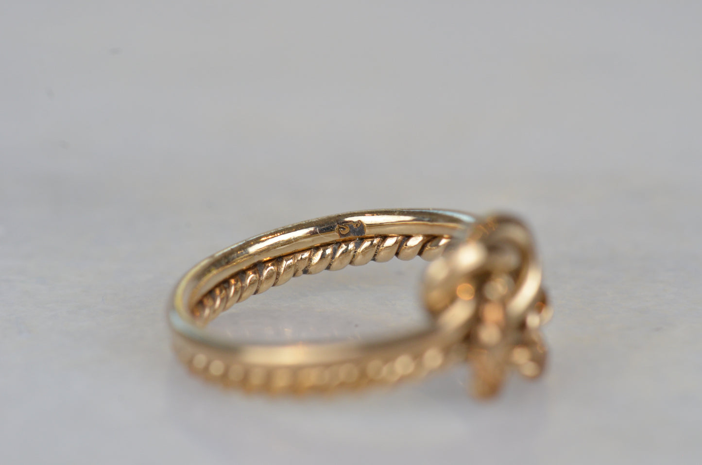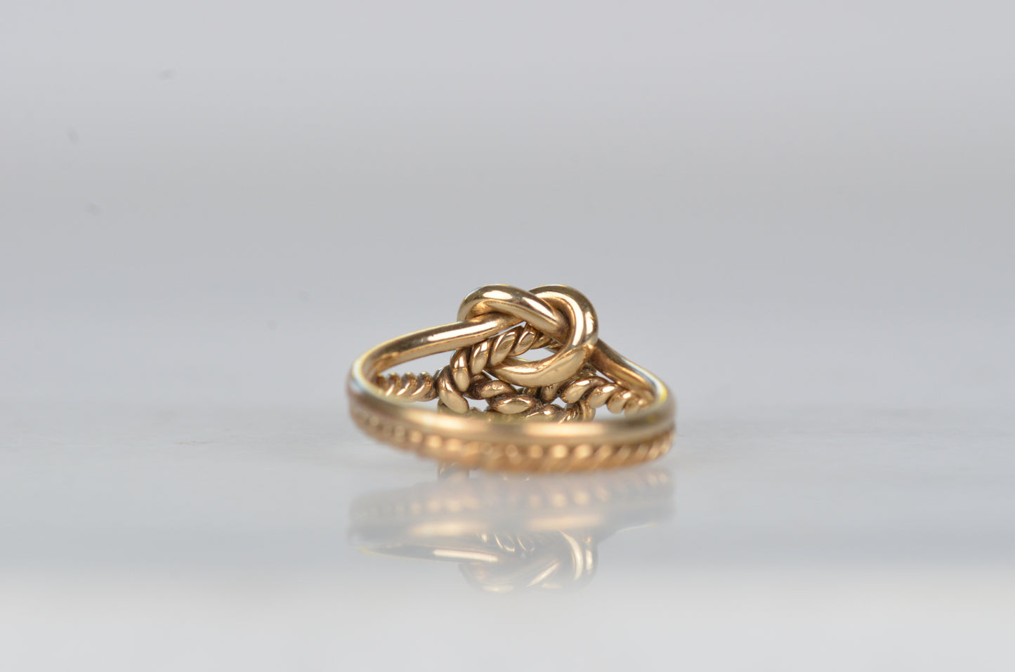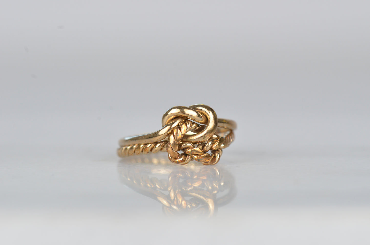 A fantastic little nautical ring in the style of a lovers' knot, with two independent bands locked together in a pair of nestled knots. One ring is a rope-like twist, while the other is smooth - we love to imagine that it represents the unique features of two souls that are entwined. Perfect as a symbol of affection and commitment between lovers, friends, or family.