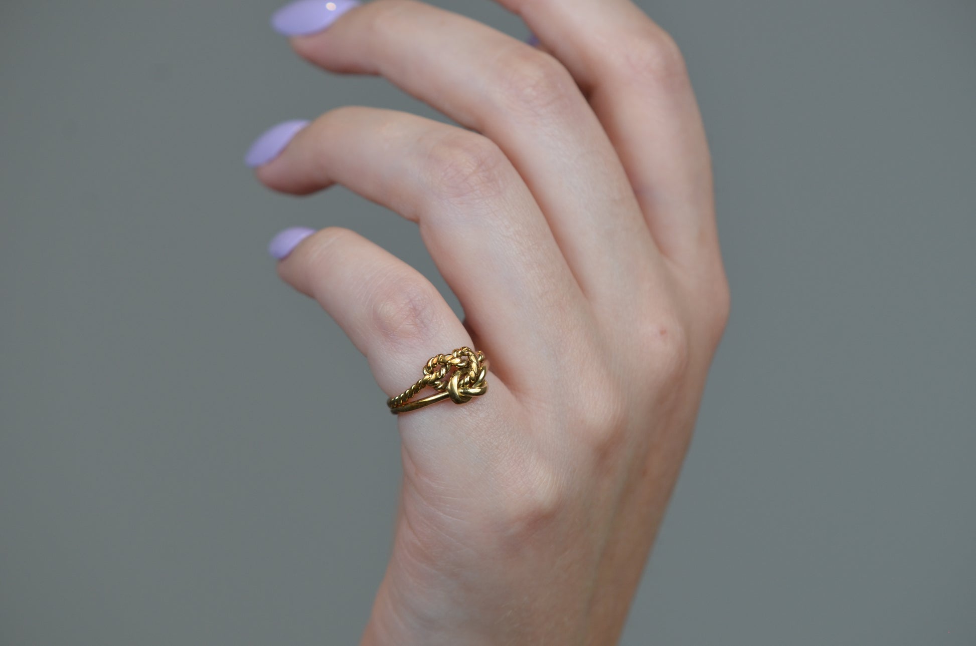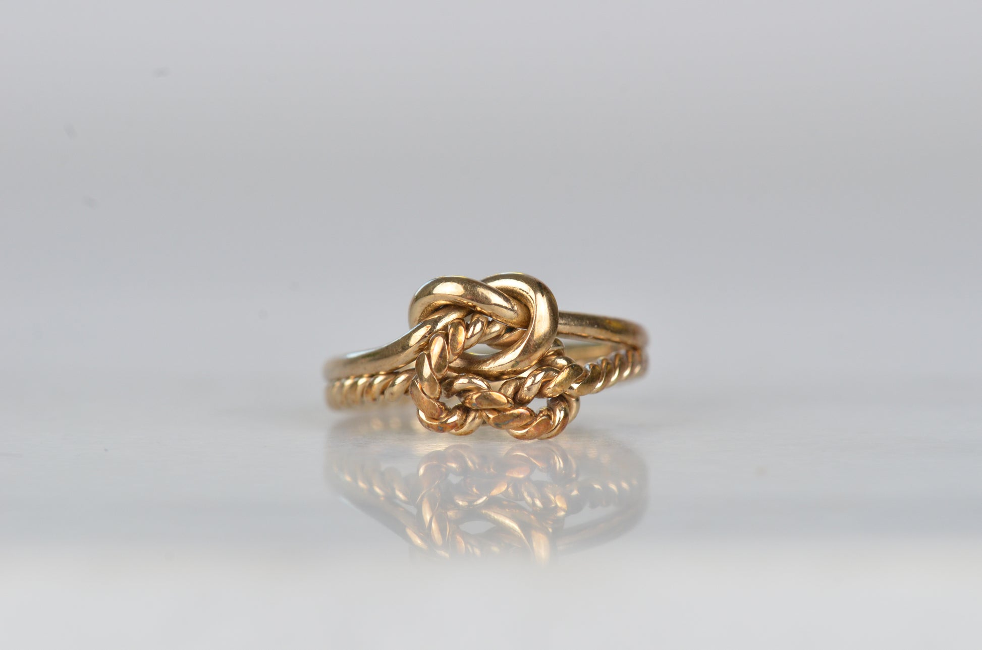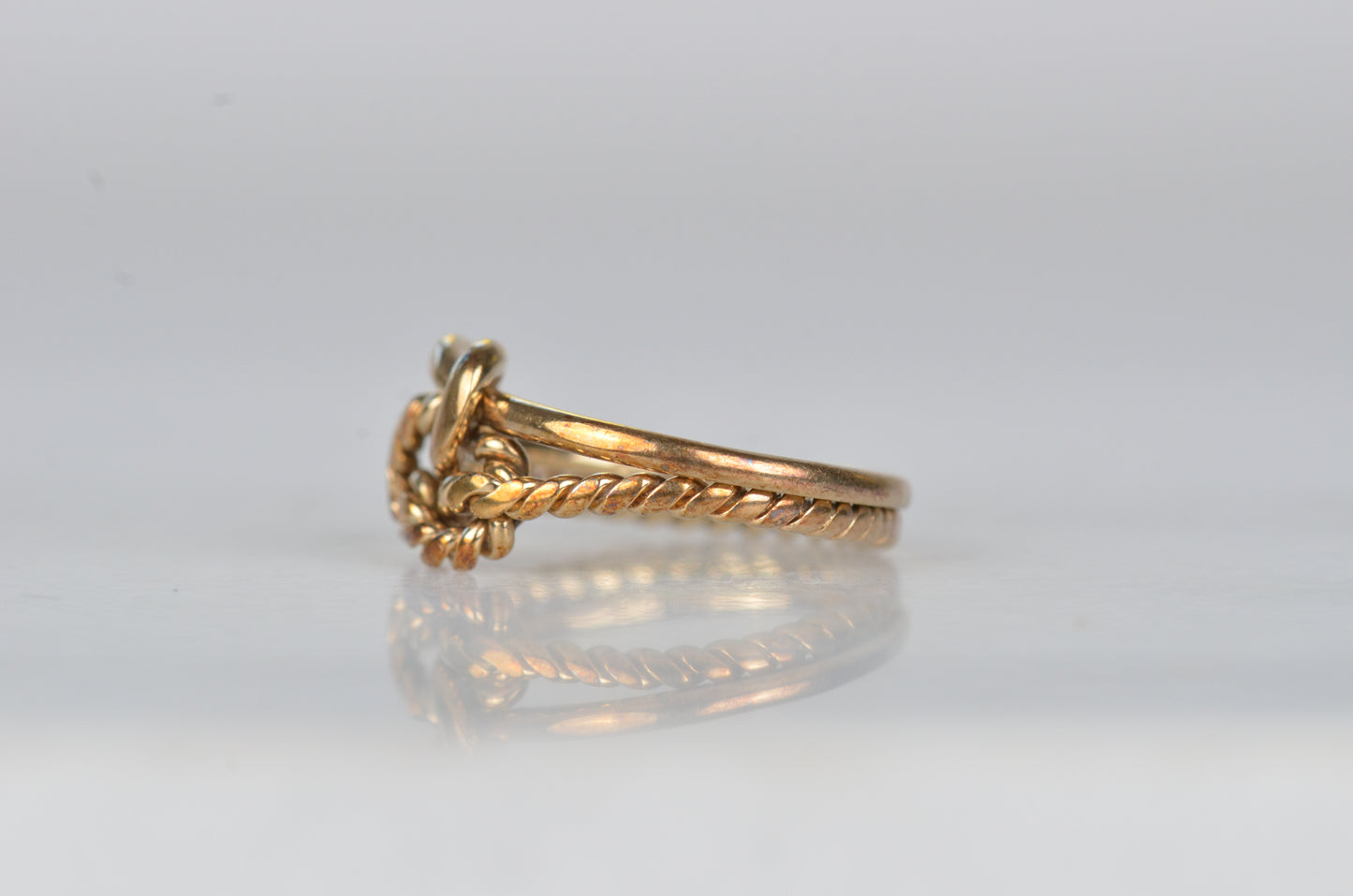 A fantastic little nautical ring in the style of a lovers' knot, with two independent bands locked together in a pair of nestled knots. One ring is a rope-like twist, while the other is smooth - we love to imagine that it represents the unique features of two souls that are entwined. Perfect as a symbol of affection and commitment between lovers, friends, or family.
