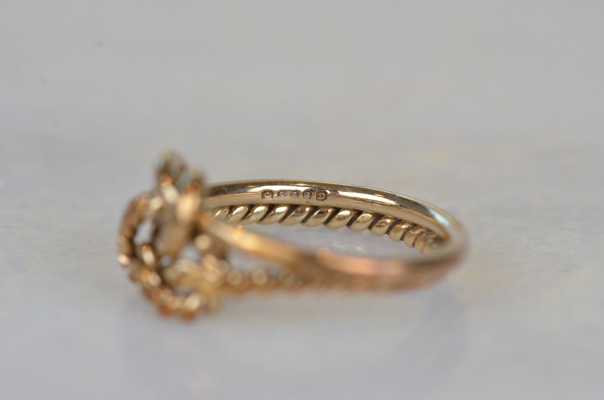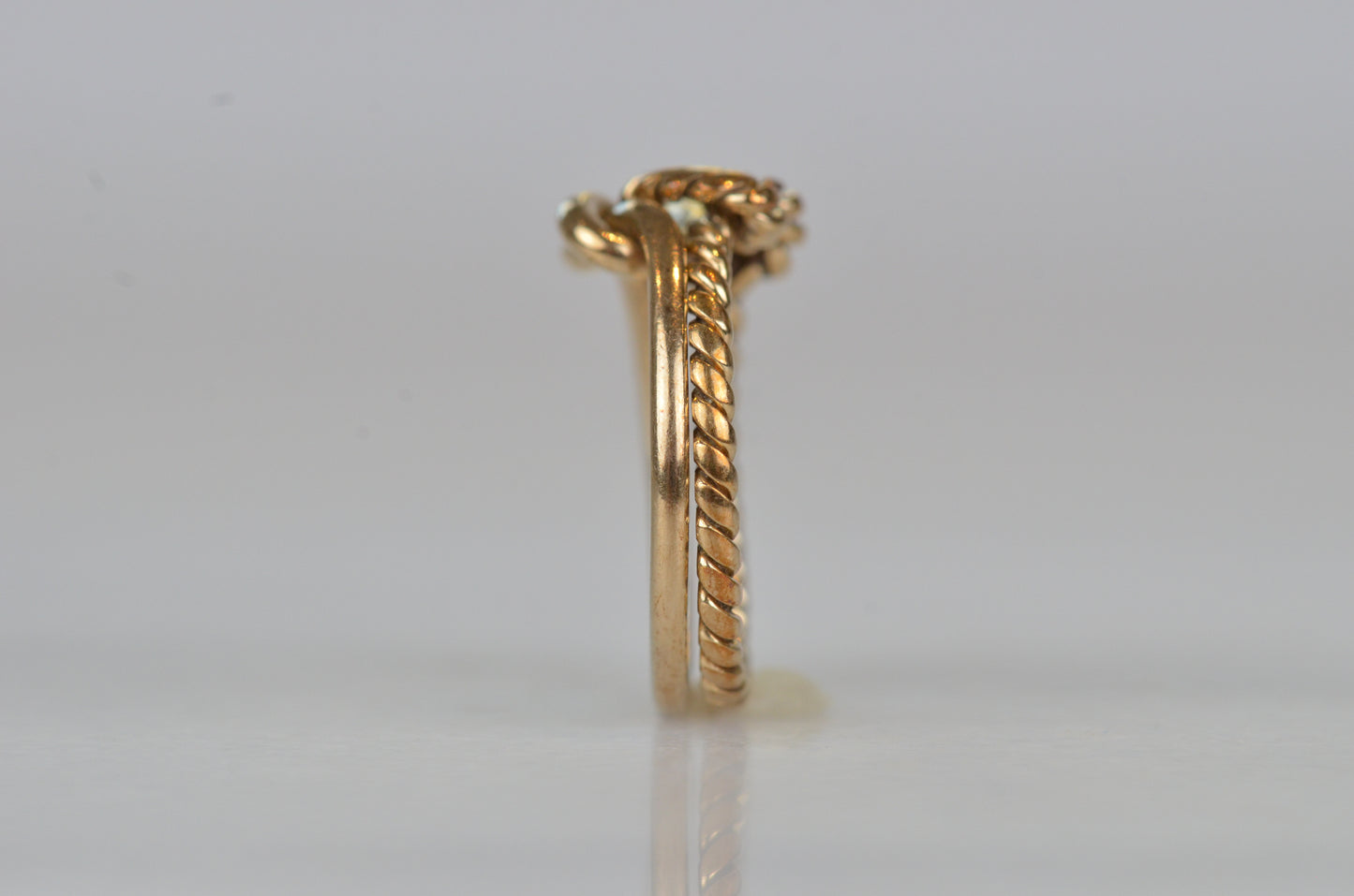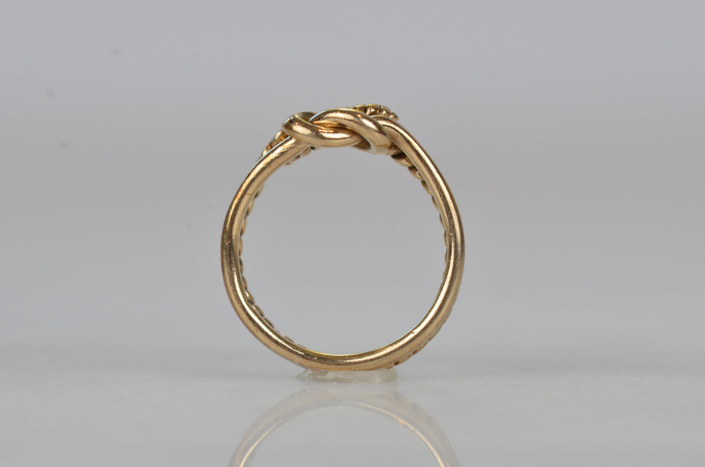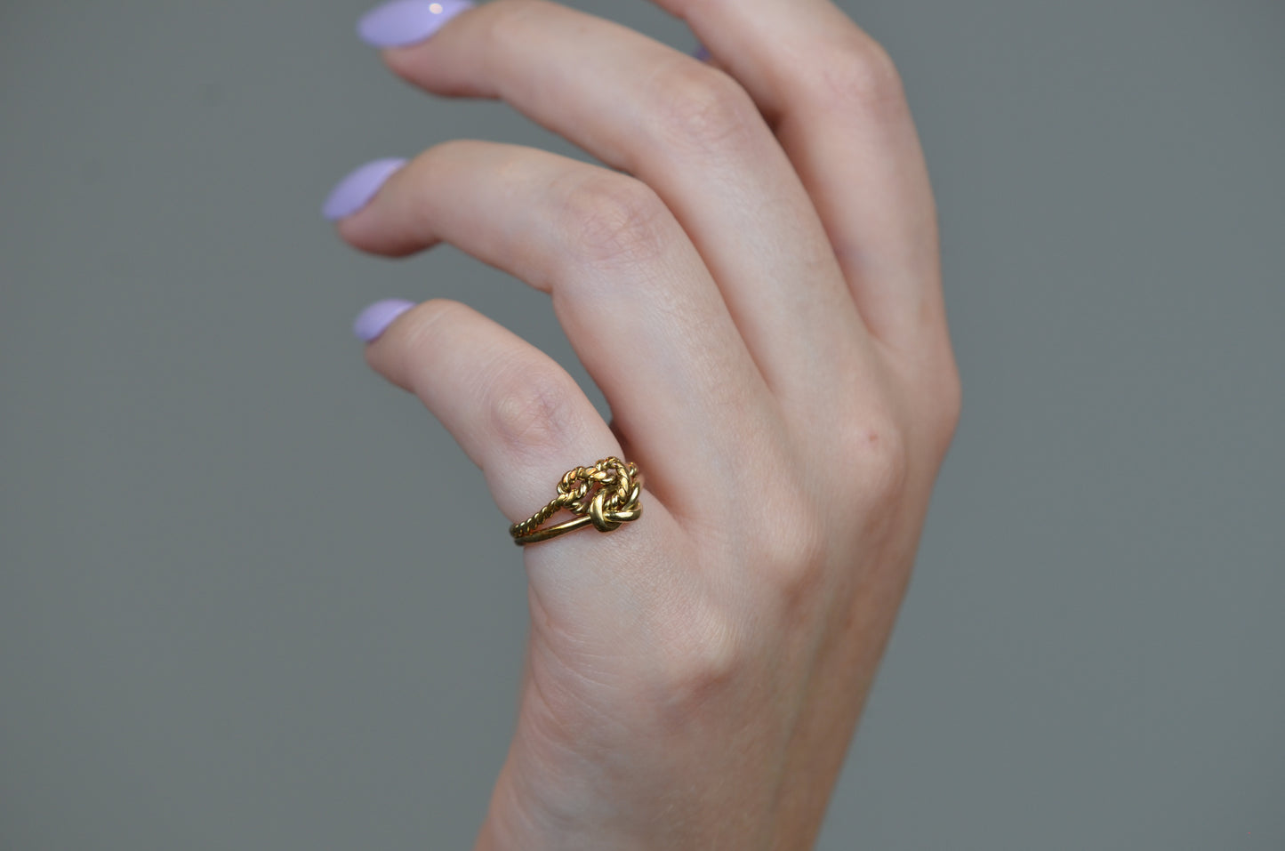 A fantastic little nautical ring in the style of a lovers' knot, with two independent bands locked together in a pair of nestled knots. One ring is a rope-like twist, while the other is smooth - we love to imagine that it represents the unique features of two souls that are entwined. Perfect as a symbol of affection and commitment between lovers, friends, or family.
