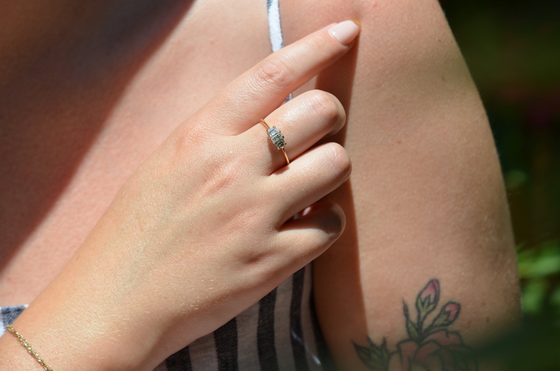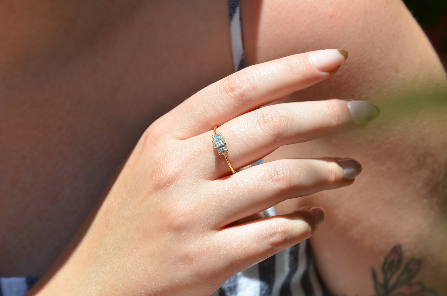 A classic diamond ring style with elegant streamlined design, this trilogy ring features three emerald cut diamonds each creating a hall of mirrors on a slim band that tapers perfectly into the mount. Three stone rings have long been enjoyed for their pleasant aesthetic effect, and are widely used to represent relationships, with each stone standing in for past, present, and future. We also love to see them being used to represent personal growth and accomplishments outside of romantic endeavours.