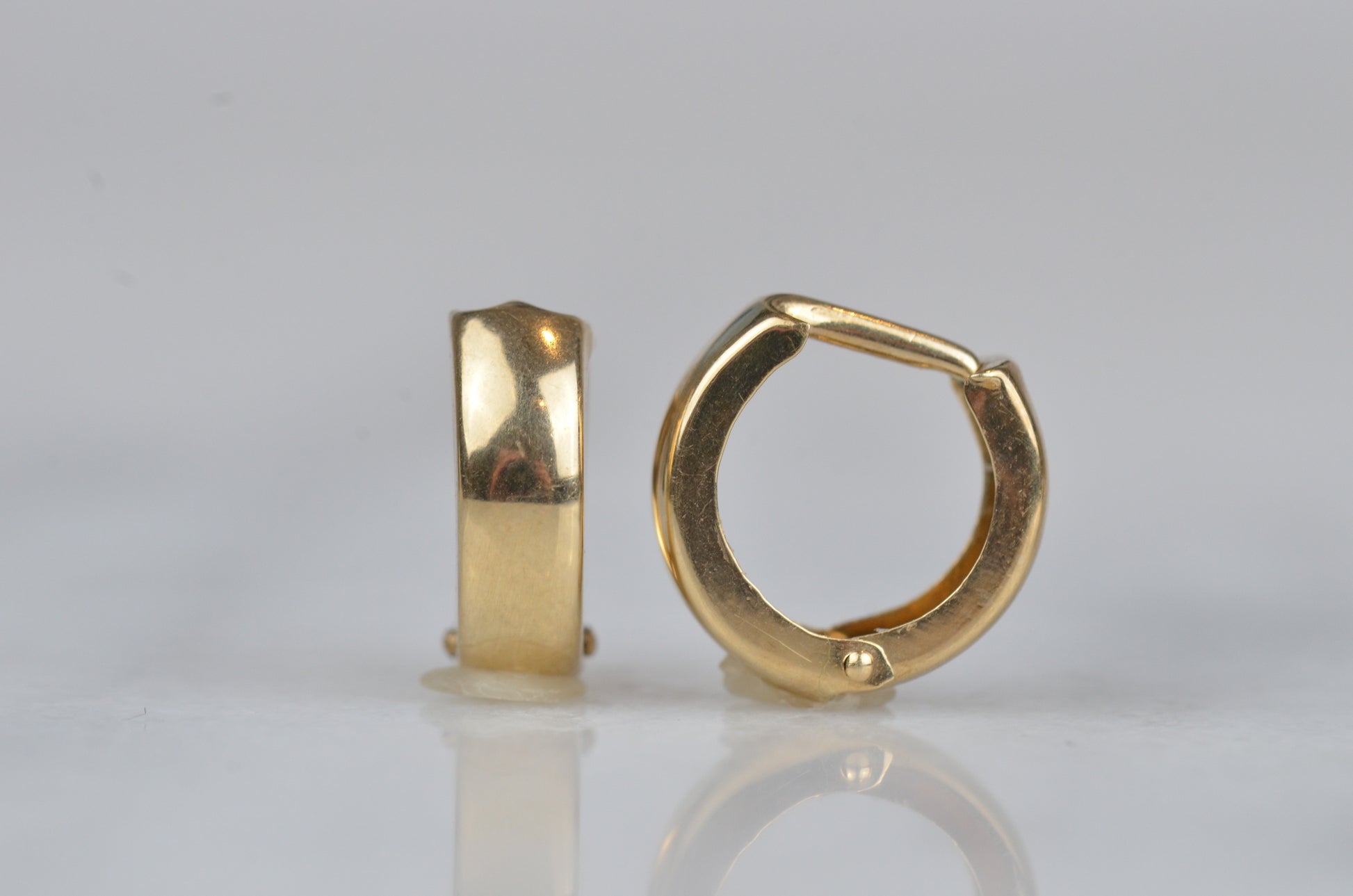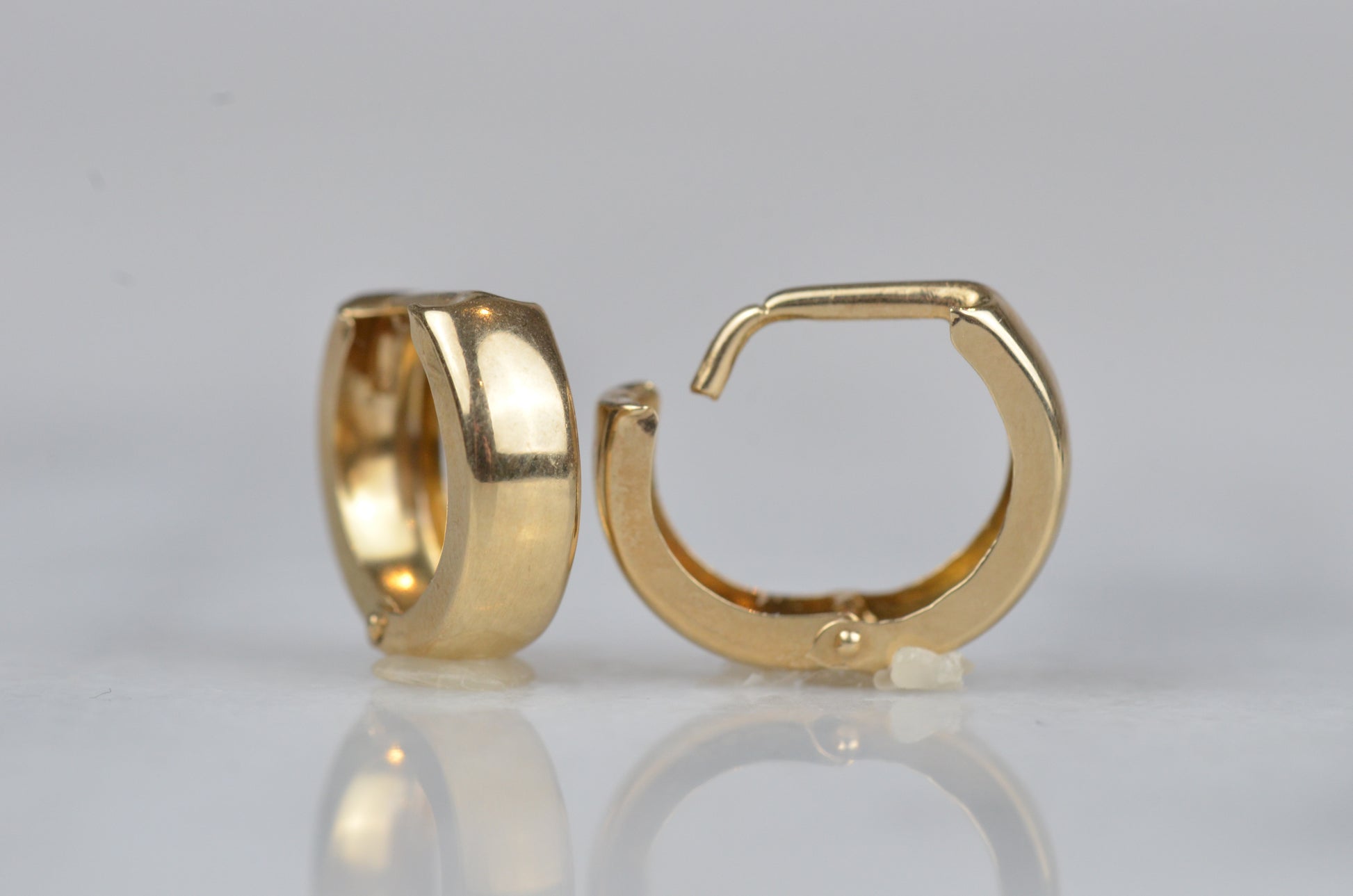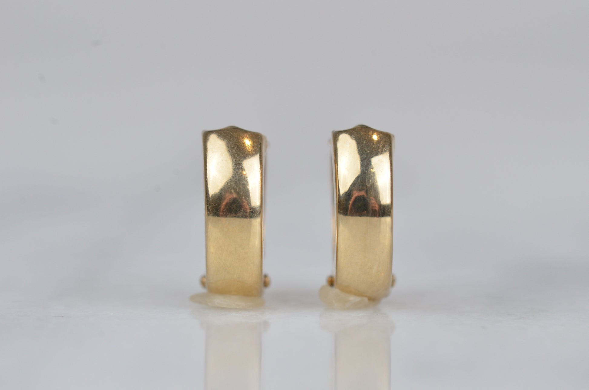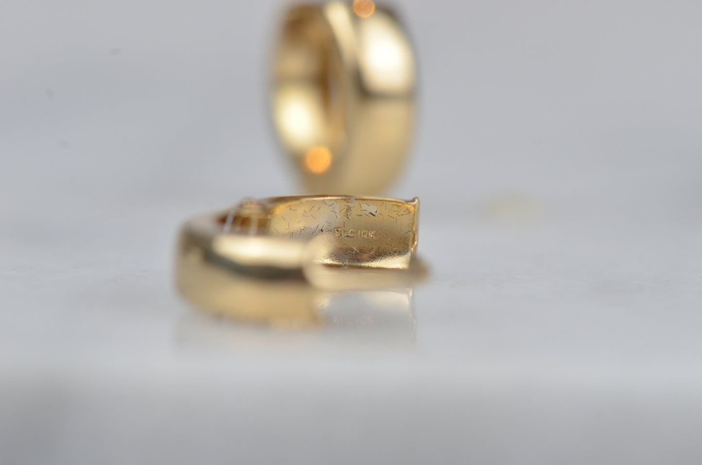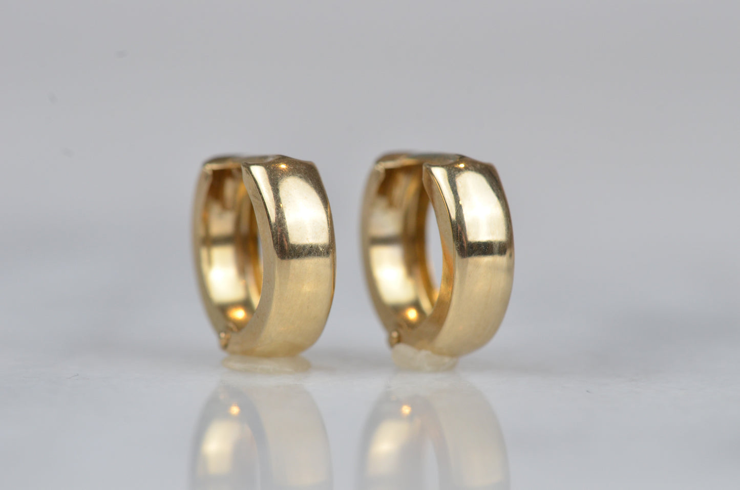 A broad swath of gold with a snug fit to the ear, these chubby hoops are comfortable and cute and perfect for everyday wear. The click of the closure is secure, but please note that the die-struck manufacture of the earrings includes their post, which has made it slightly thicker than standard. Posts made from wire are typically 0.8mm in diameter, while these posts are 1mm - if you're one of so many of us with slightly looser piercings (whether from a history of stretching, or of wearing lots of heavy earrings) you shouldn't have any issue, but we wouldn't recommend these for those with tighter or new piercings.