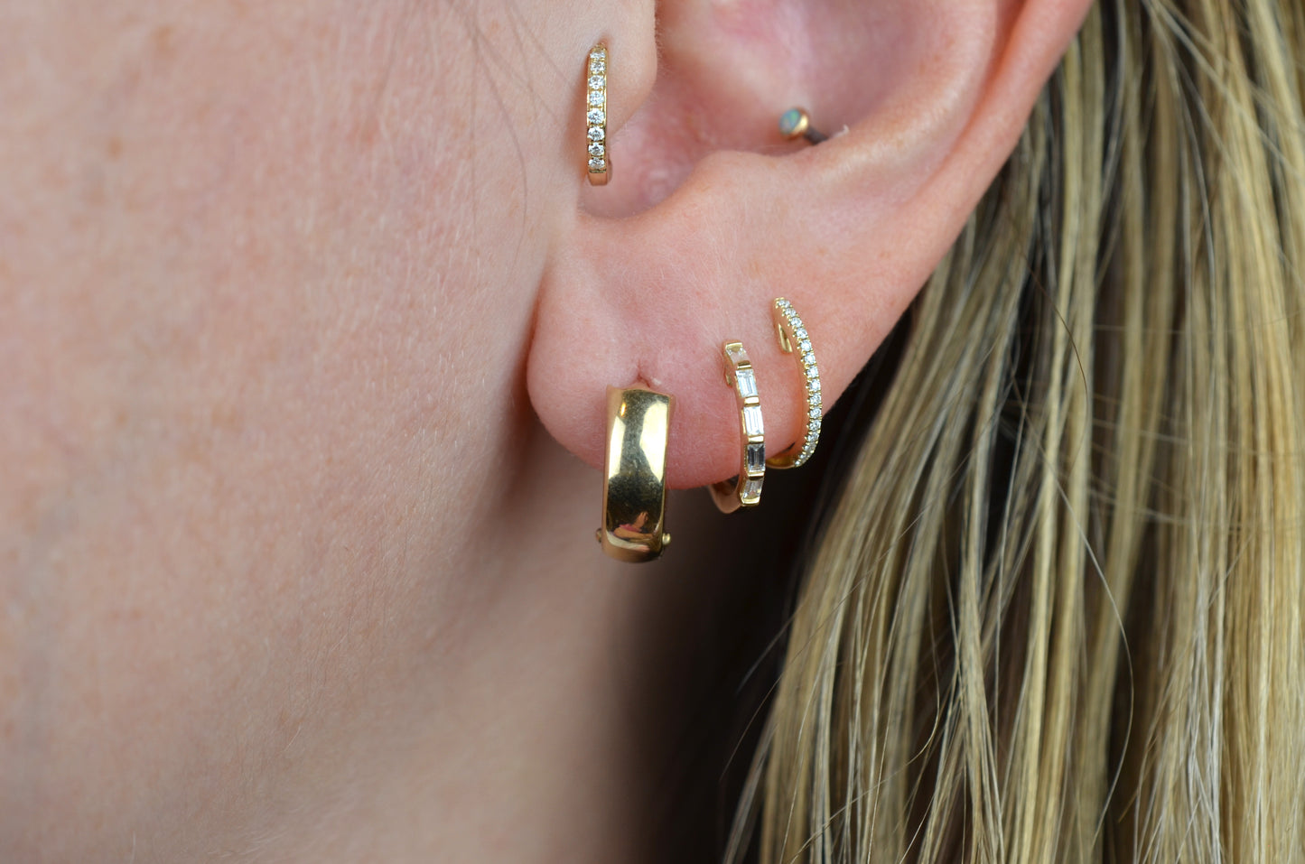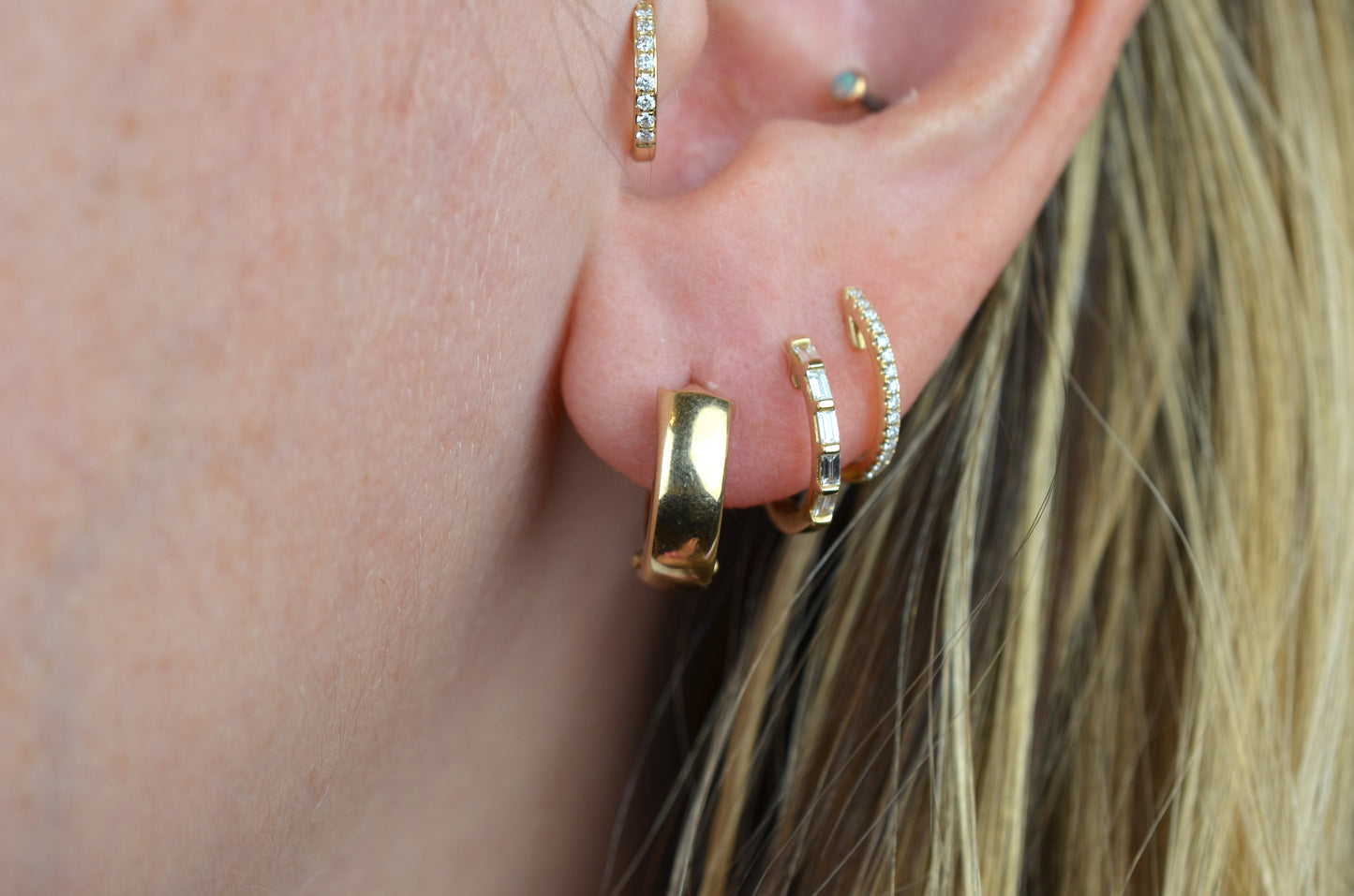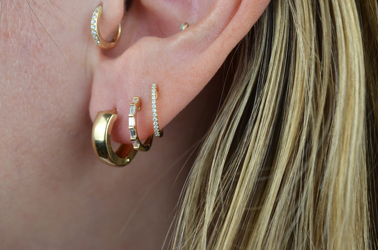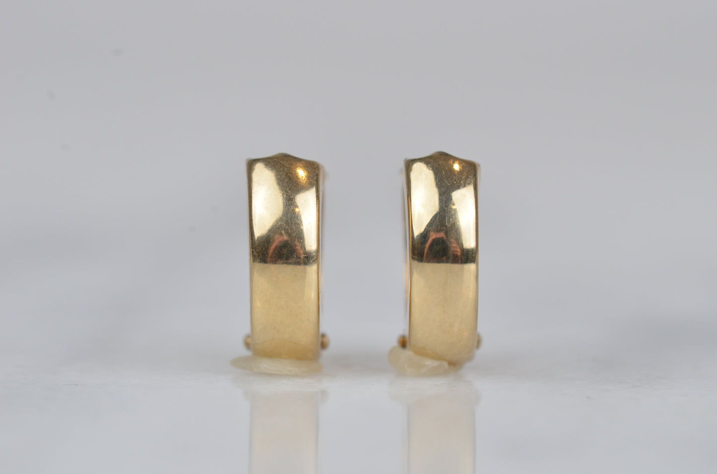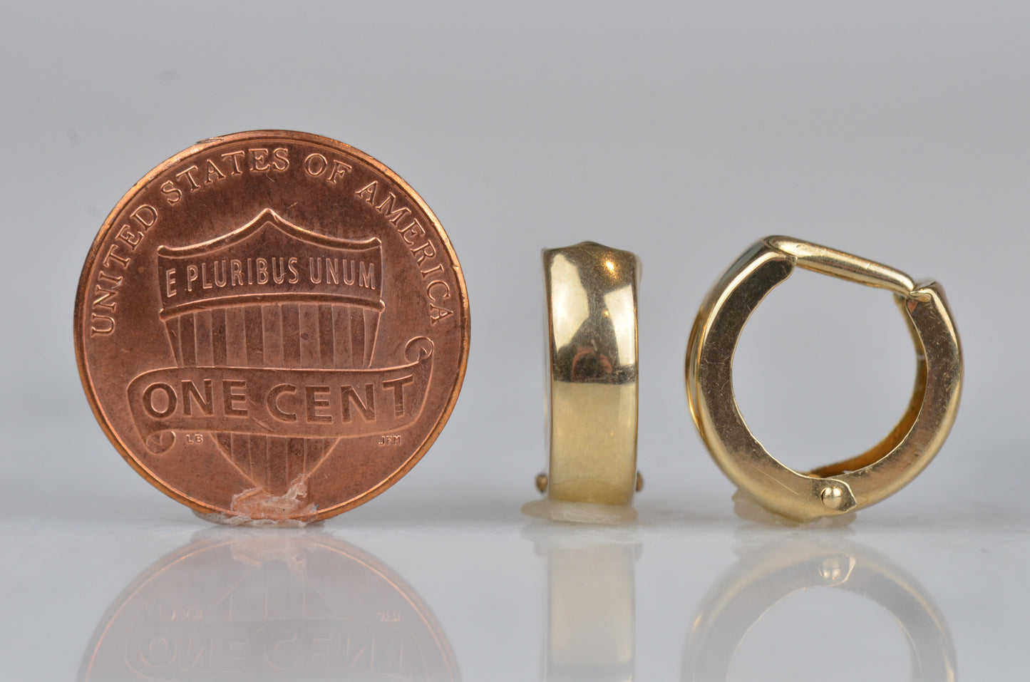 A broad swath of gold with a snug fit to the ear, these chubby hoops are comfortable and cute and perfect for everyday wear. The click of the closure is secure, but please note that the die-struck manufacture of the earrings includes their post, which has made it slightly thicker than standard. Posts made from wire are typically 0.8mm in diameter, while these posts are 1mm - if you're one of so many of us with slightly looser piercings (whether from a history of stretching, or of wearing lots of heavy earrings) you shouldn't have any issue, but we wouldn't recommend these for those with tighter or new piercings.