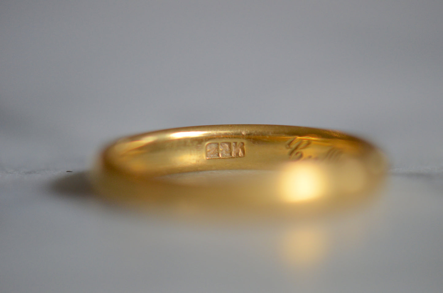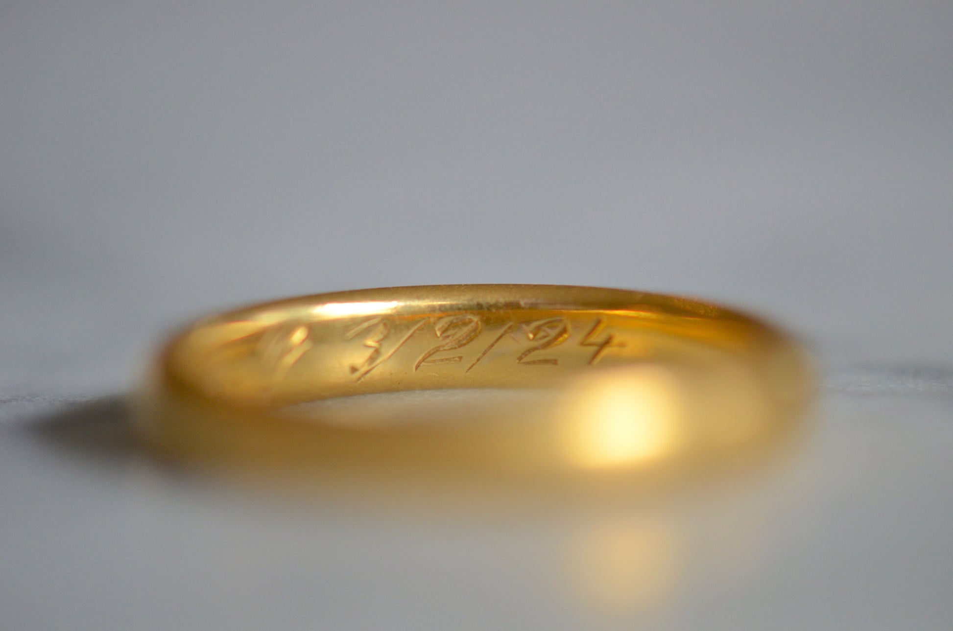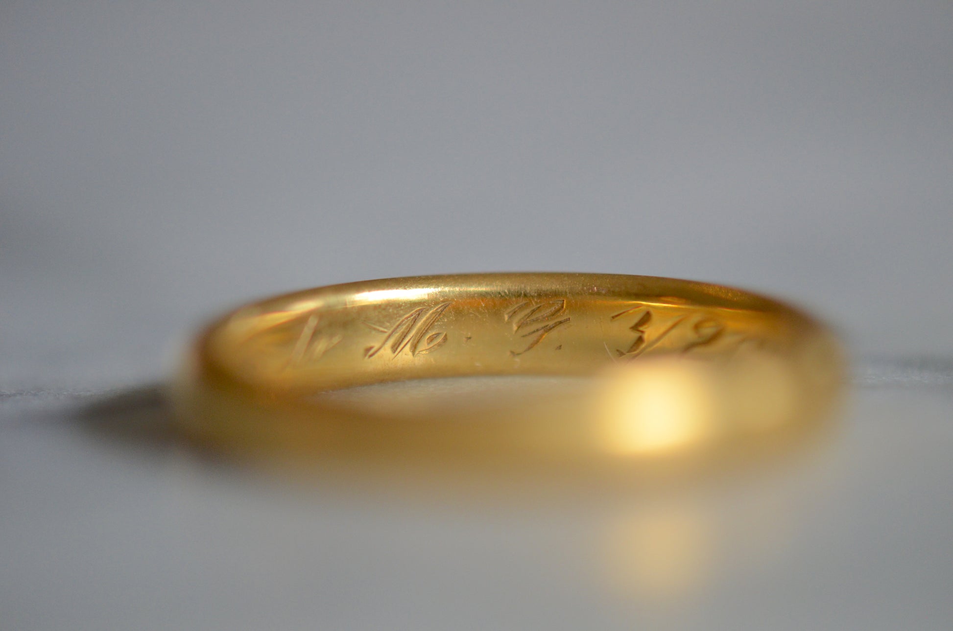 Engraved inside with the initials CM to MG 3/2/24, this old wedding band likely represented a March union, as it appears to be American-made rather than British, but at this point I'm sure the ring won't mind if you choose her to represent a special occasion in early February as well. At 95 years old, she's just shy of being a true "antique," and she has a lot of life in her yet. Her weight and dimensions make her an ideal wedding band, up to the task of everyday wear, or simply a perfect base layer upon which to build your stacks.