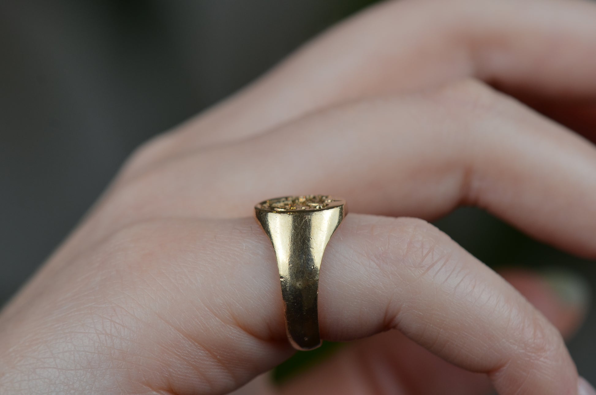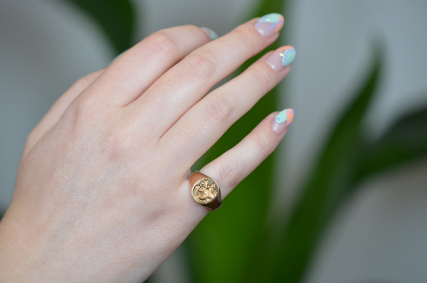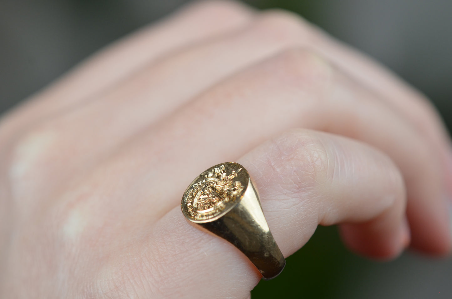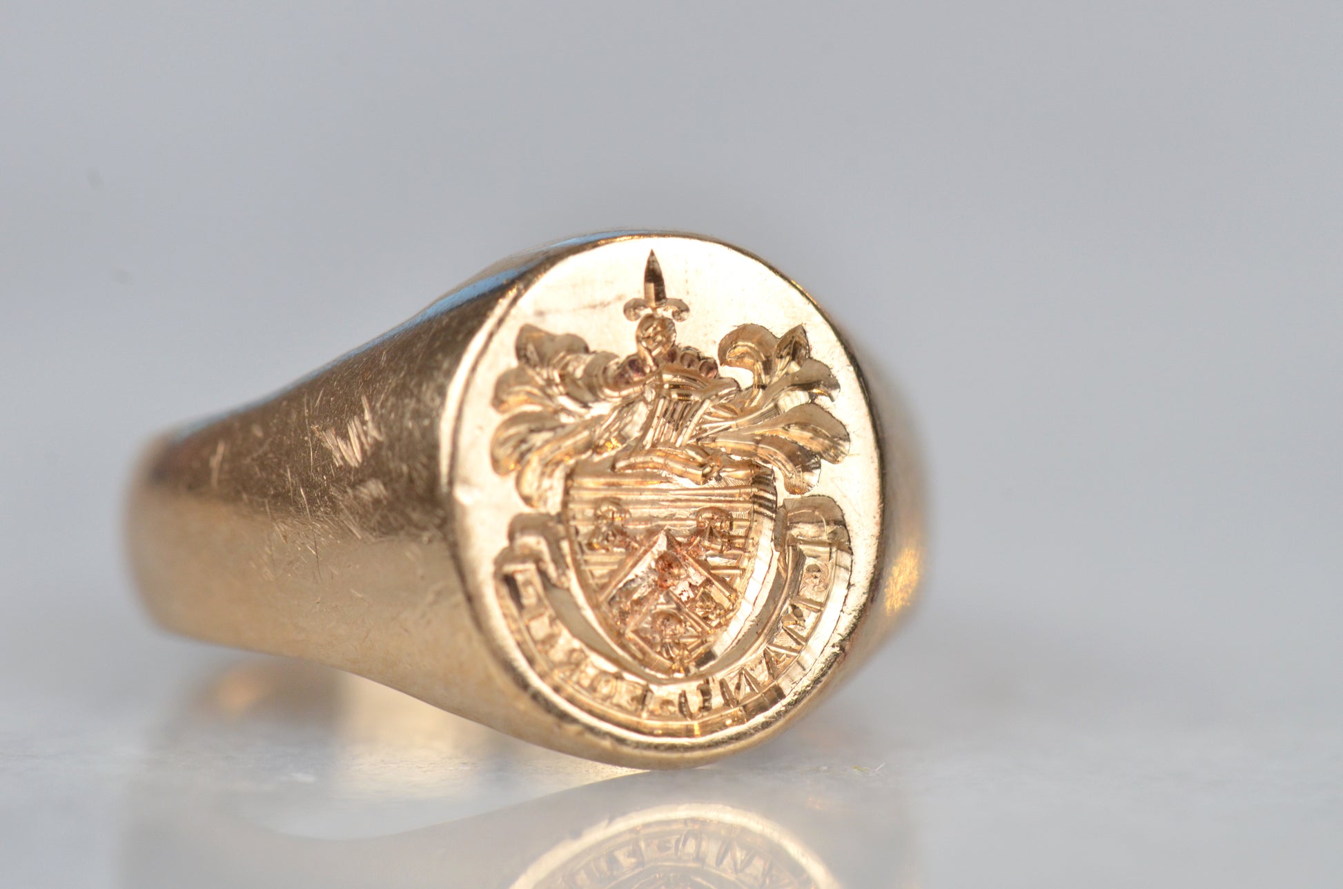 A perfectly charming and beautifully proportioned classic signet ring, hand engraved with what appears to be the coat of arms for the MacKay family, complete with dagger held aloft at the top, and the motto "manu forti" (with a strong hand) scrolled along the bottom. Whether you're a MacKay, a lover of a MacKay, or simply appreciate an exquisitely crafted signet - this ring won't disappoint.