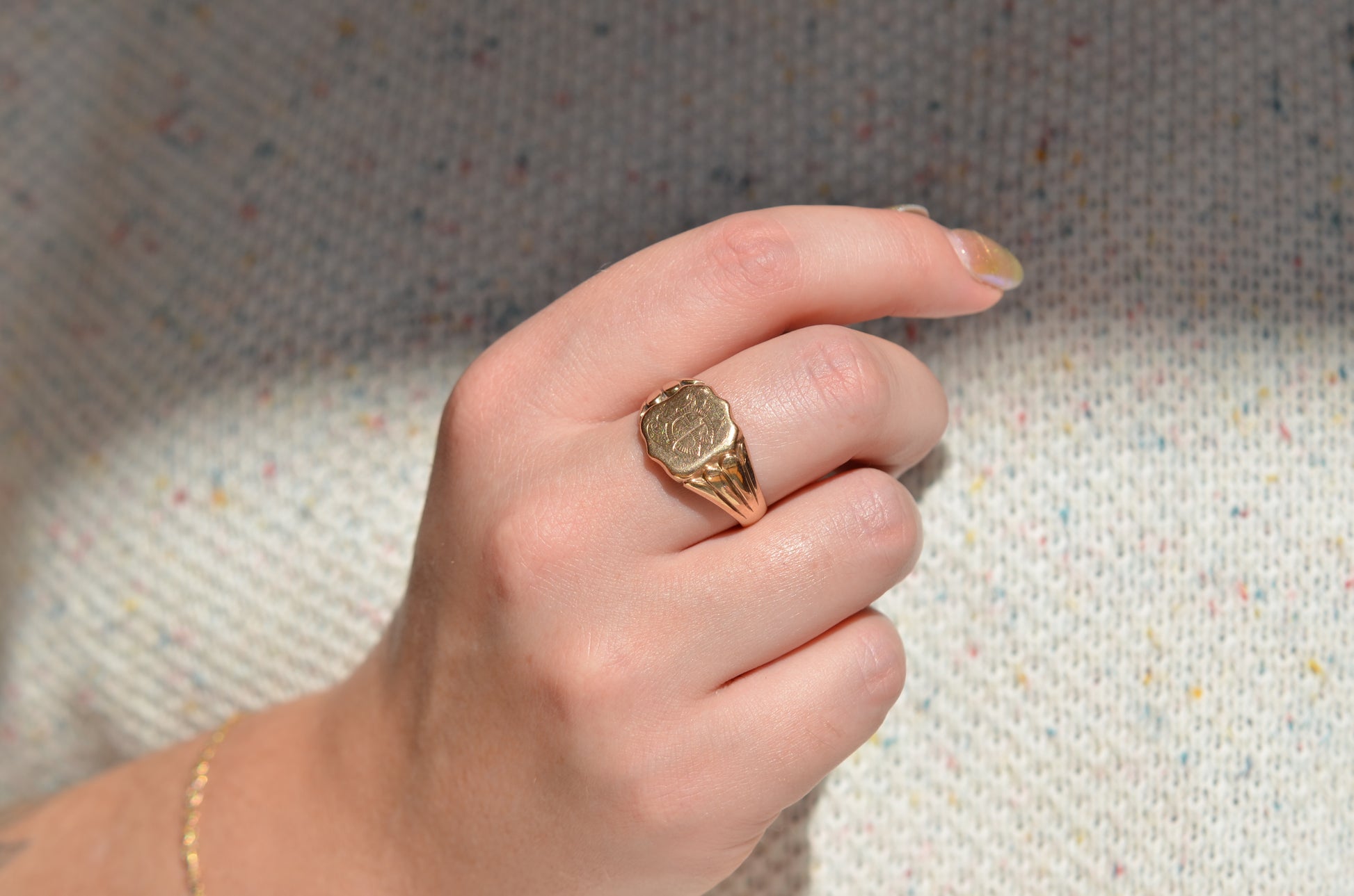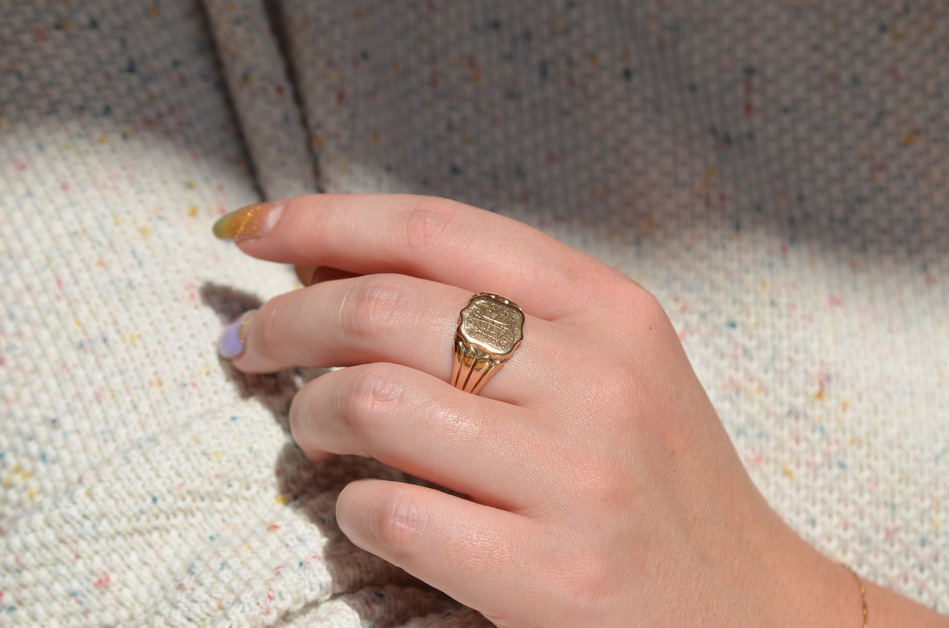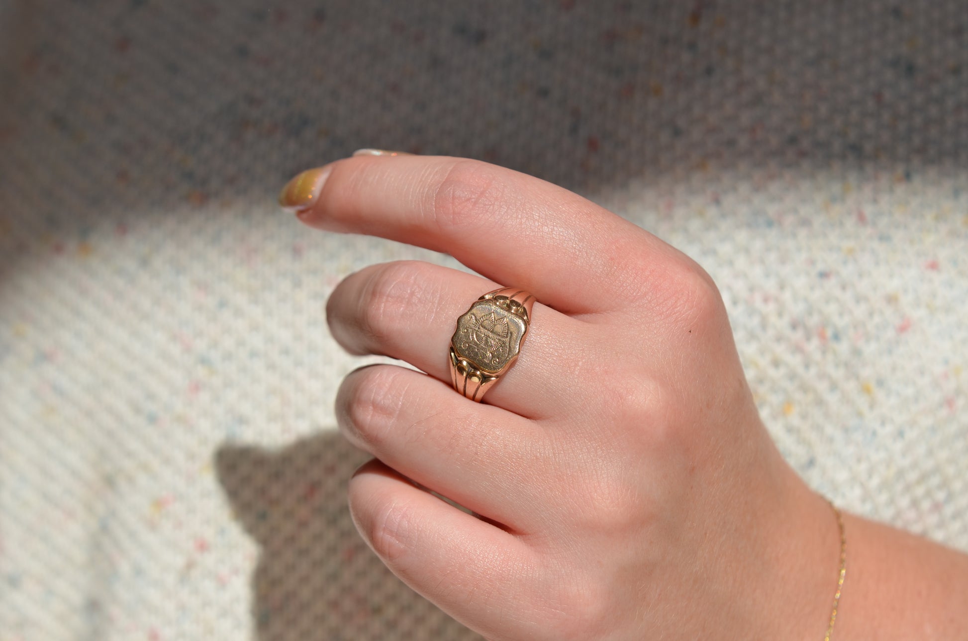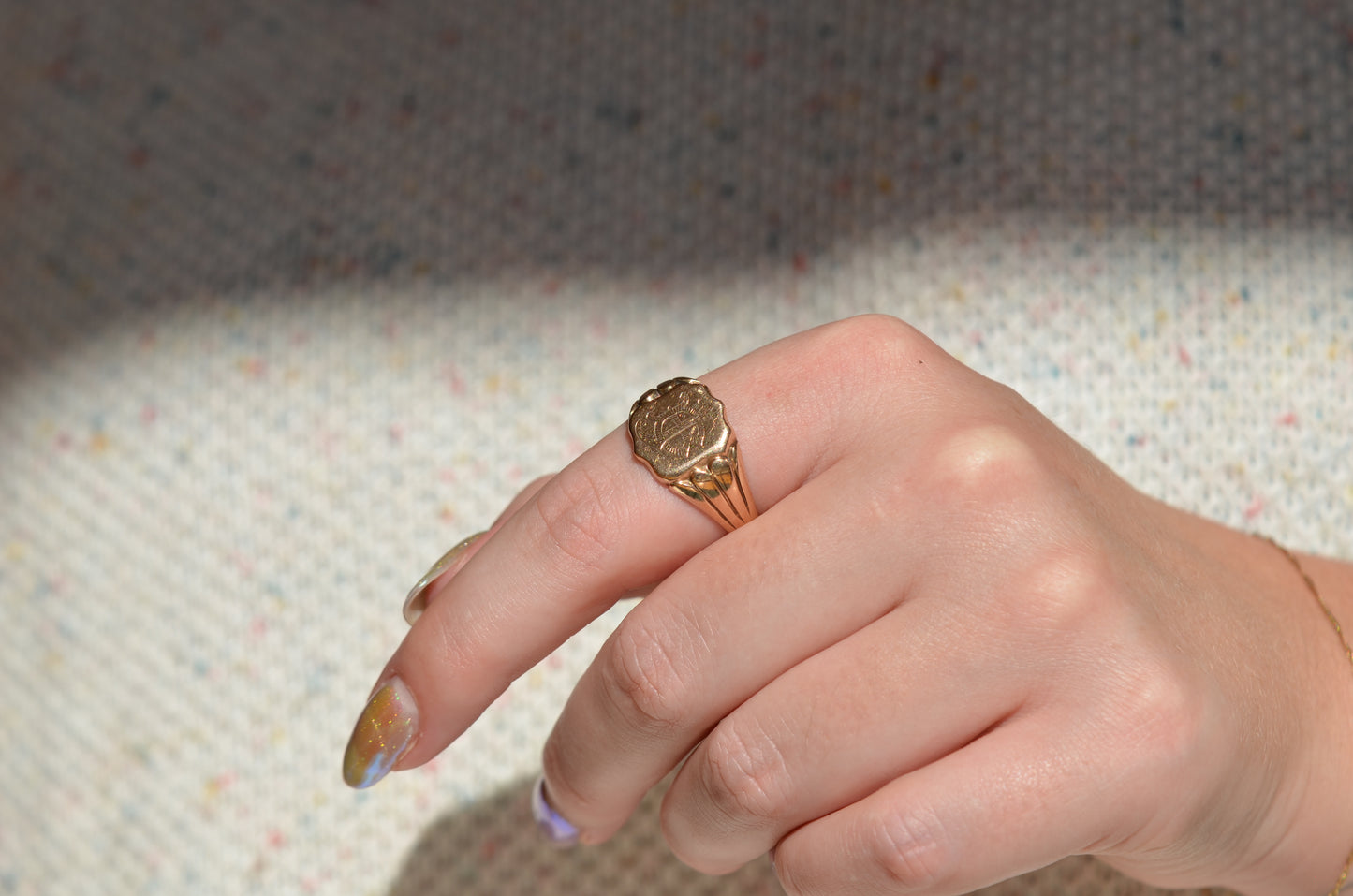 A gorgeous Edwardian signet in a style that feels timeless despite nods to the era, with lovely flared shoulders and shaded initials in the monogram. There's such a special feeling in finding a preloved piece that already has letters on it that are meaningful to you, that we play pretty fast and loose - maybe it's the first or last initials of you and your lover, or your own in another order, or the initials of a loved one: no matter what, it will feel sentimental every time it catches your eye.