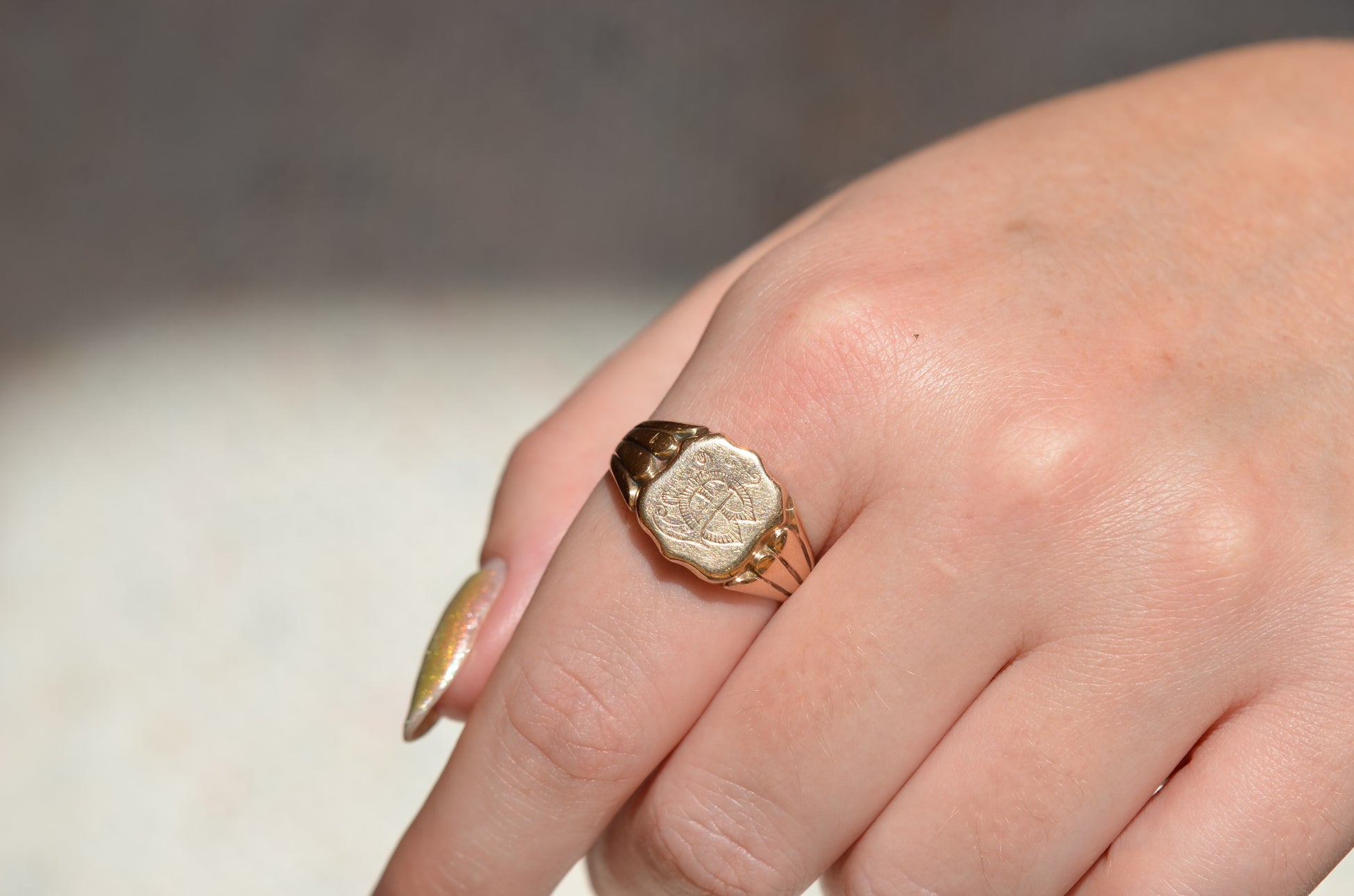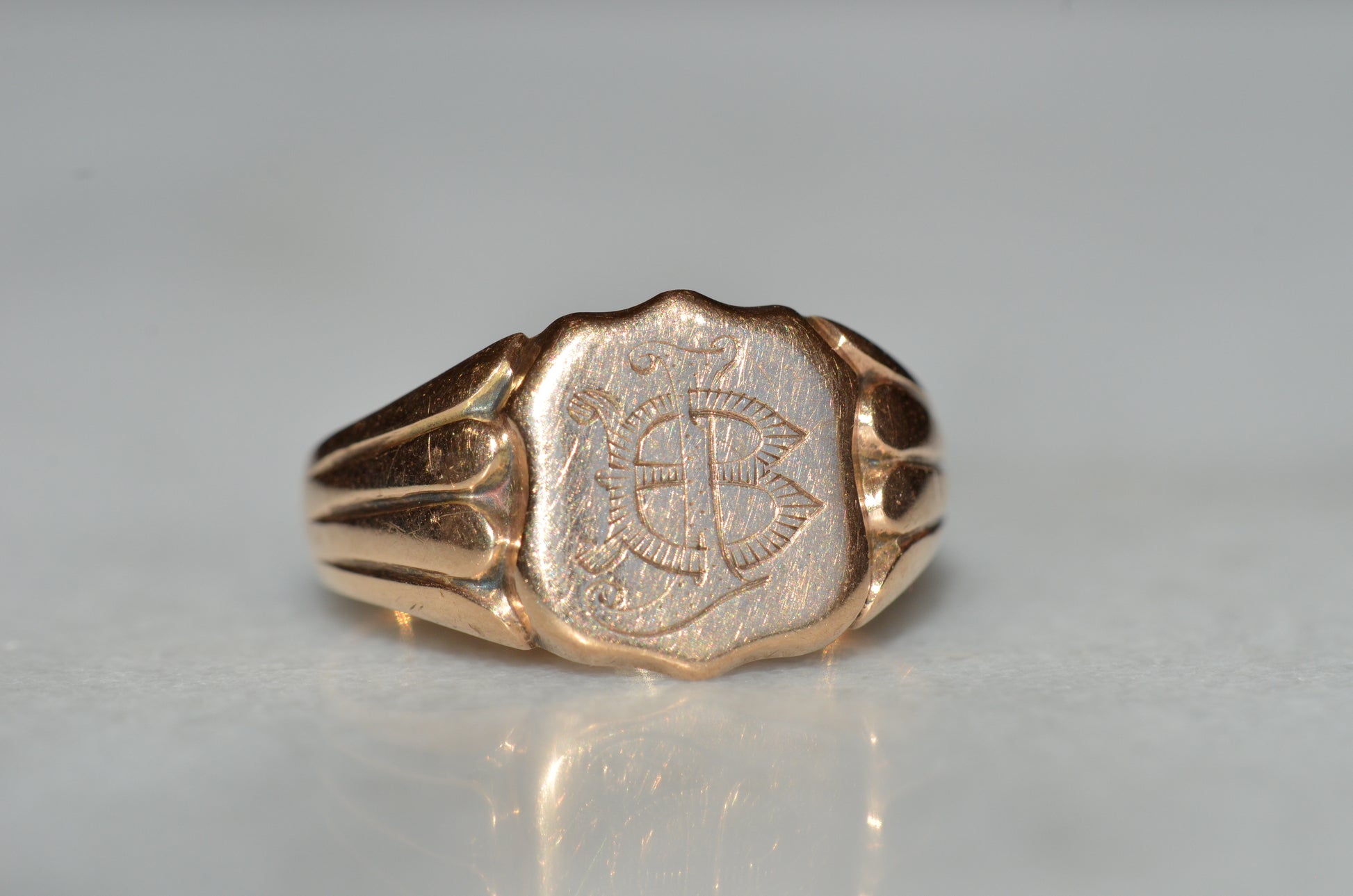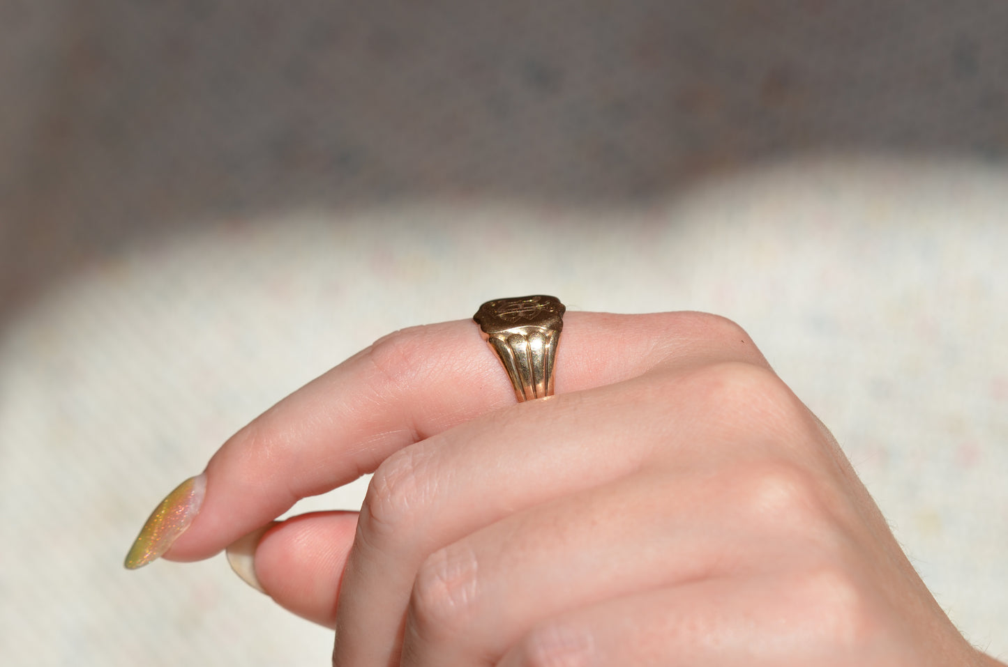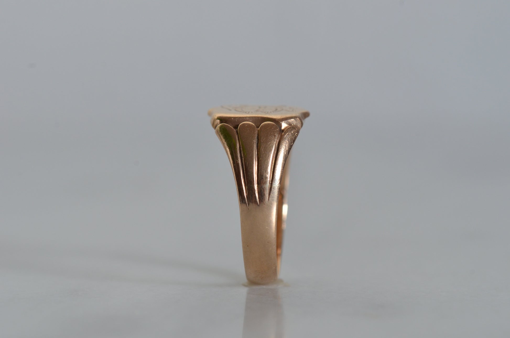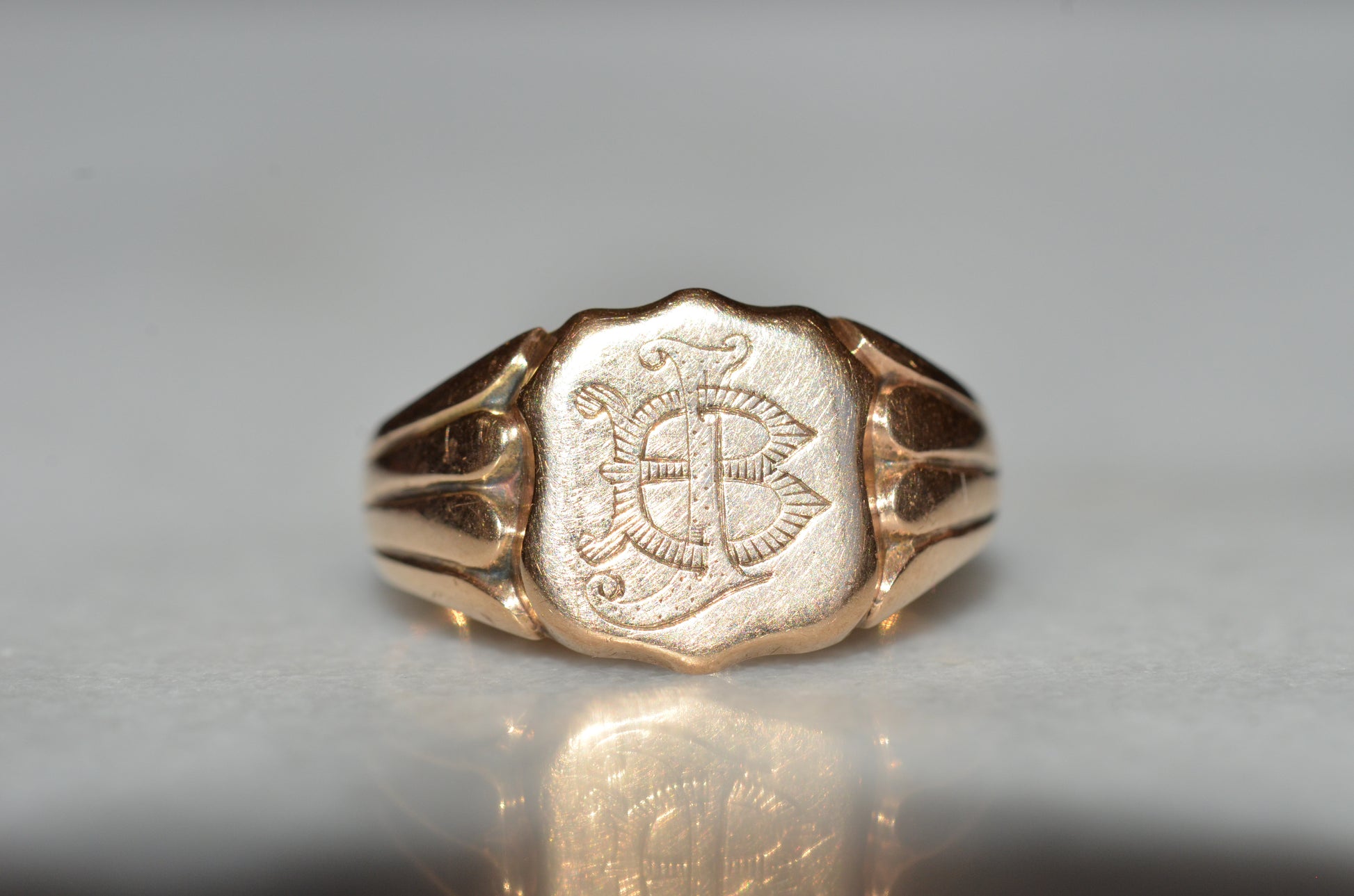 A gorgeous Edwardian signet in a style that feels timeless despite nods to the era, with lovely flared shoulders and shaded initials in the monogram. There's such a special feeling in finding a preloved piece that already has letters on it that are meaningful to you, that we play pretty fast and loose - maybe it's the first or last initials of you and your lover, or your own in another order, or the initials of a loved one: no matter what, it will feel sentimental every time it catches your eye.