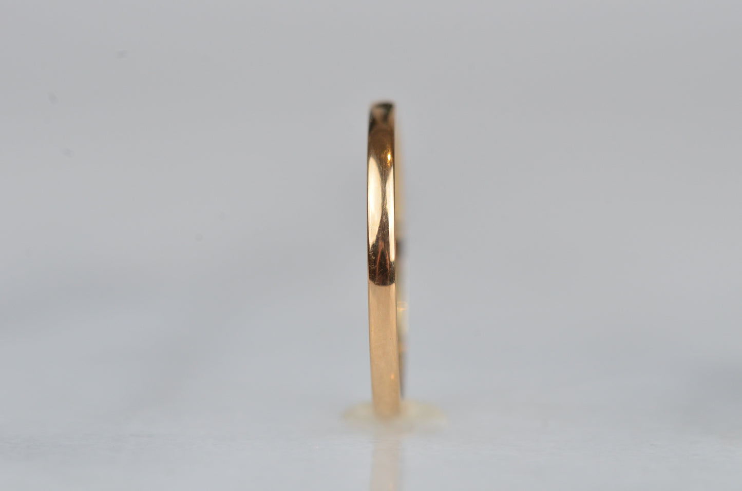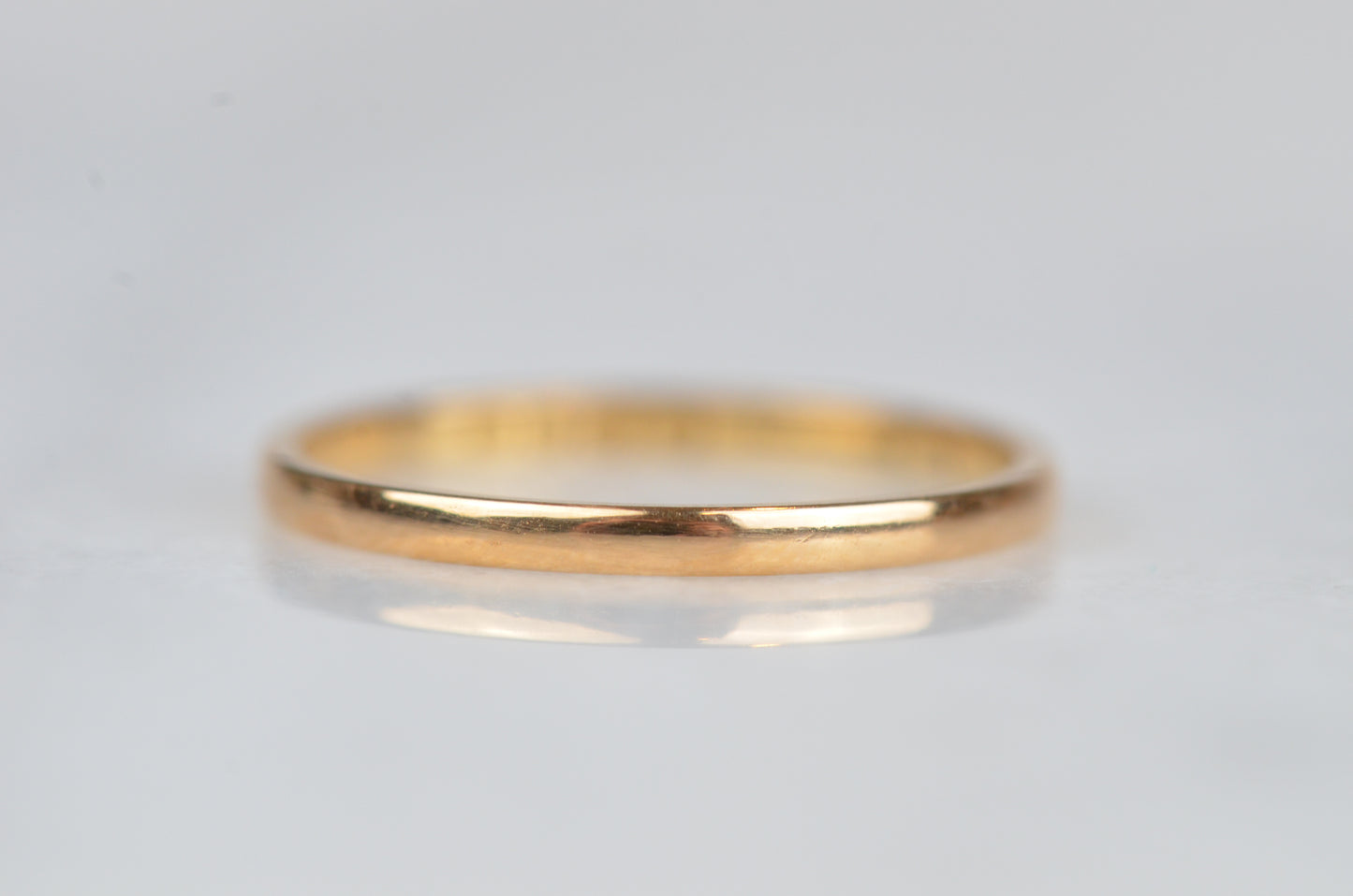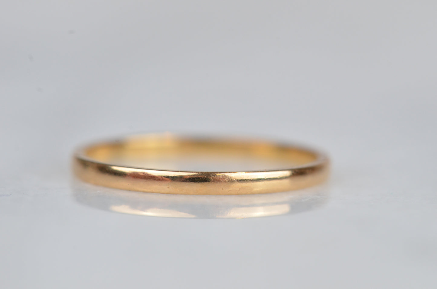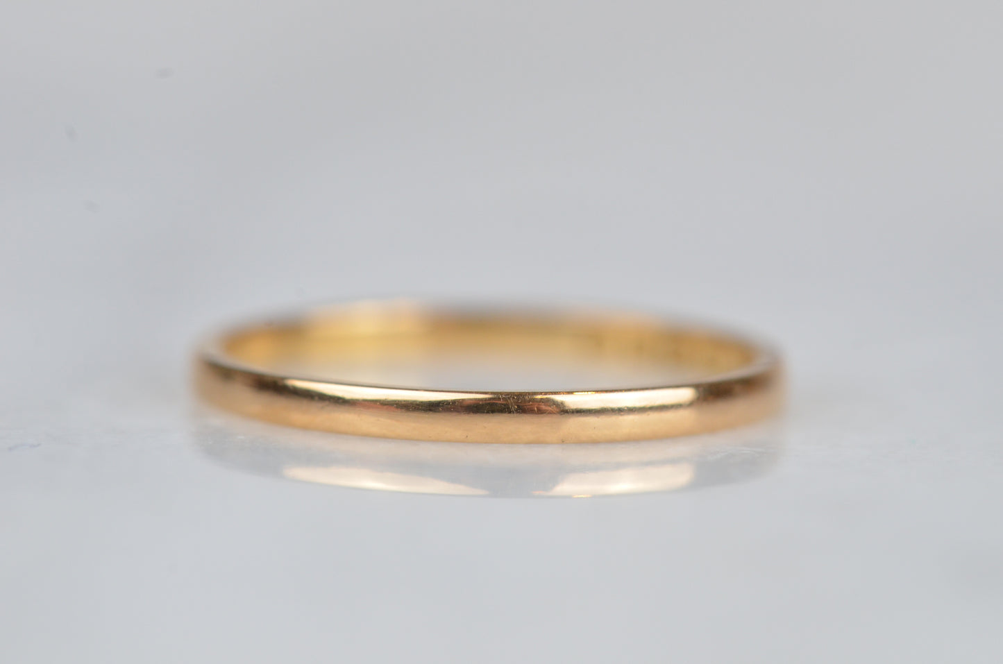 Utterly classic and timeless, this slim high karat band is an ideal minimalist look, stacker, or wedding band. A soft patina has built up over the years, but the band maintains a bright, shining finish. Crisp edges are met with a just slightly curved top surface, allowing this ring to pair with soft or geometric rings alike.
