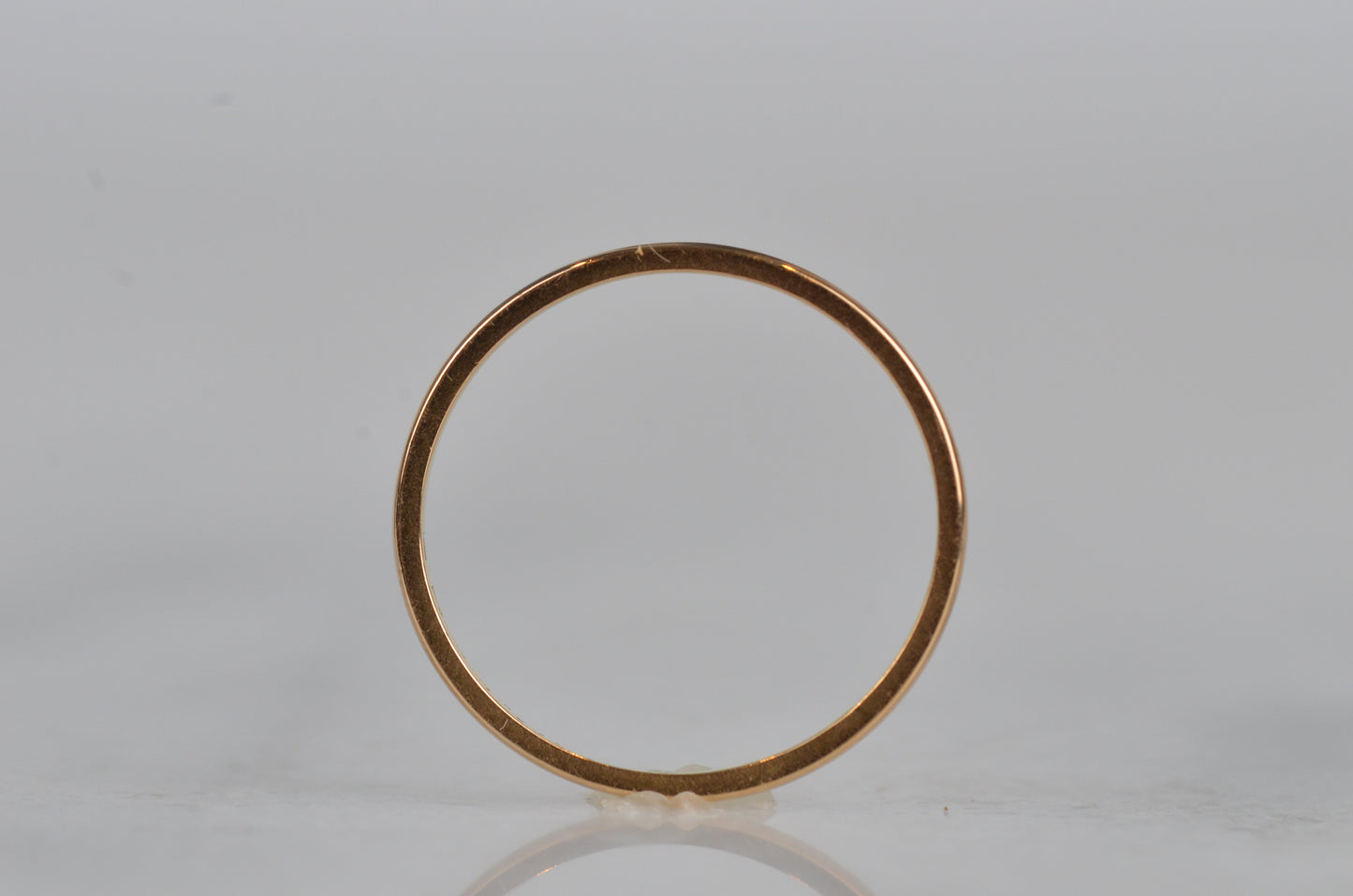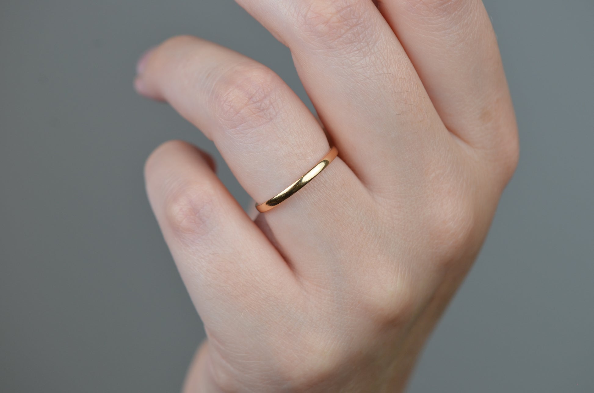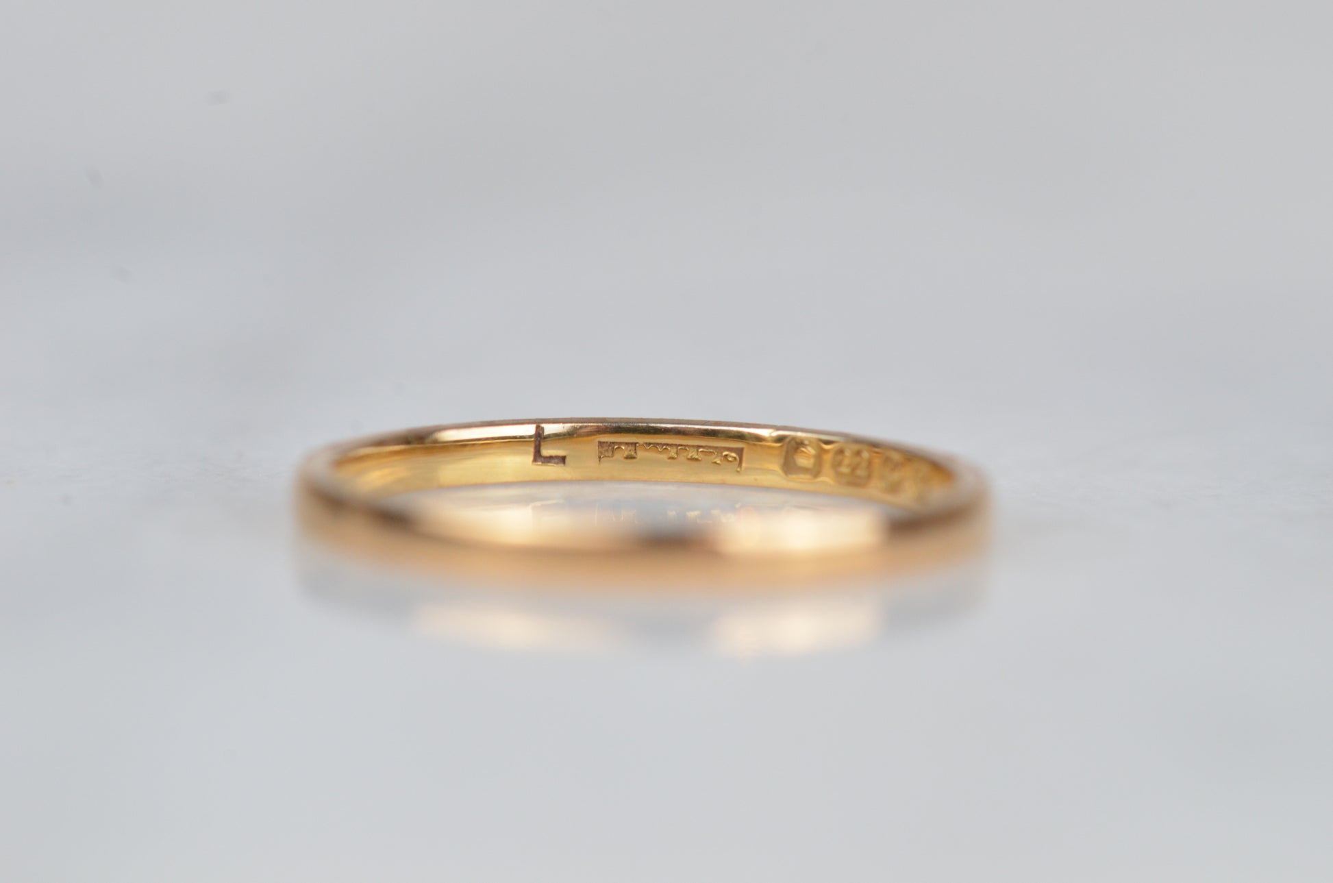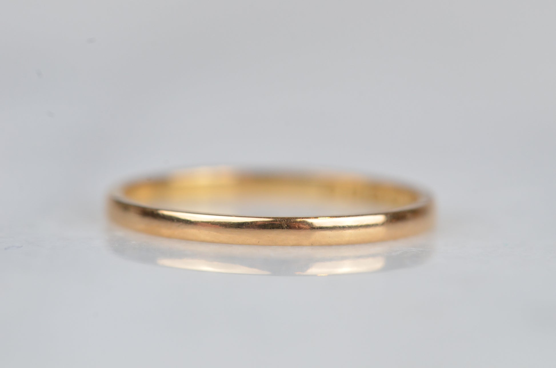 Utterly classic and timeless, this slim high karat band is an ideal minimalist look, stacker, or wedding band. A soft patina has built up over the years, but the band maintains a bright, shining finish. Crisp edges are met with a just slightly curved top surface, allowing this ring to pair with soft or geometric rings alike.