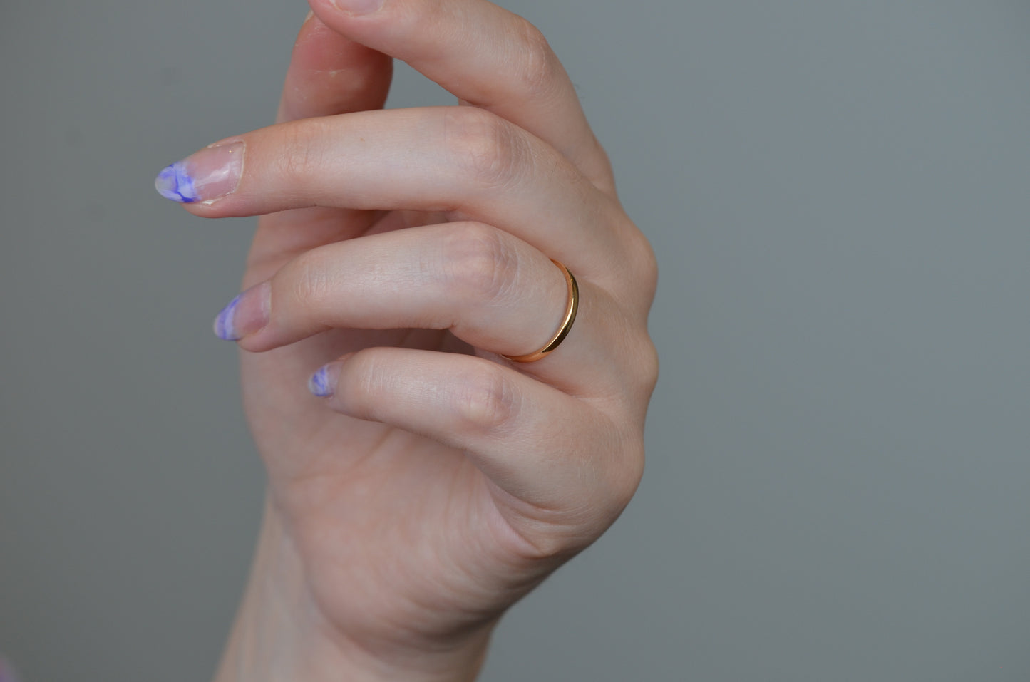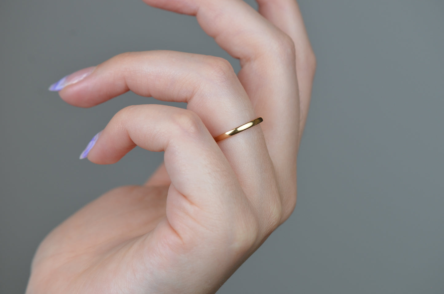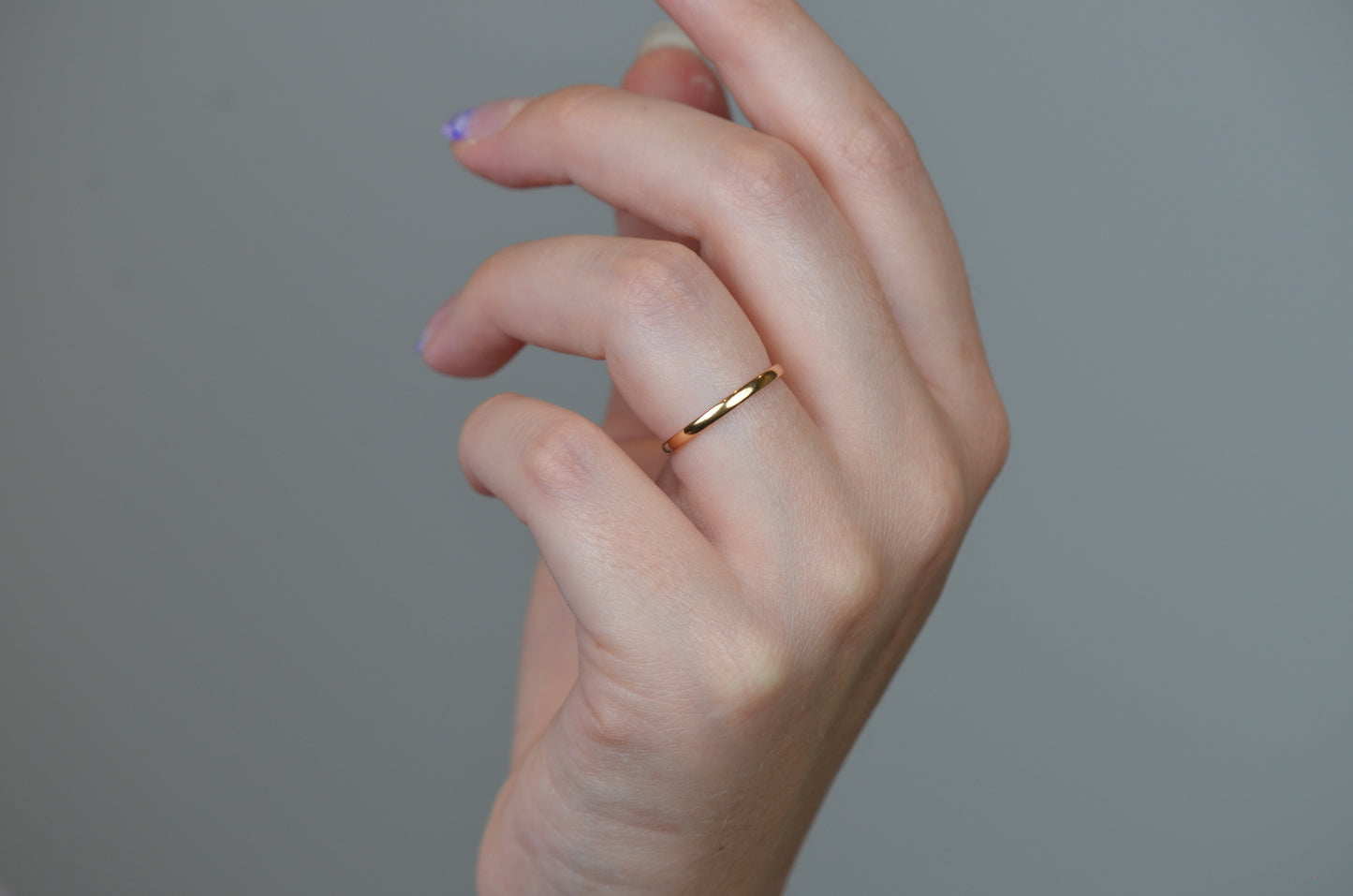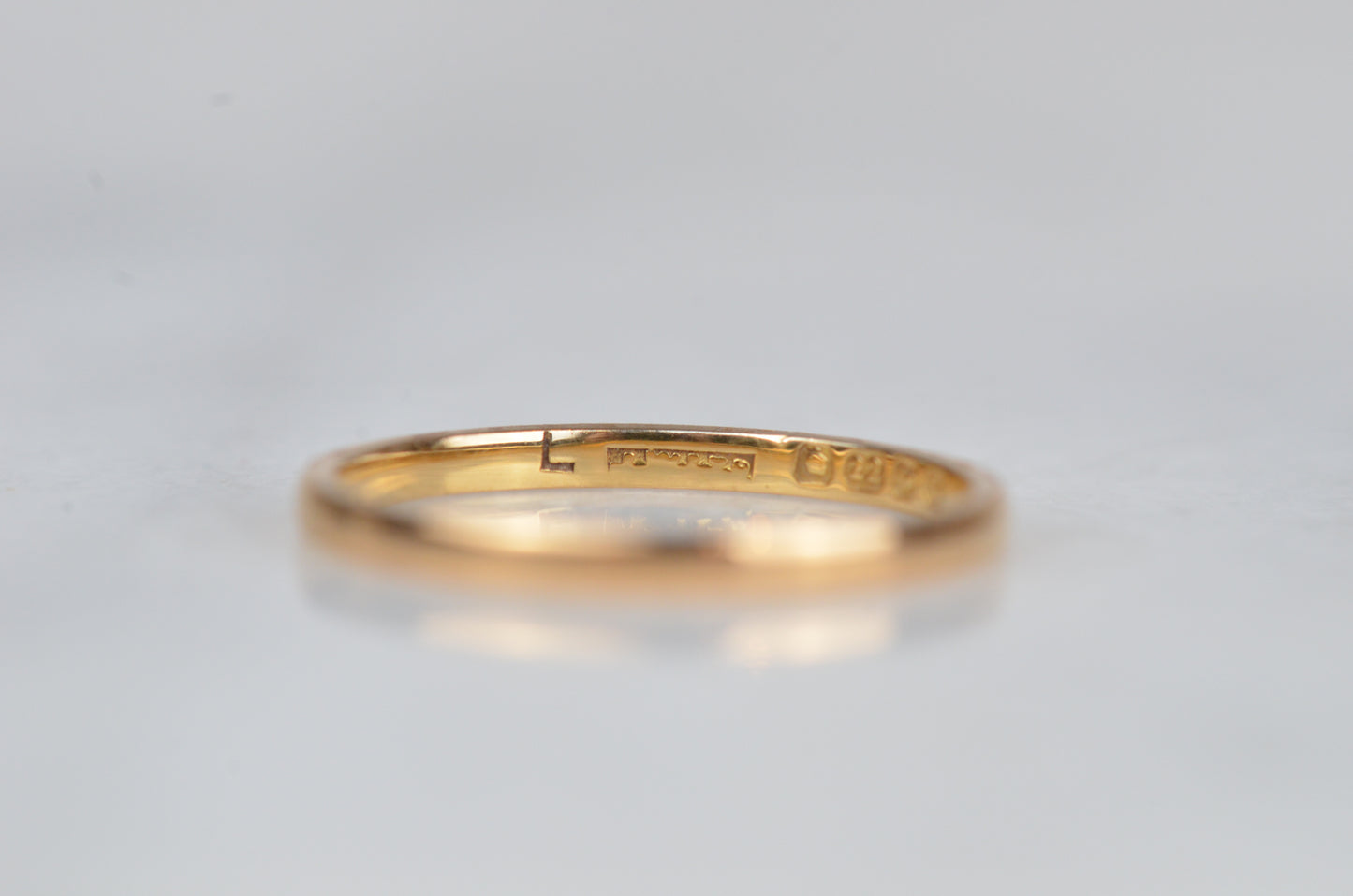 Utterly classic and timeless, this slim high karat band is an ideal minimalist look, stacker, or wedding band. A soft patina has built up over the years, but the band maintains a bright, shining finish. Crisp edges are met with a just slightly curved top surface, allowing this ring to pair with soft or geometric rings alike.