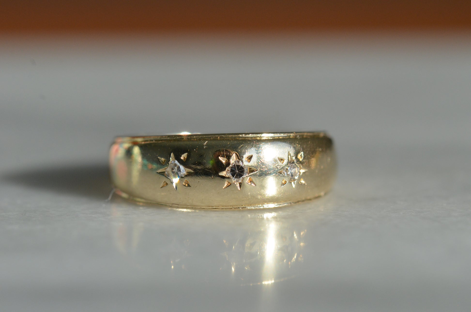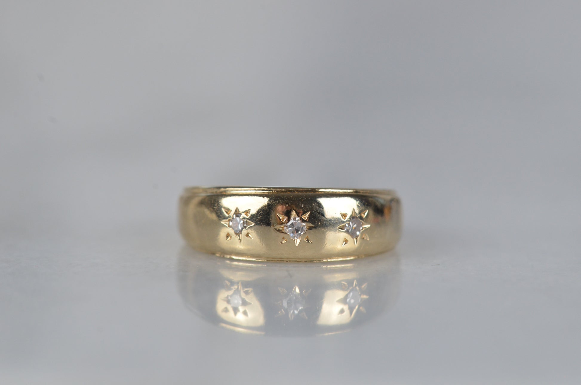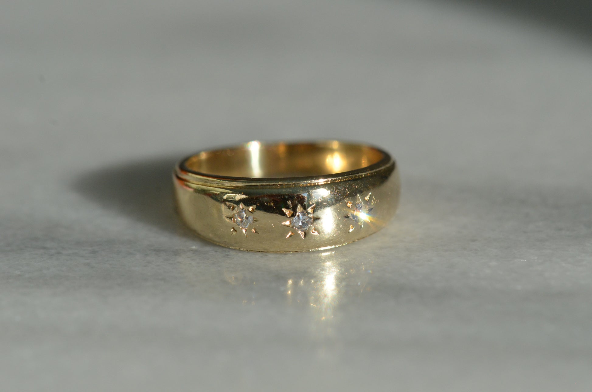 A classic Victorian-inspired piece, this style is among our most popular finds: three crisp and bright diamonds set flush into a broad band of gold, enhanced by the rays engraved into a star setting. Low rise with clean edges, this ring is ultra wearable and comfortable, and easy to pair with other pieces or wear alone. In a petite size, it's an ideal pinky ring for any ring lover.