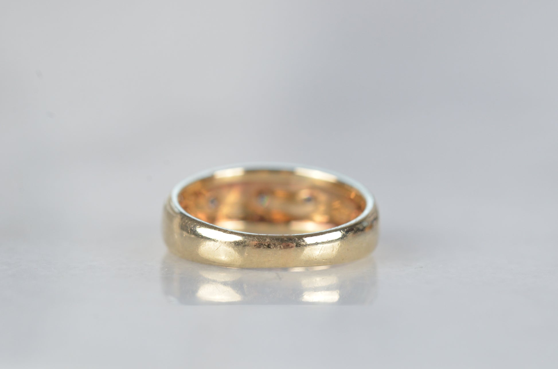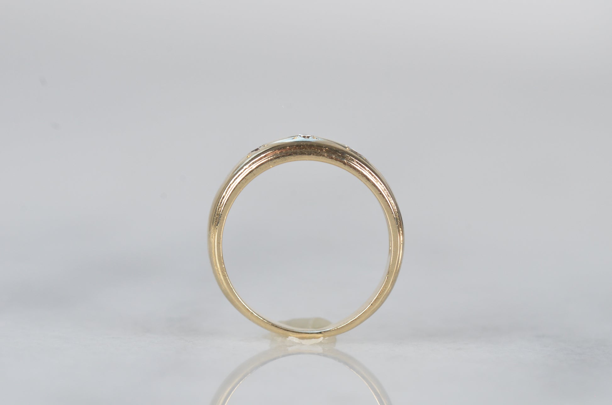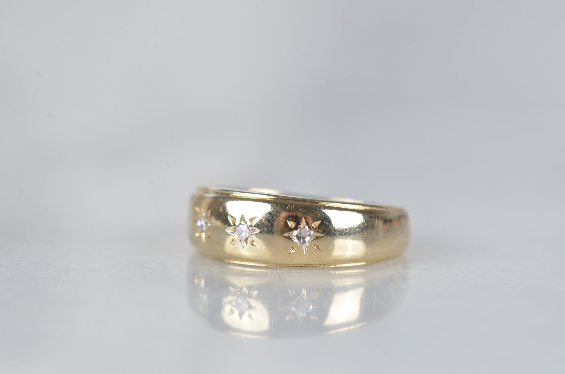 A classic Victorian-inspired piece, this style is among our most popular finds: three crisp and bright diamonds set flush into a broad band of gold, enhanced by the rays engraved into a star setting. Low rise with clean edges, this ring is ultra wearable and comfortable, and easy to pair with other pieces or wear alone. In a petite size, it's an ideal pinky ring for any ring lover.