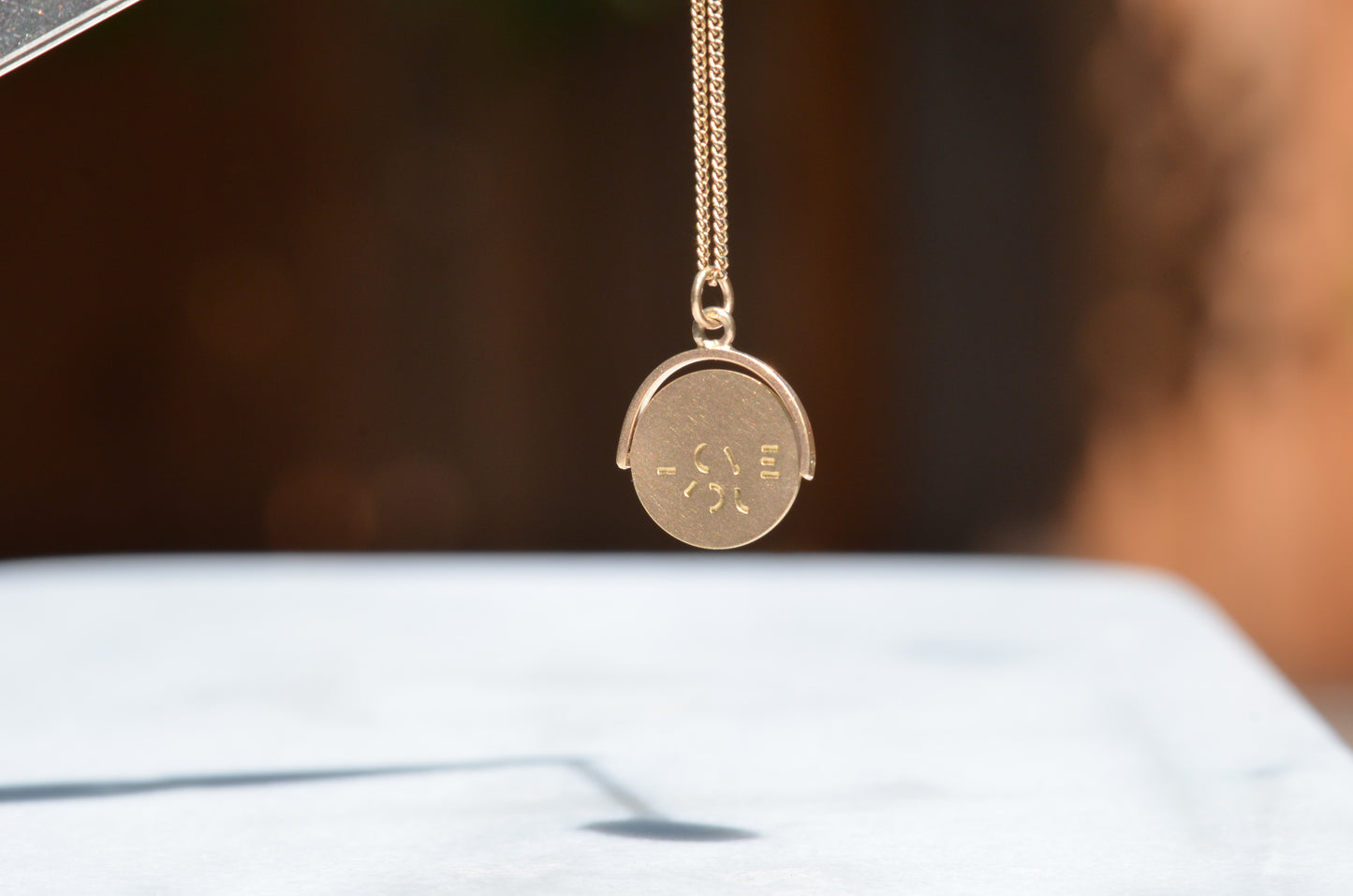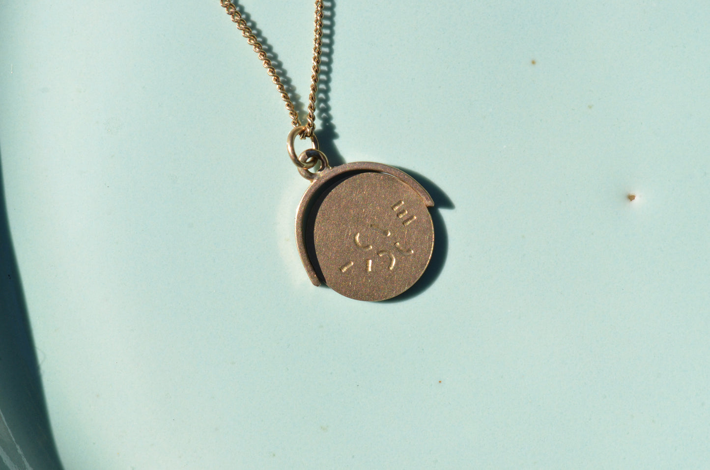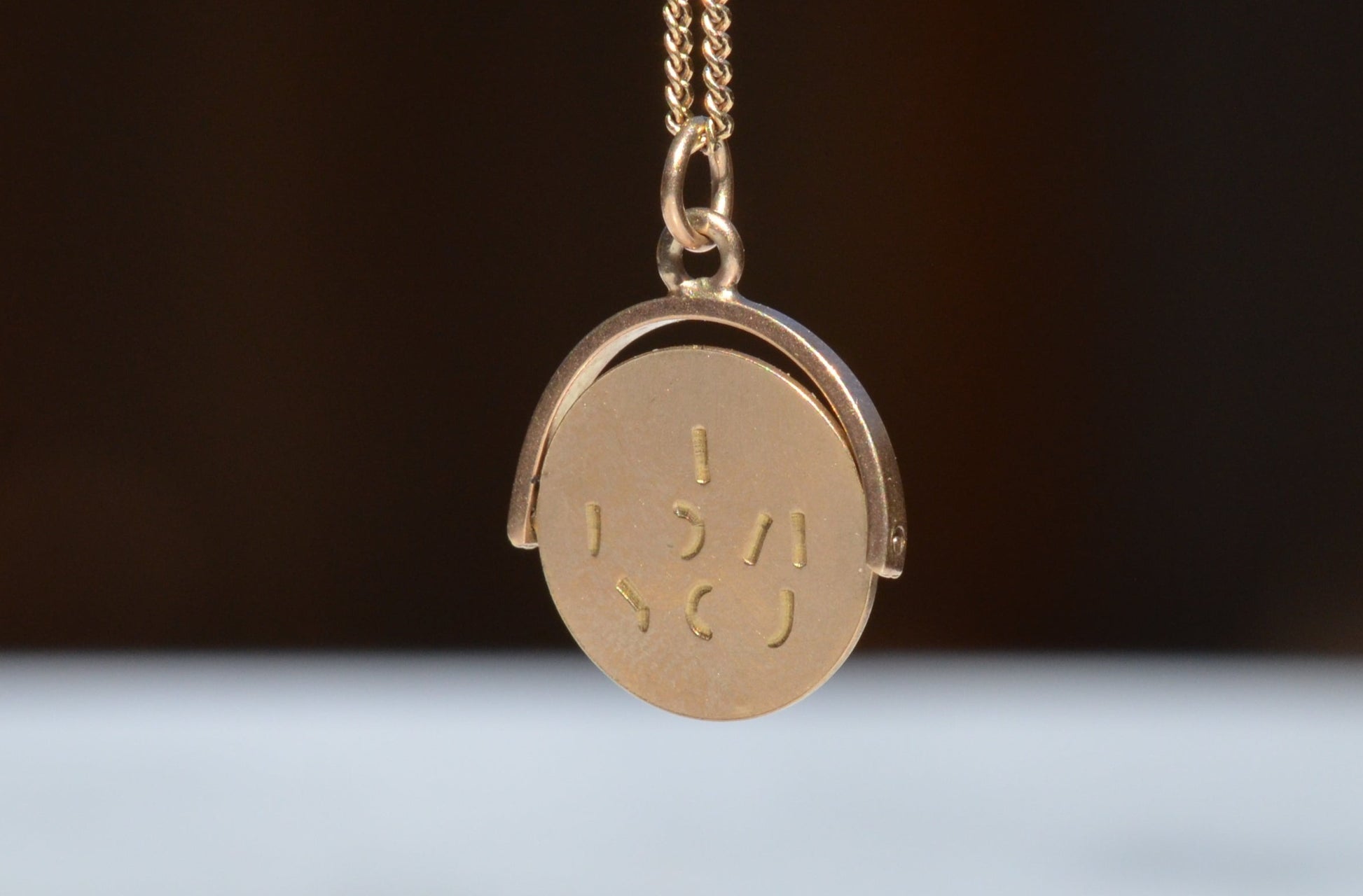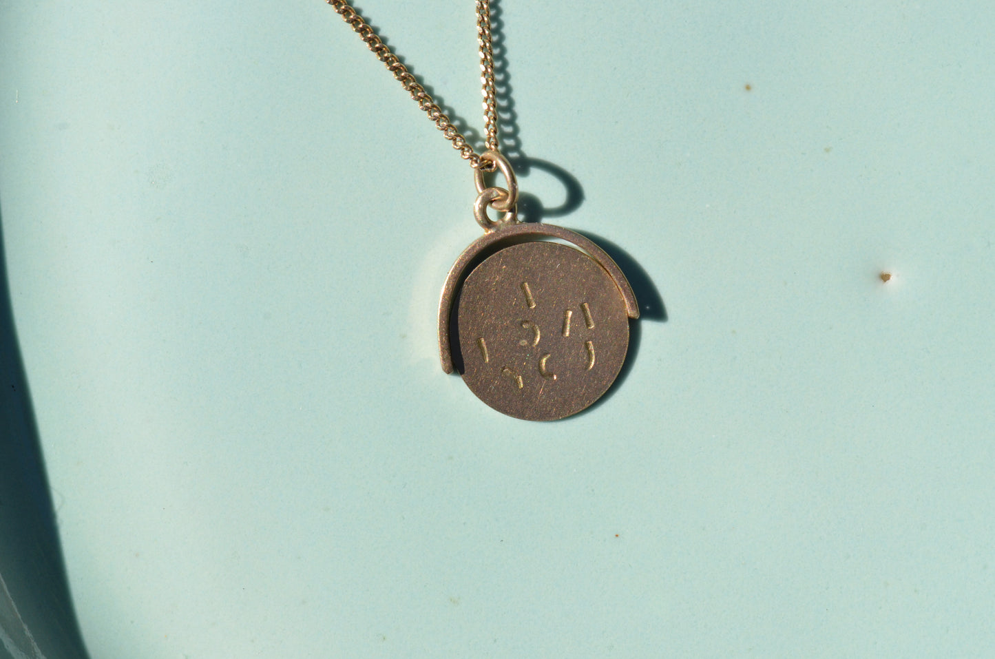 Straight from the midcentury charm craze, these delightful pieces can be added to your own charm bracelet or necklace, or worn alone on a chain to give them all the focus. Each side of the disc bears only a portion of each letter, creating a secret message that is only revealed when the disc is spun and in motion.