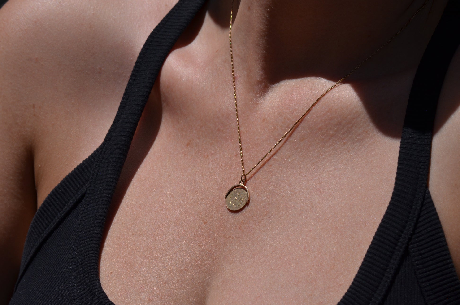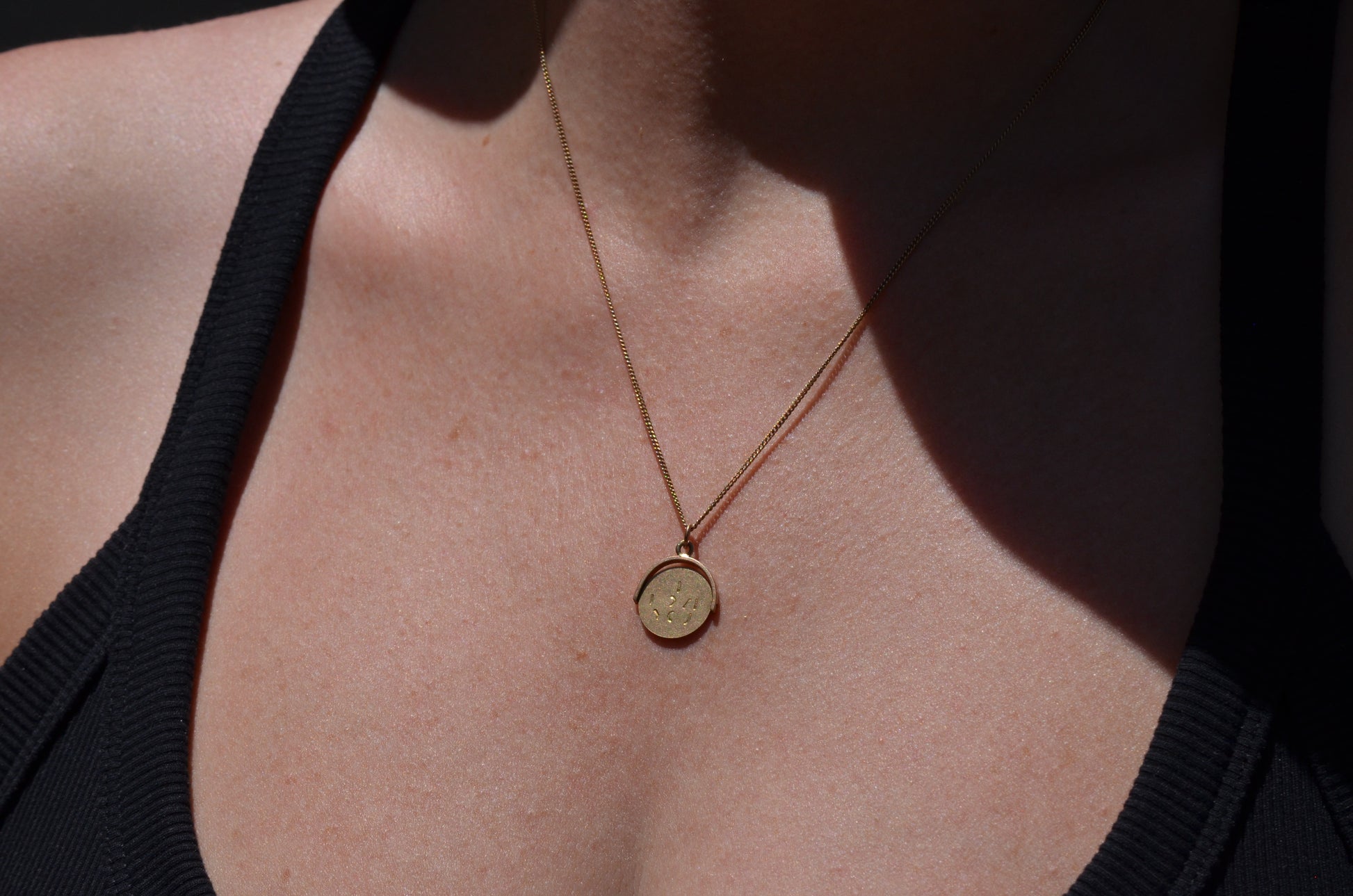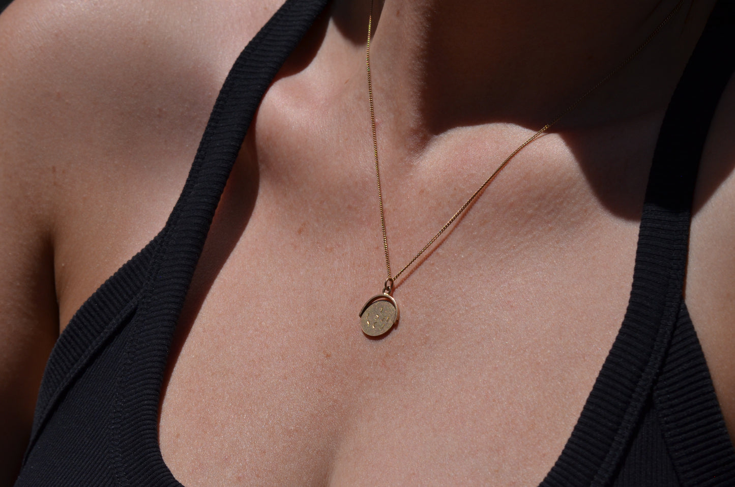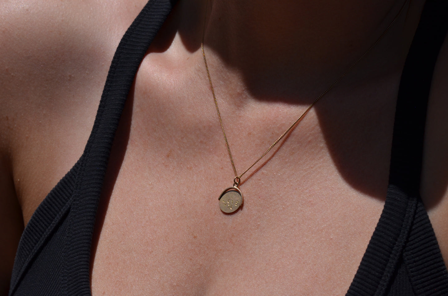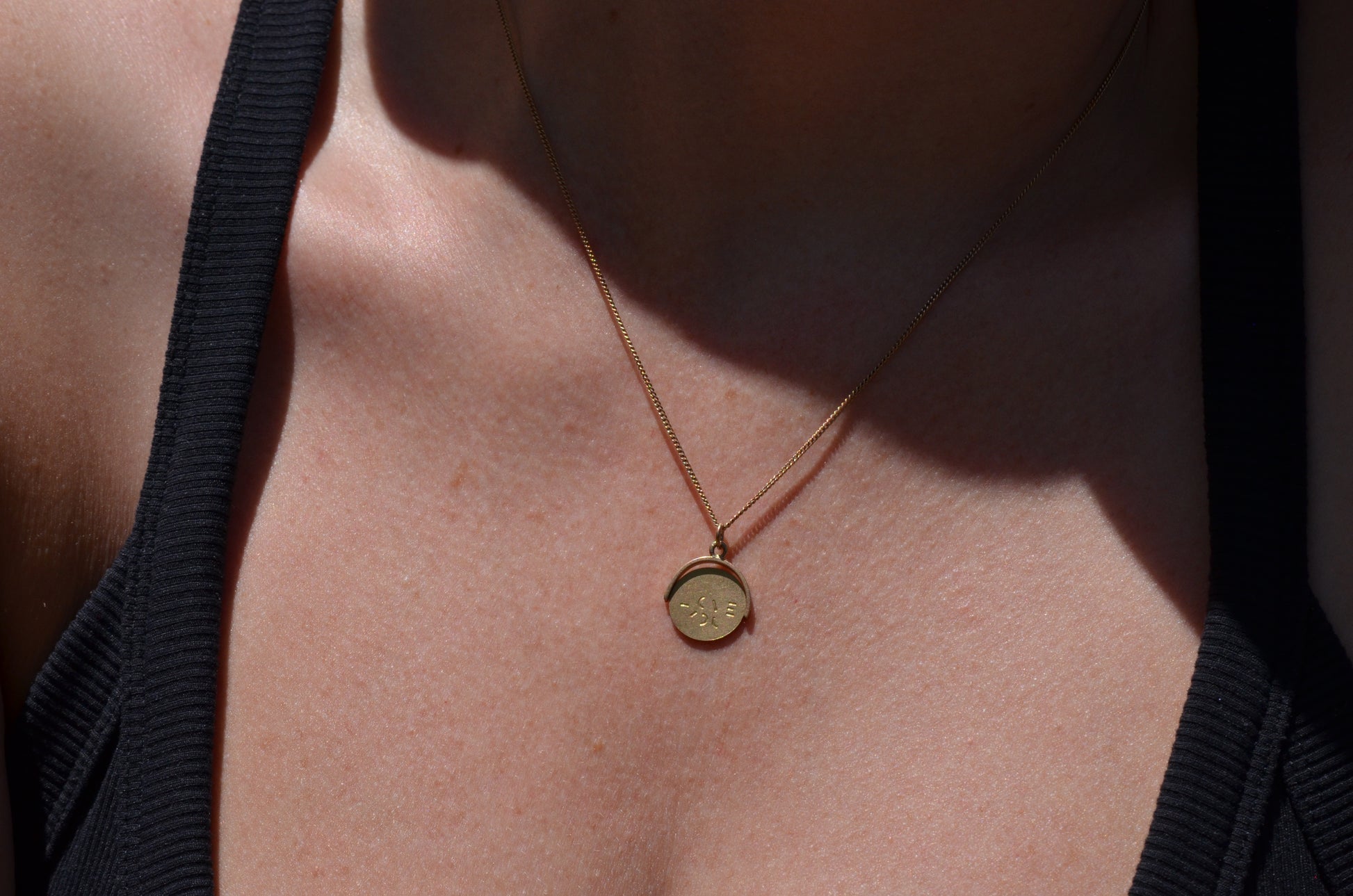 Straight from the midcentury charm craze, these delightful pieces can be added to your own charm bracelet or necklace, or worn alone on a chain to give them all the focus. Each side of the disc bears only a portion of each letter, creating a secret message that is only revealed when the disc is spun and in motion.