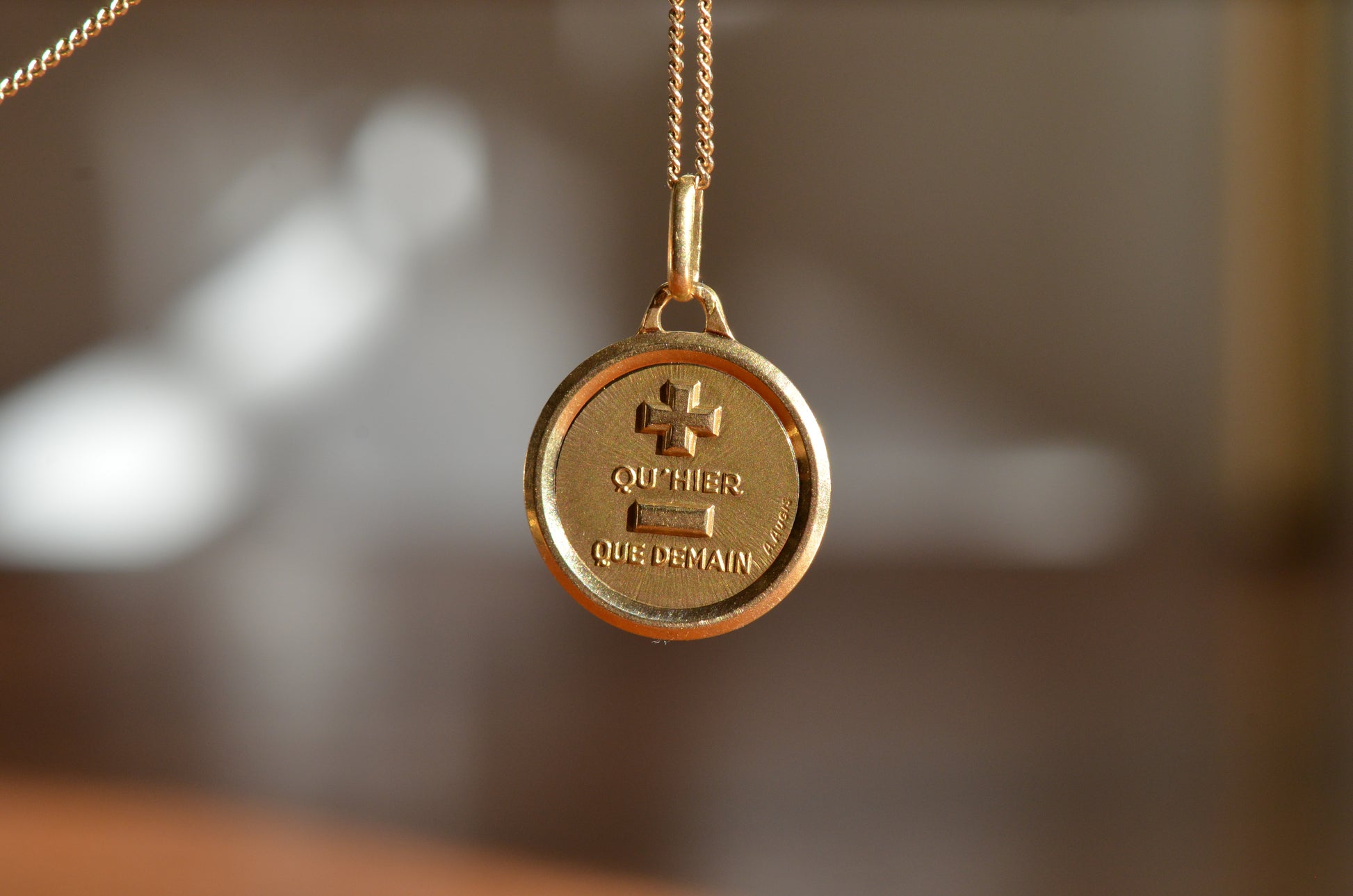 A beautiful vintage French love token, in a classic version perfectly sized for daily wear. Originally created by Alphonse Augis c.1907, and inspired by a letter poet Rosemonde Gérard wrote to her husband, the writer Edmond Rostand, the pendant features a rebus reading "+ qu'hier - que demain" for the lines,
