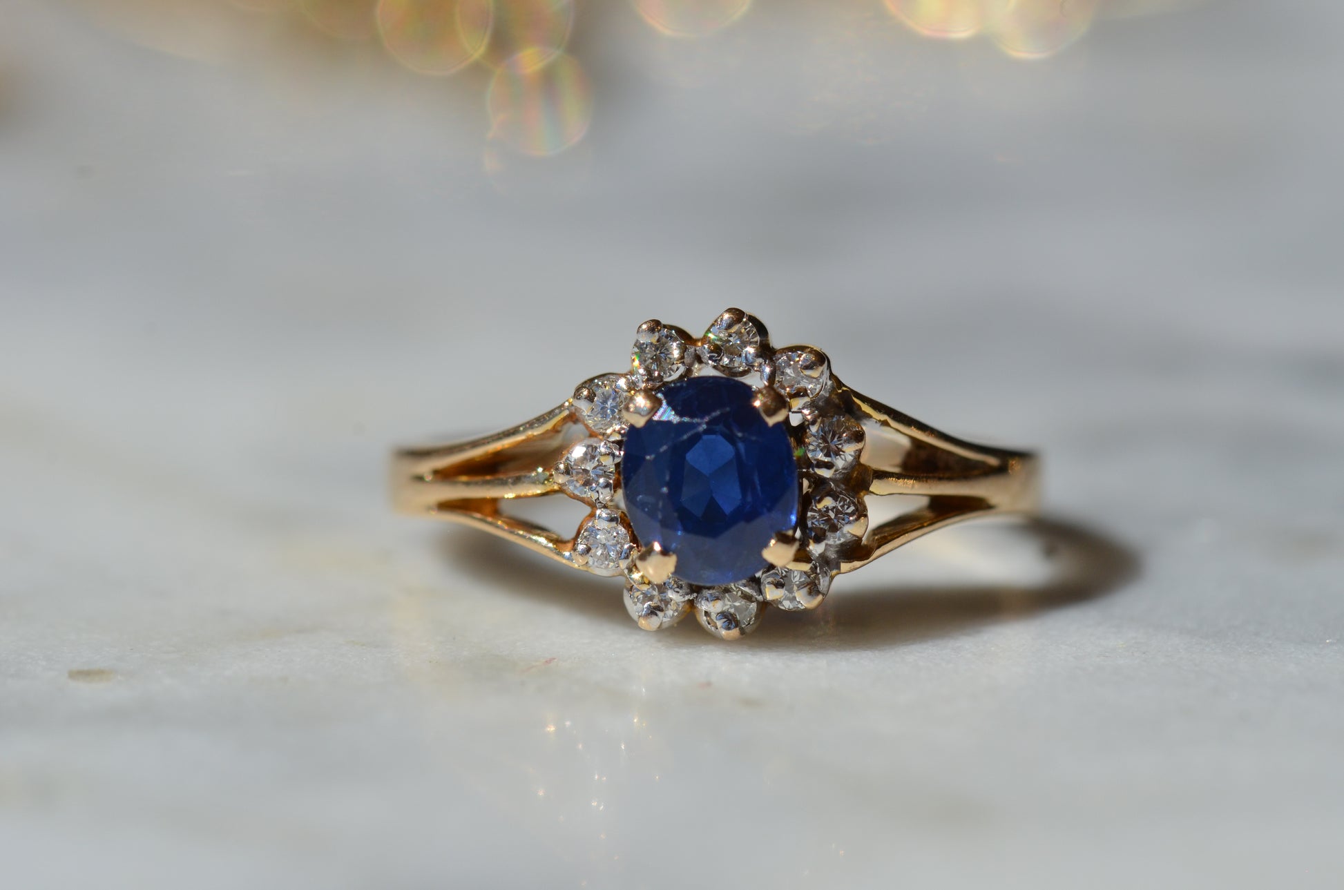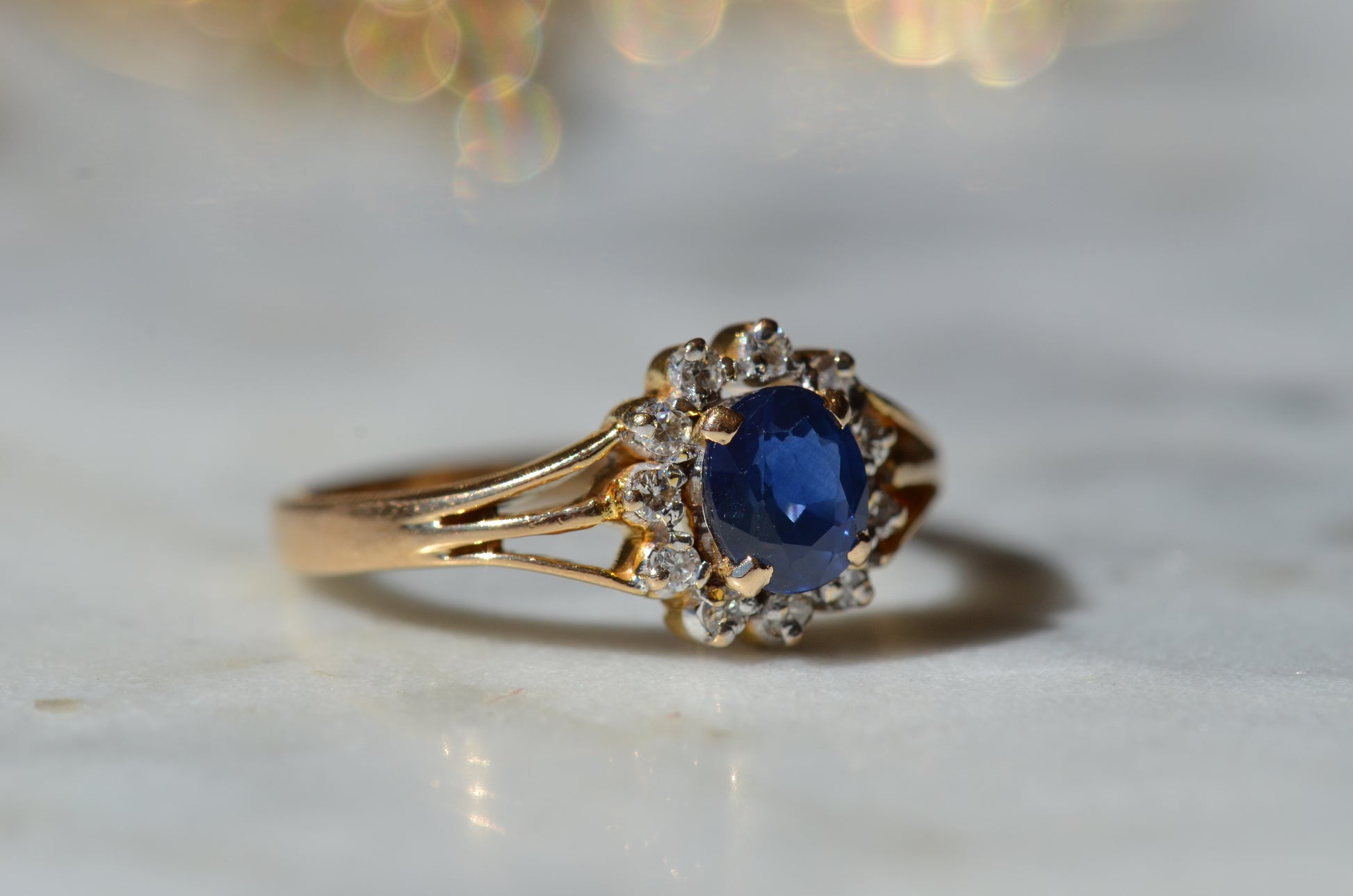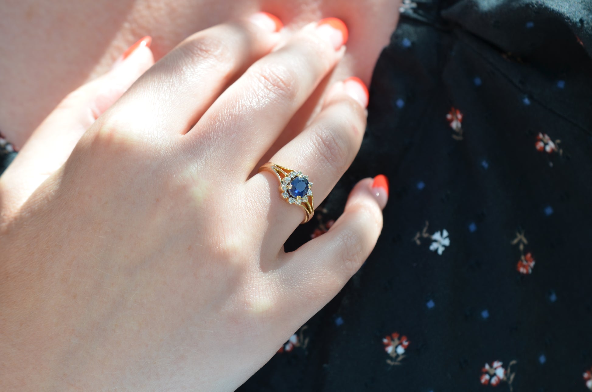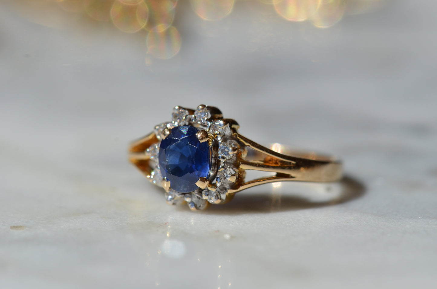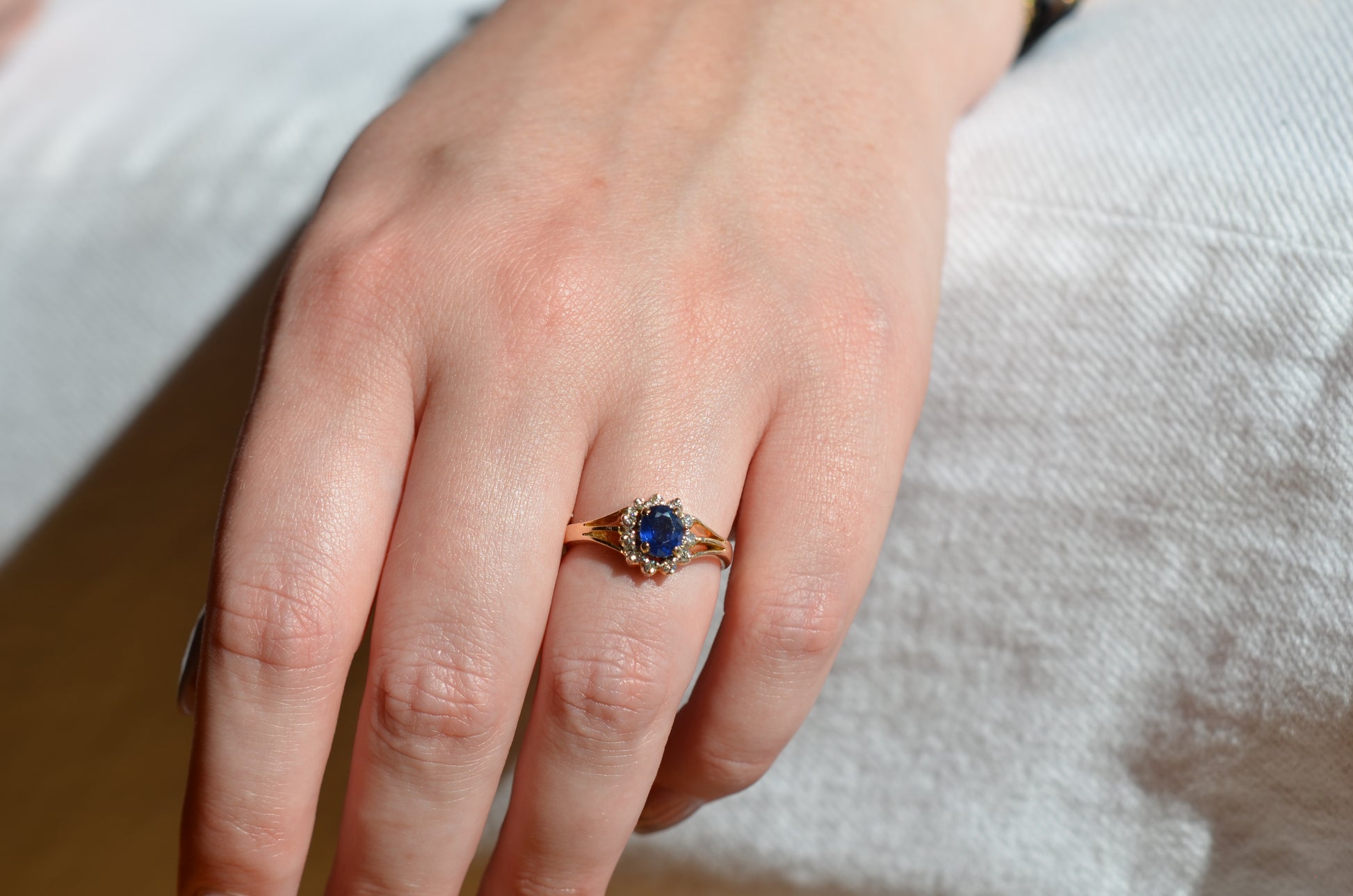 A dreamy vintage halo ring featuring a vivid blue sapphire nestled into a crown of twinkling diamonds - a ring fit for a princess and a style associated with one (or two) in particular. The mercurial sapphire at the centre of the ring vacillates between an deep-sea hue and an electric royal blue when the light strikes it just right. The diamonds wink from a setting that is lightly scalloped - a subtle bridge between a daisy and a halo - that is perfectly set off by elegant trifurcated shoulders.