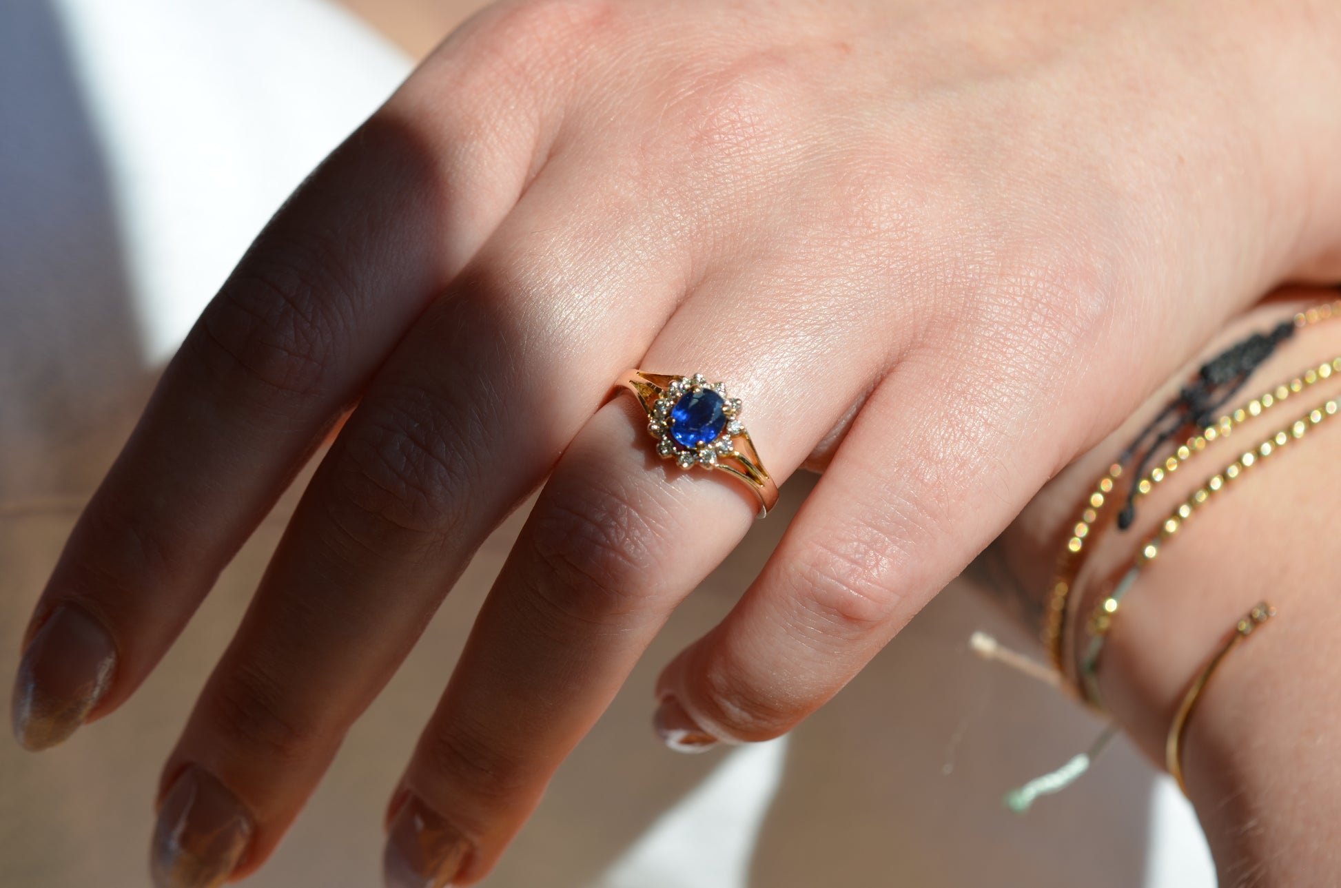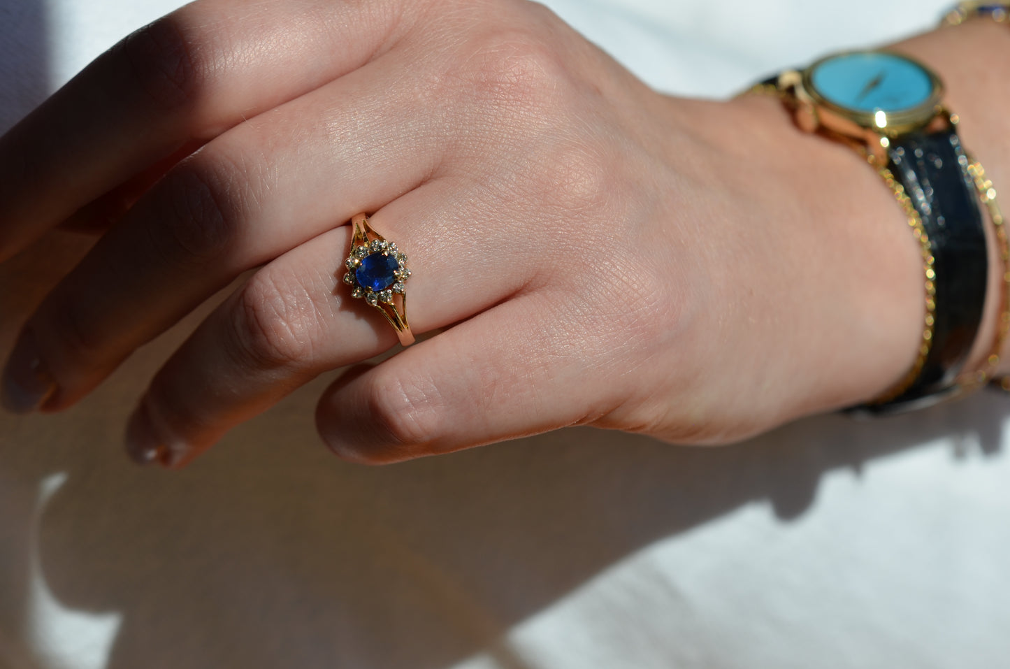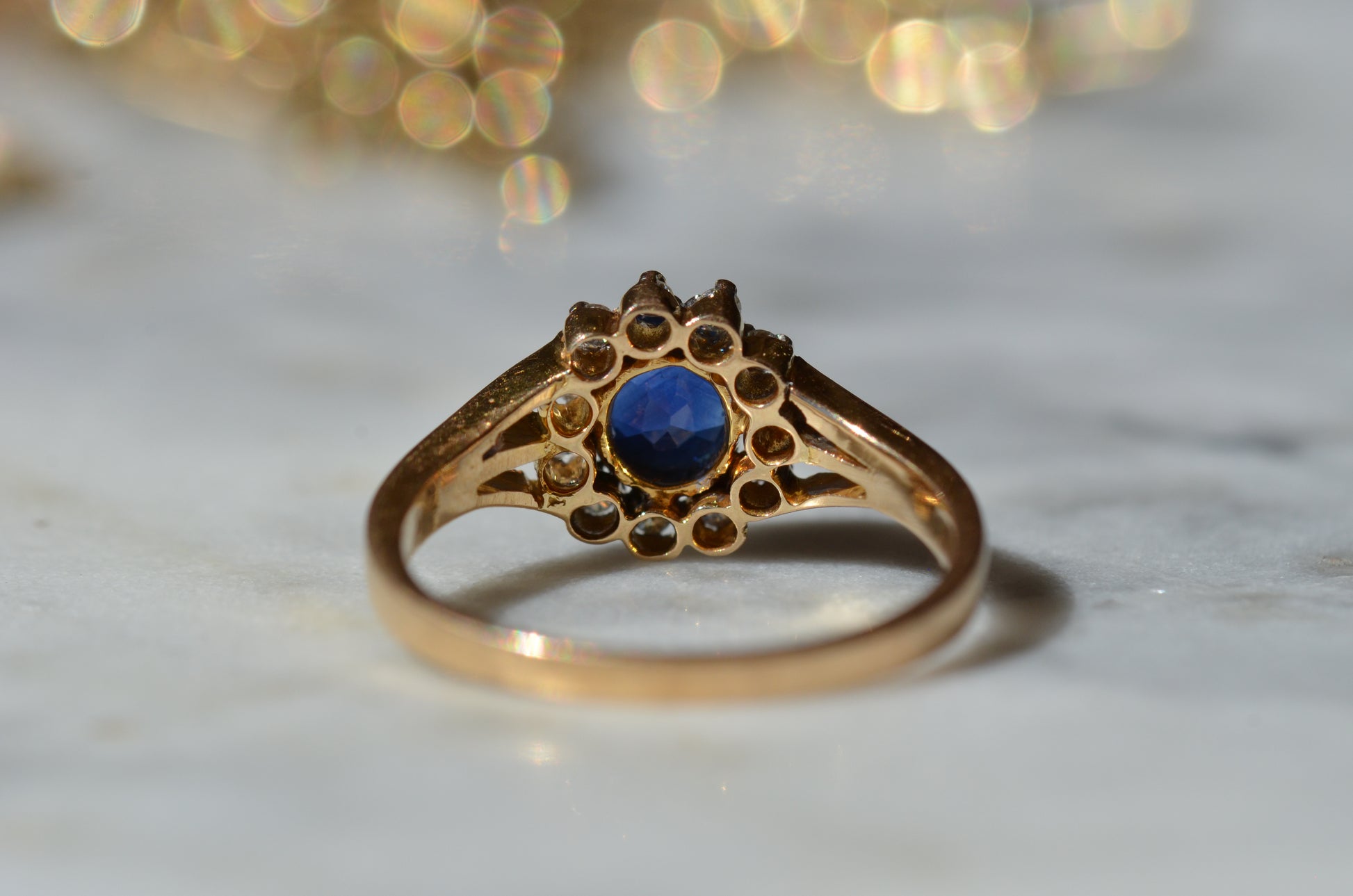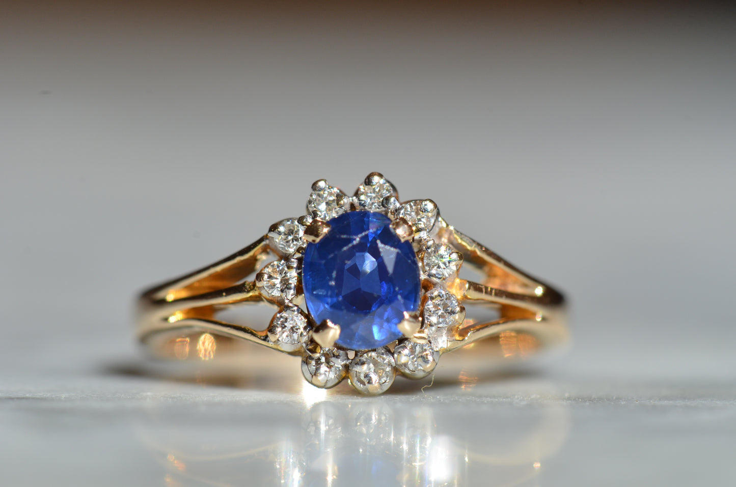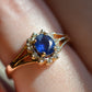 A dreamy vintage halo ring featuring a vivid blue sapphire nestled into a crown of twinkling diamonds - a ring fit for a princess and a style associated with one (or two) in particular. The mercurial sapphire at the centre of the ring vacillates between an deep-sea hue and an electric royal blue when the light strikes it just right. The diamonds wink from a setting that is lightly scalloped - a subtle bridge between a daisy and a halo - that is perfectly set off by elegant trifurcated shoulders.