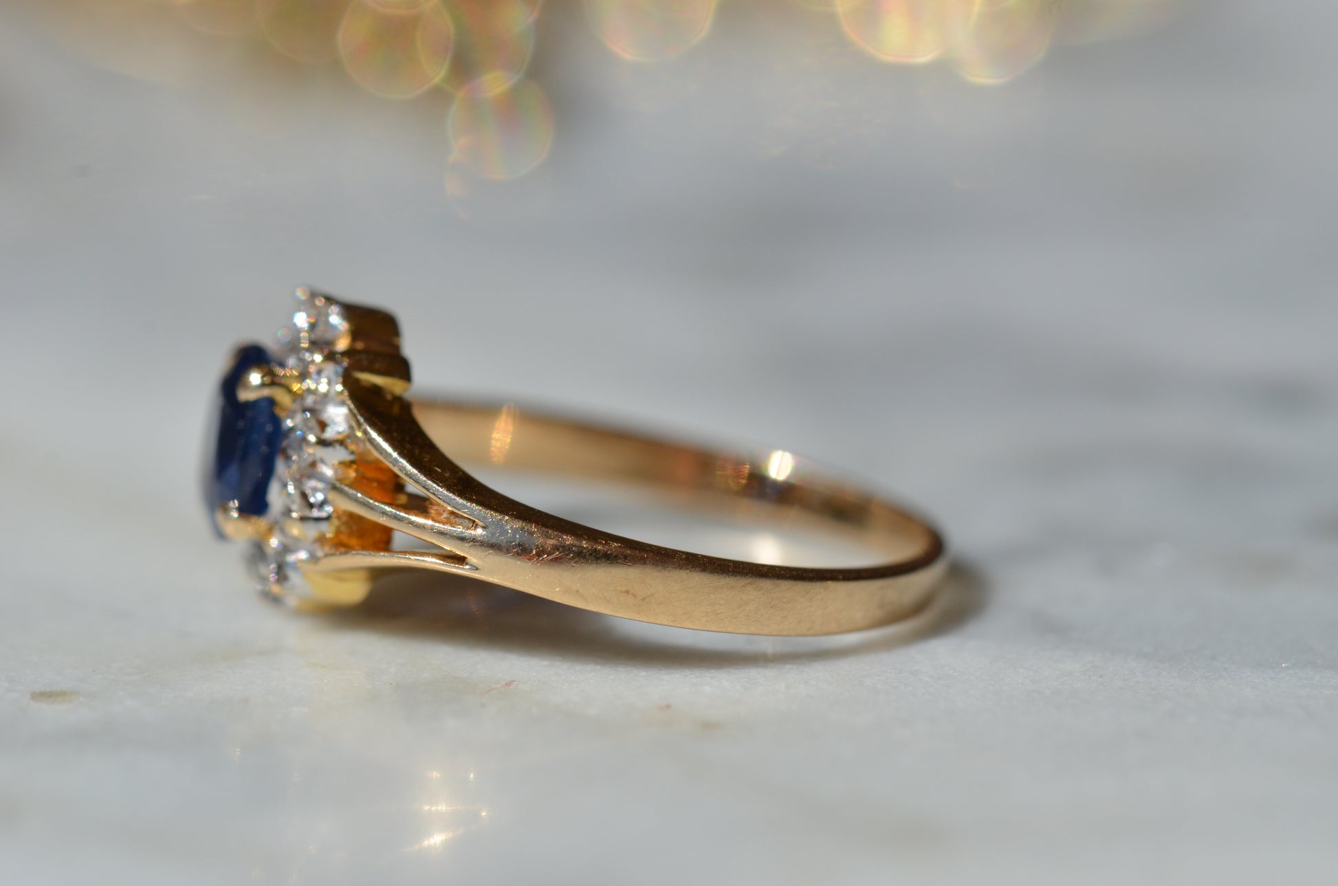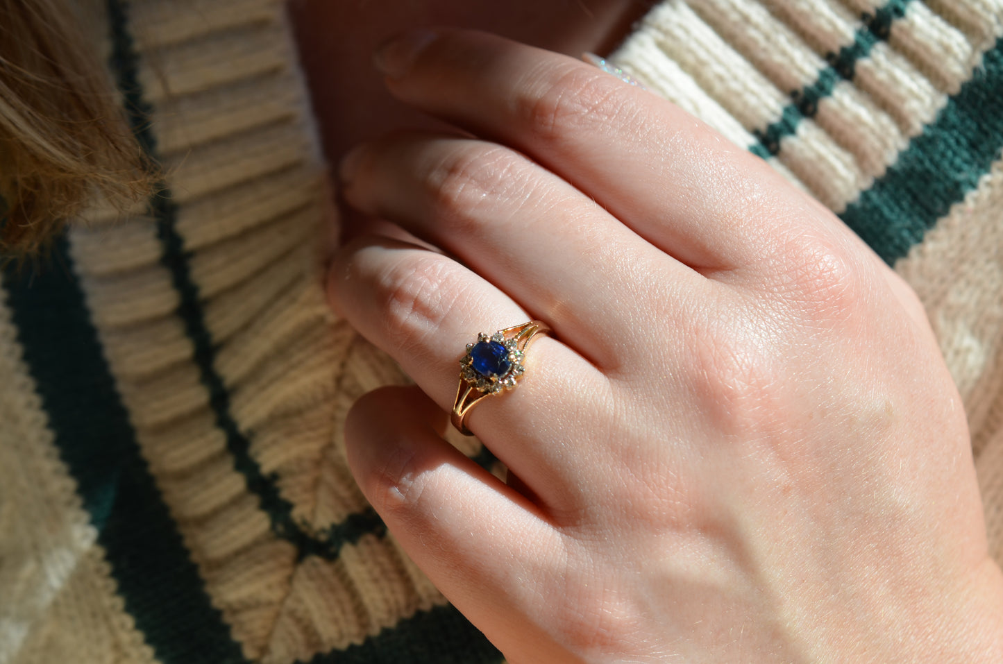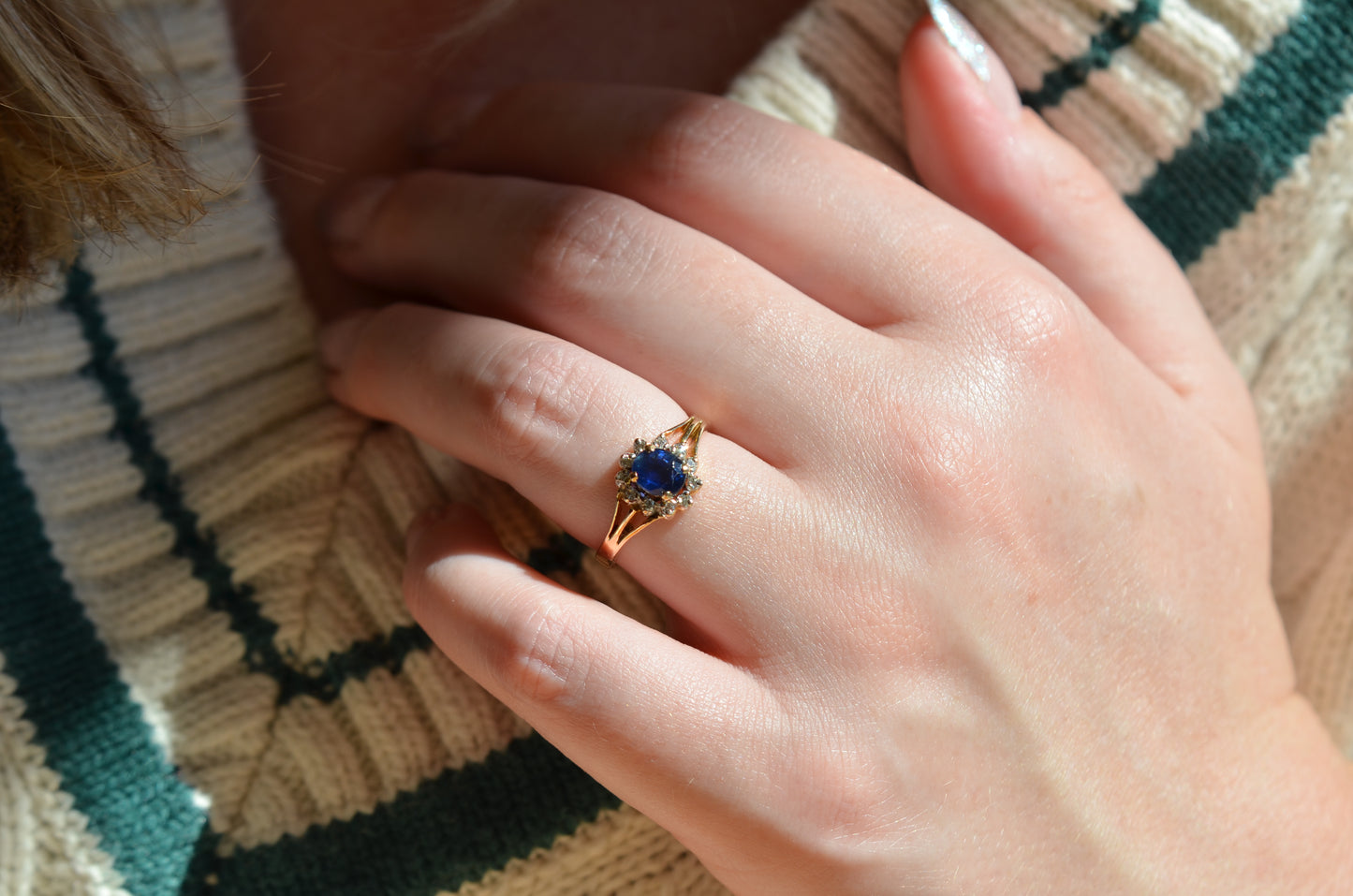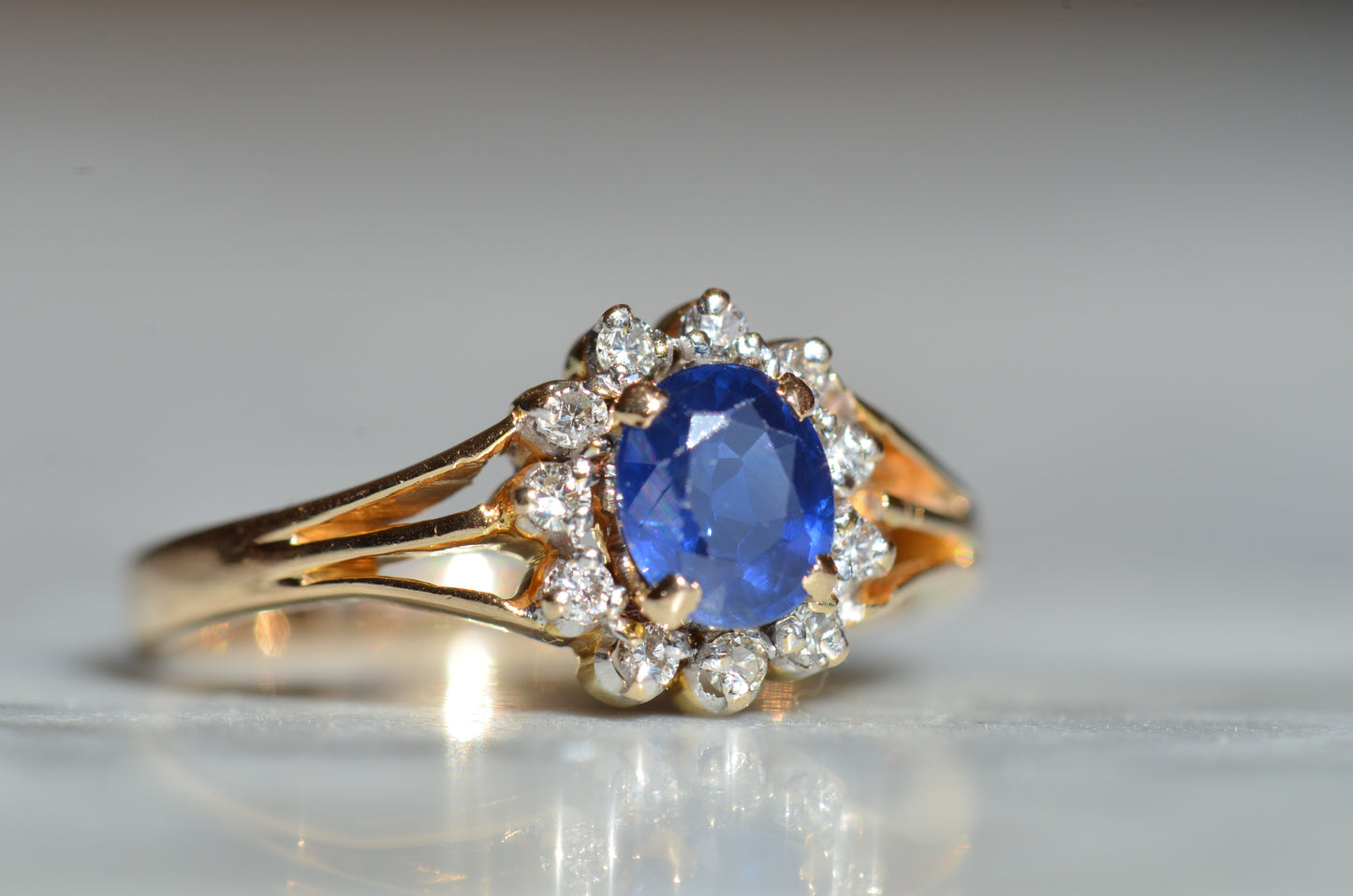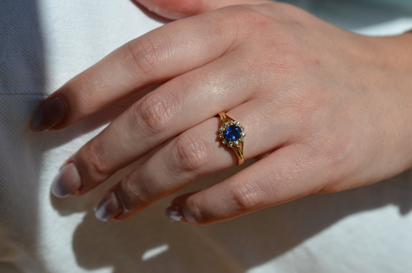 A dreamy vintage halo ring featuring a vivid blue sapphire nestled into a crown of twinkling diamonds - a ring fit for a princess and a style associated with one (or two) in particular. The mercurial sapphire at the centre of the ring vacillates between an deep-sea hue and an electric royal blue when the light strikes it just right. The diamonds wink from a setting that is lightly scalloped - a subtle bridge between a daisy and a halo - that is perfectly set off by elegant trifurcated shoulders.