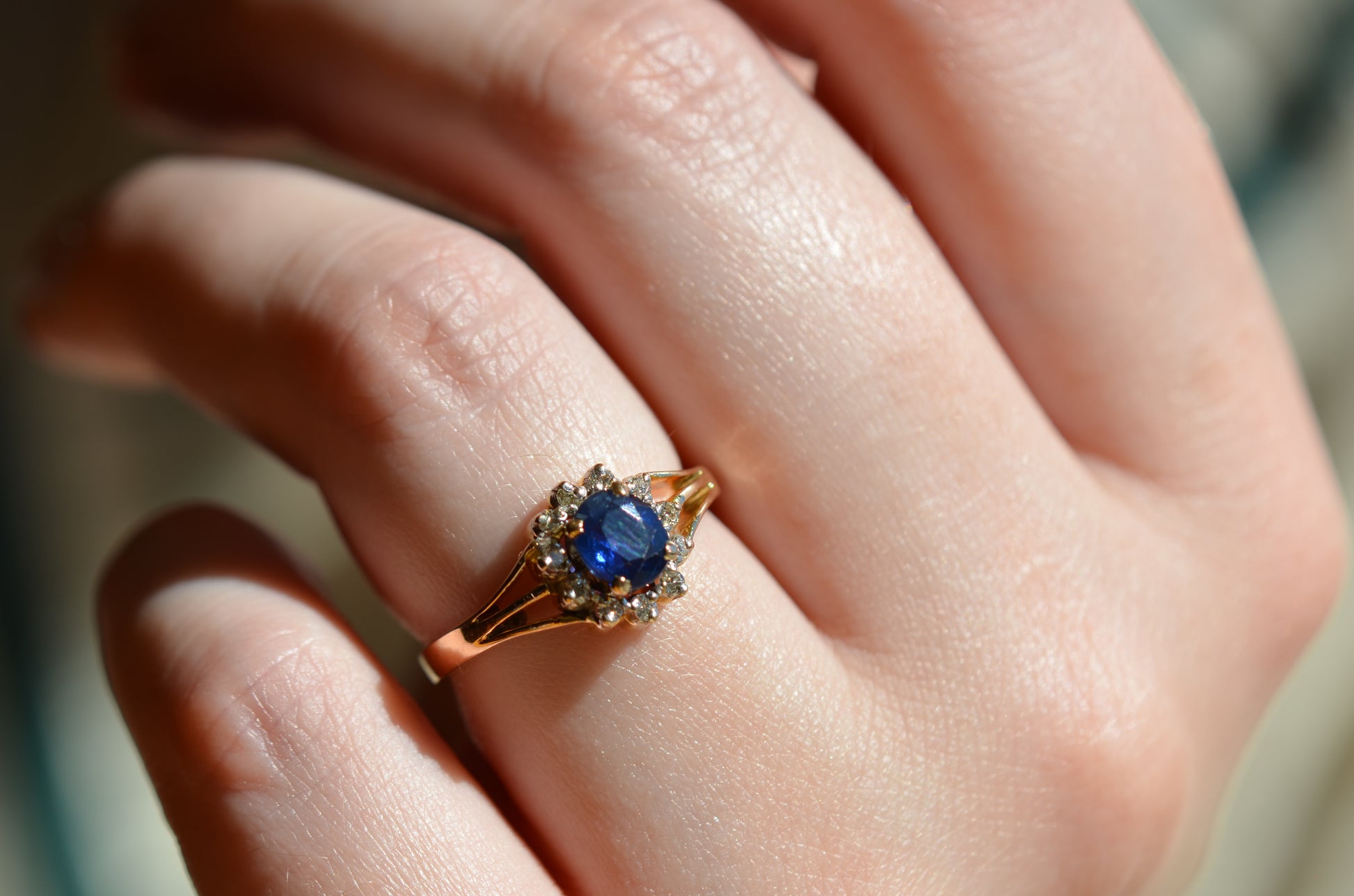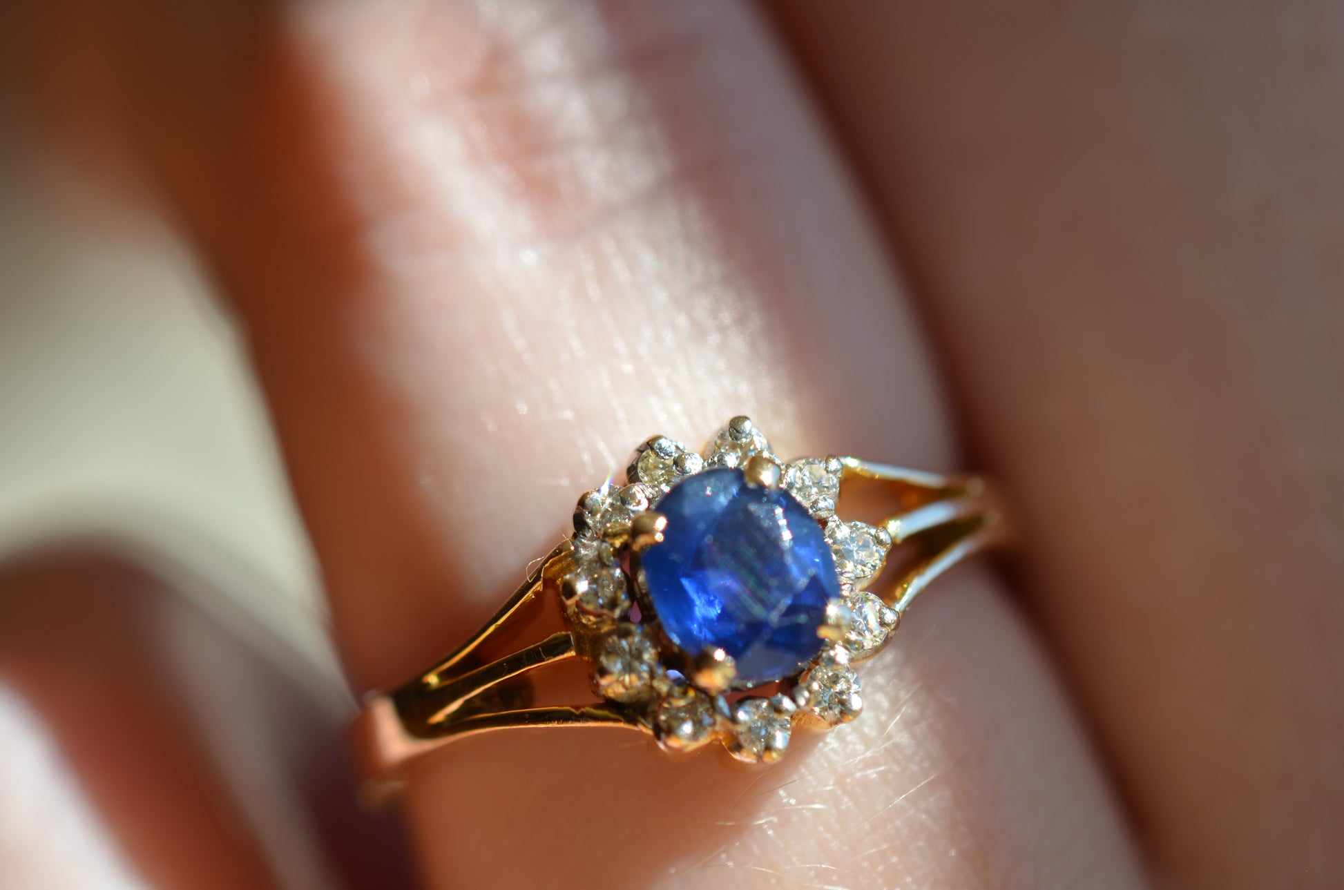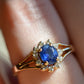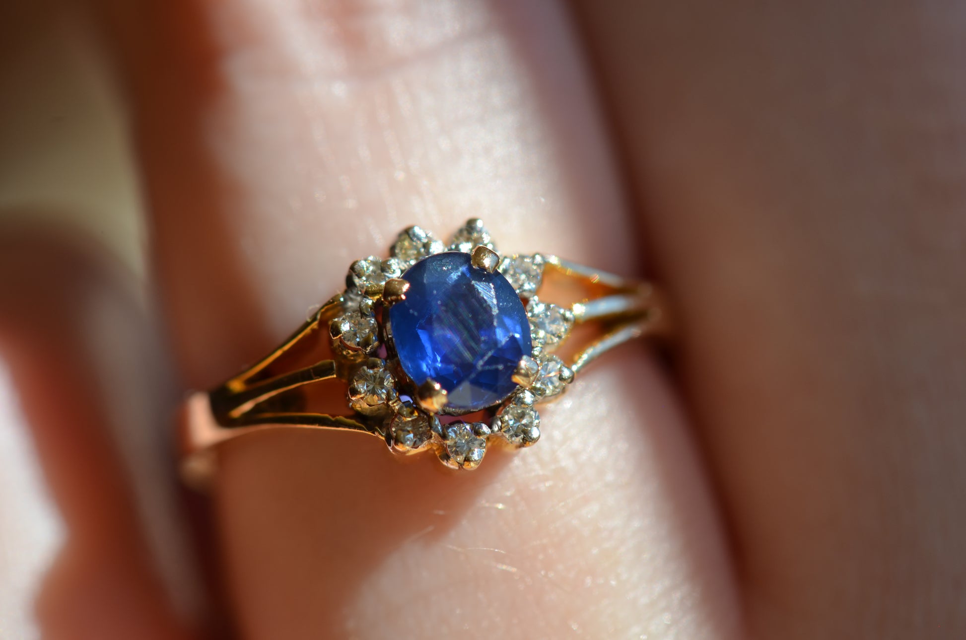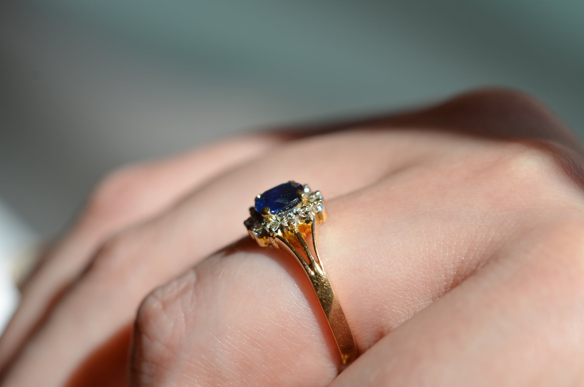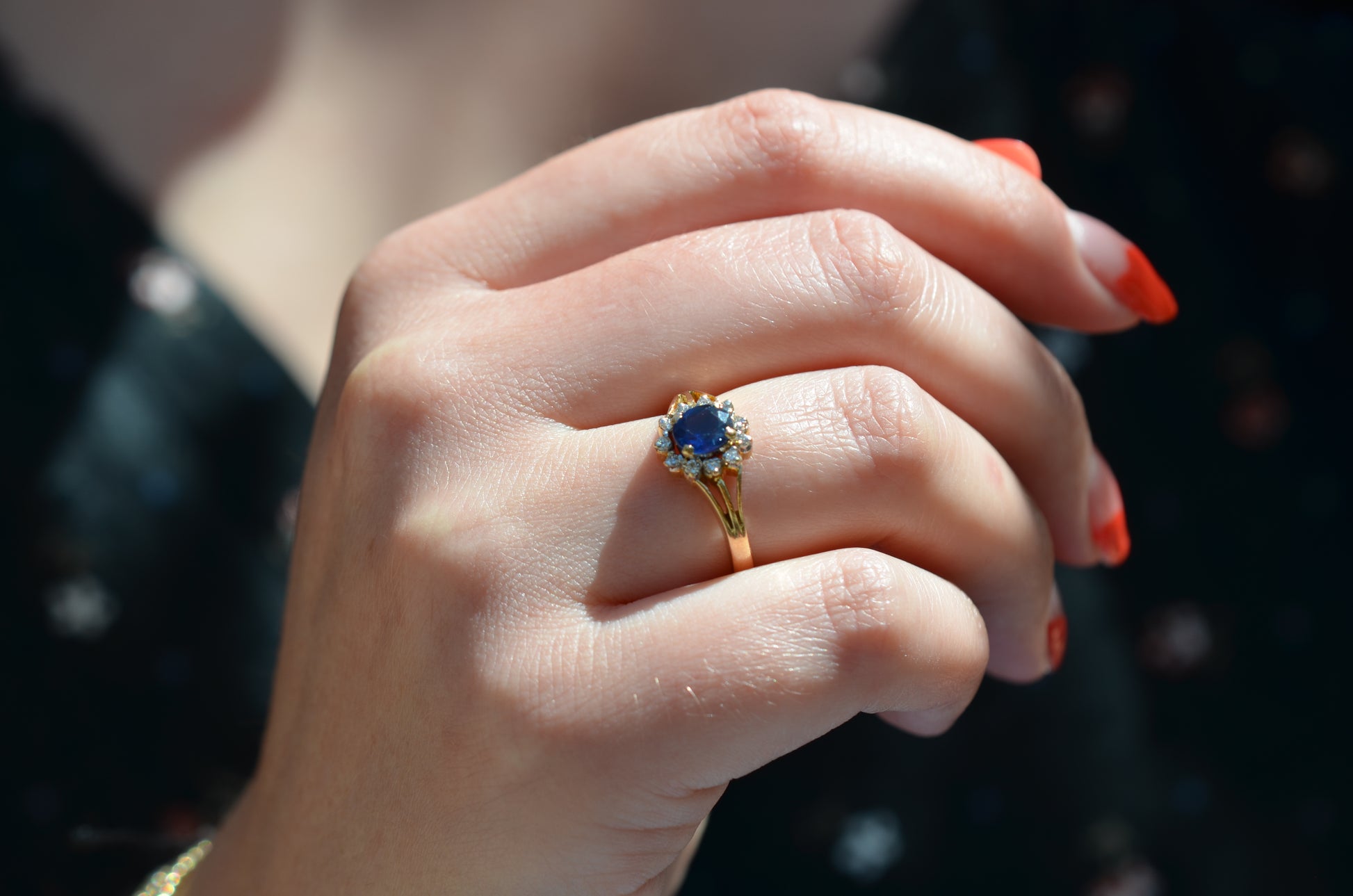 A dreamy vintage halo ring featuring a vivid blue sapphire nestled into a crown of twinkling diamonds - a ring fit for a princess and a style associated with one (or two) in particular. The mercurial sapphire at the centre of the ring vacillates between an deep-sea hue and an electric royal blue when the light strikes it just right. The diamonds wink from a setting that is lightly scalloped - a subtle bridge between a daisy and a halo - that is perfectly set off by elegant trifurcated shoulders.