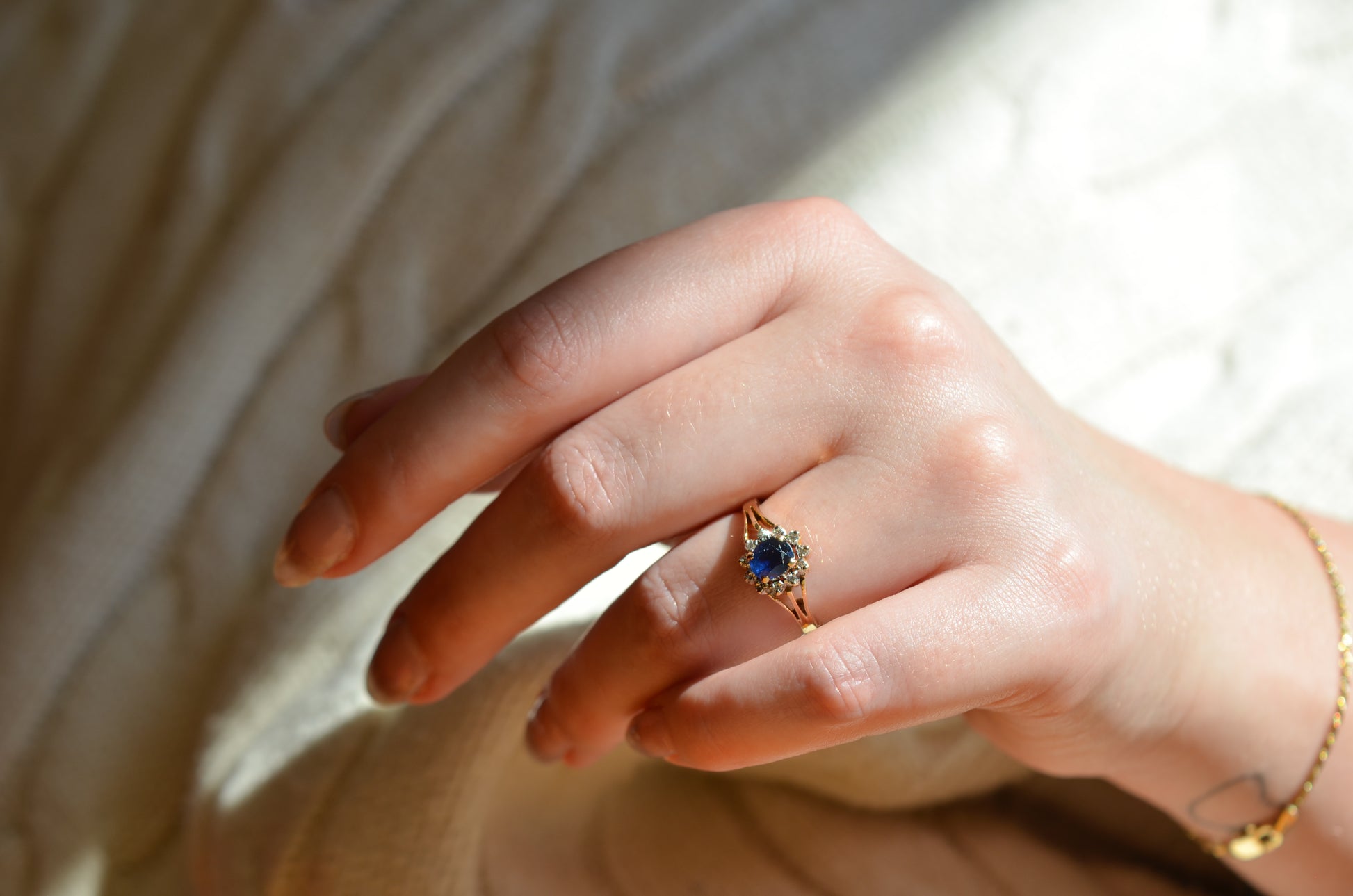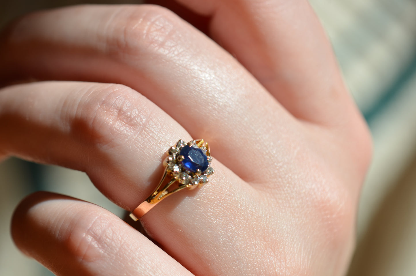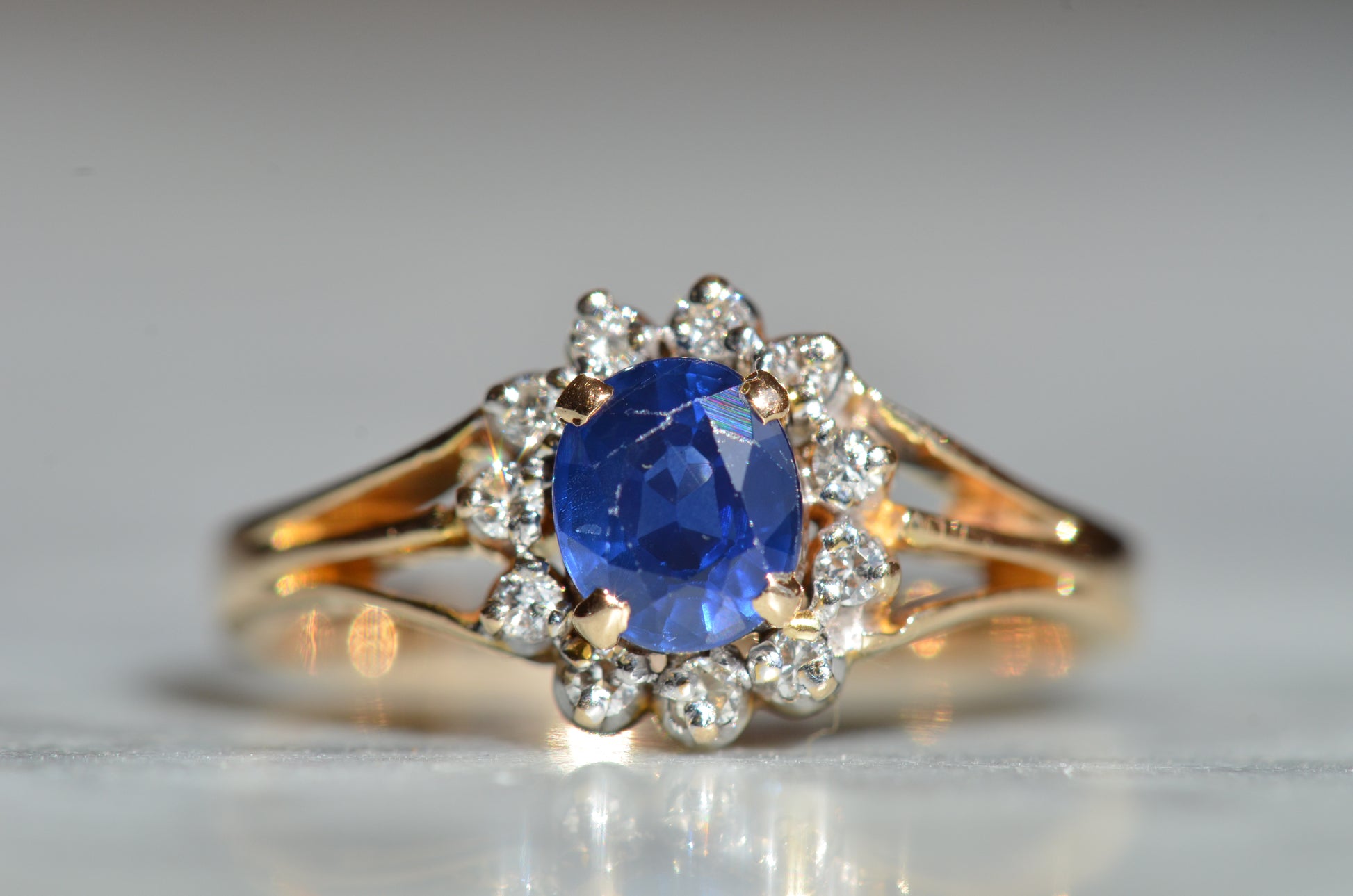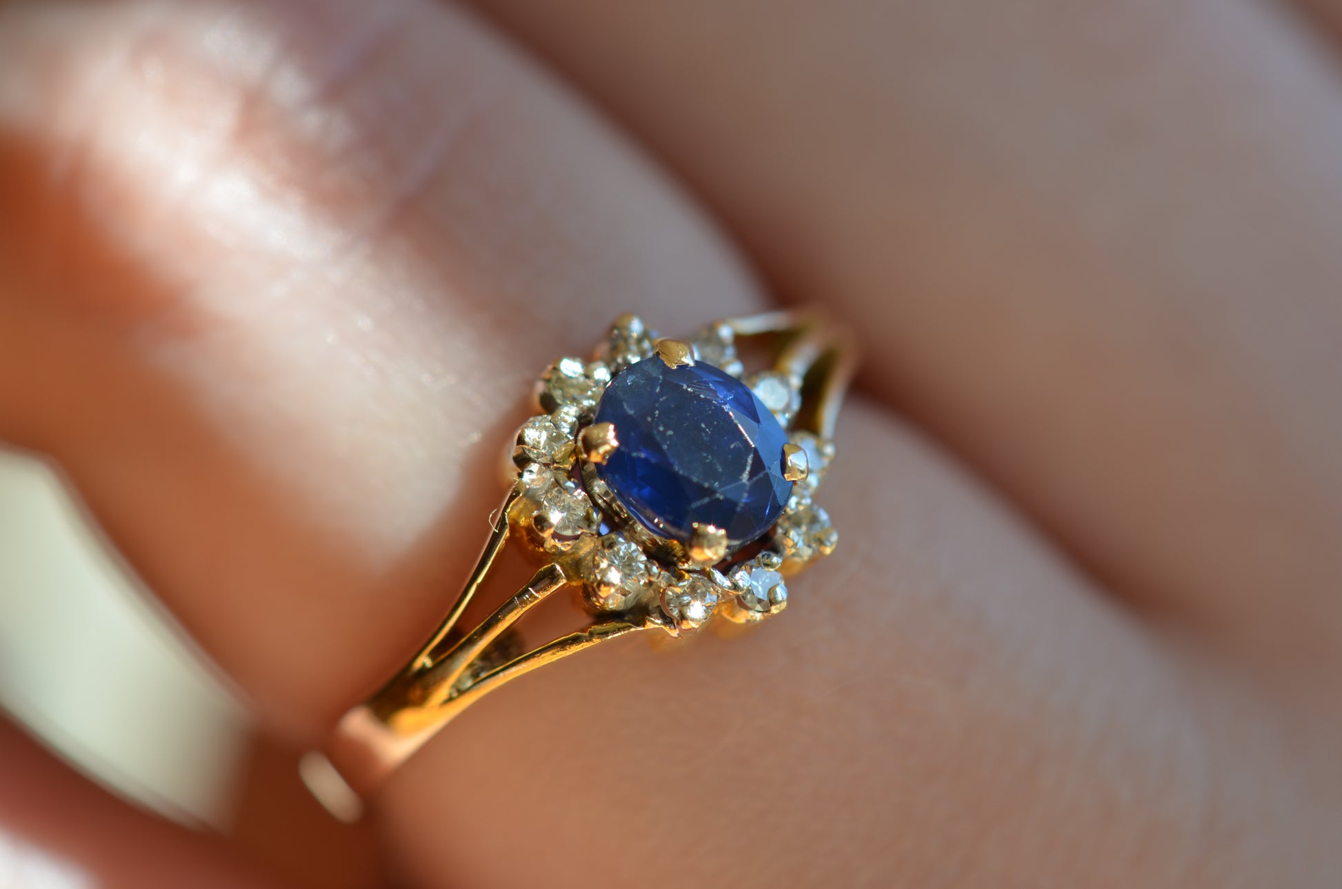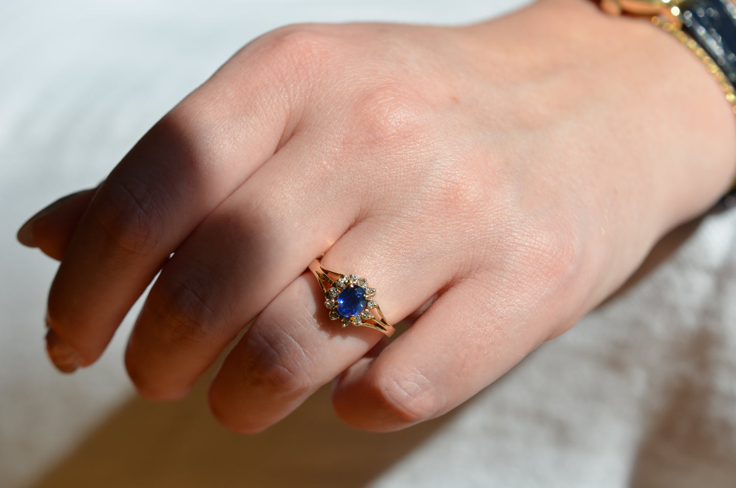 A dreamy vintage halo ring featuring a vivid blue sapphire nestled into a crown of twinkling diamonds - a ring fit for a princess and a style associated with one (or two) in particular. The mercurial sapphire at the centre of the ring vacillates between an deep-sea hue and an electric royal blue when the light strikes it just right. The diamonds wink from a setting that is lightly scalloped - a subtle bridge between a daisy and a halo - that is perfectly set off by elegant trifurcated shoulders.