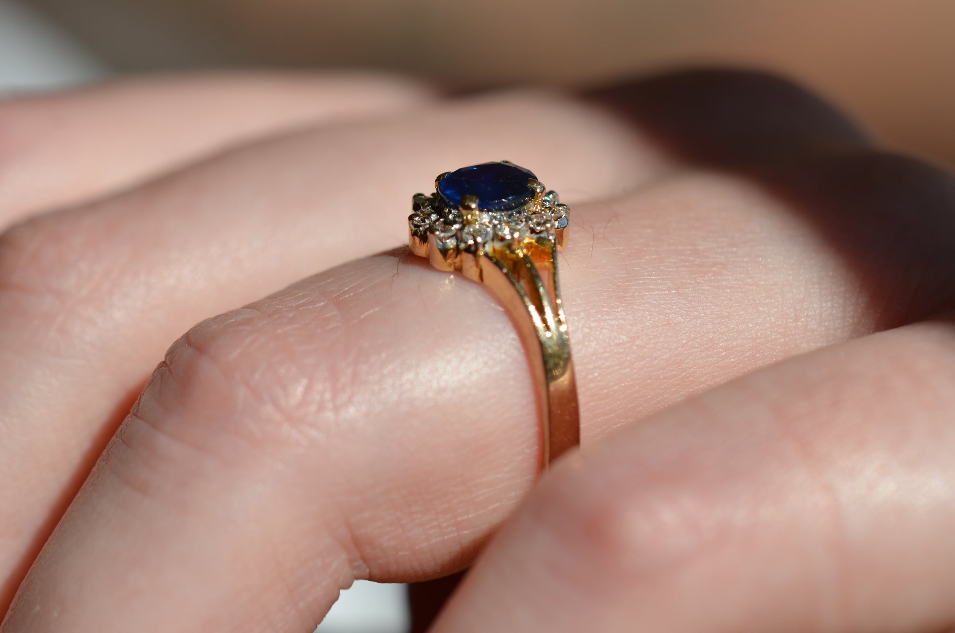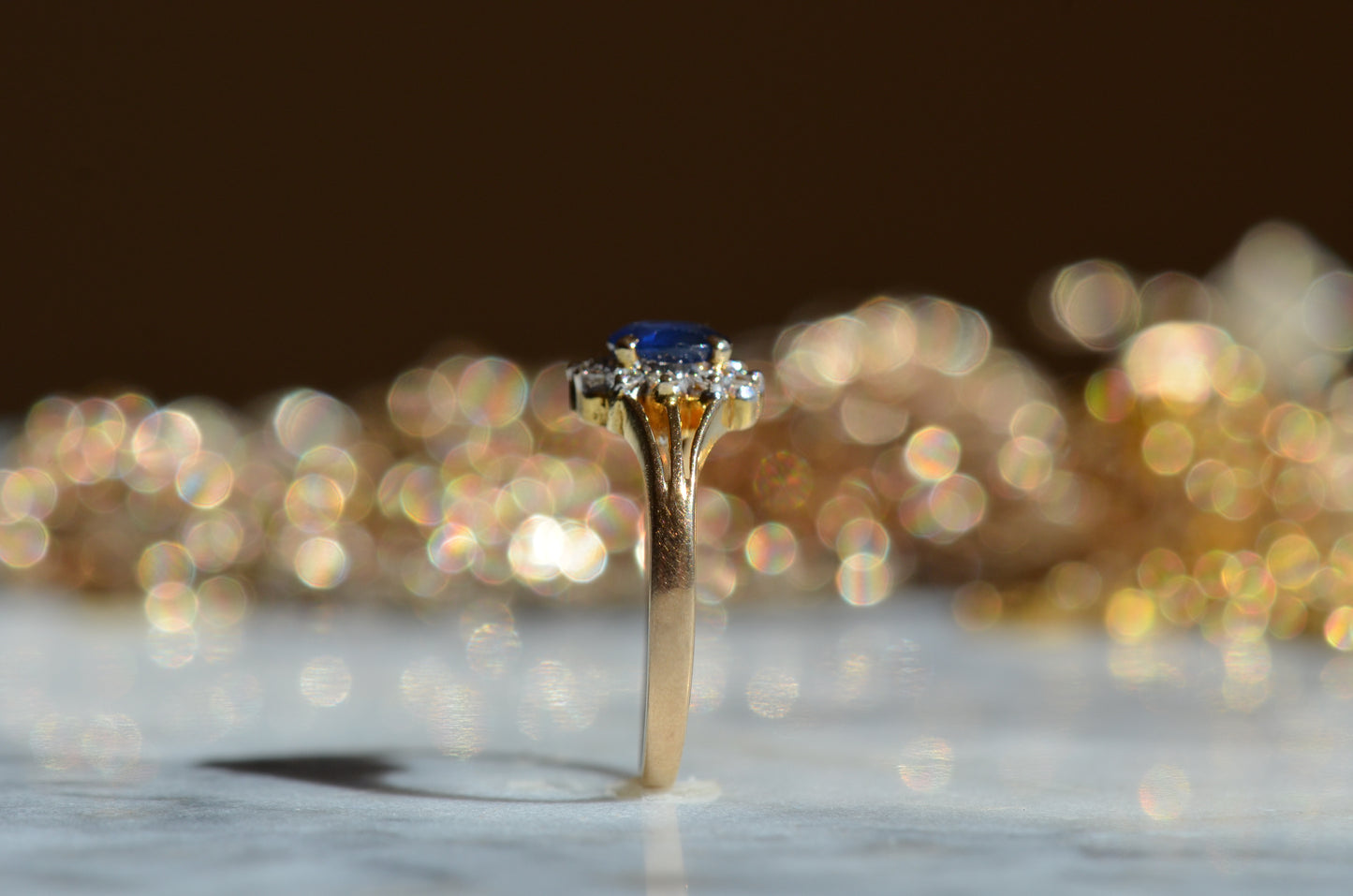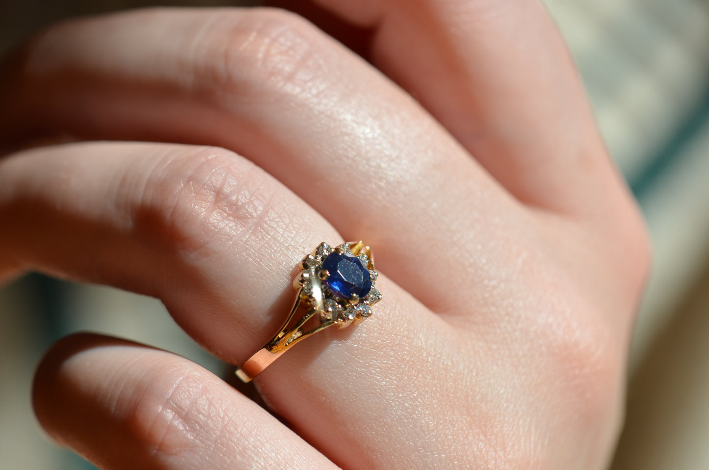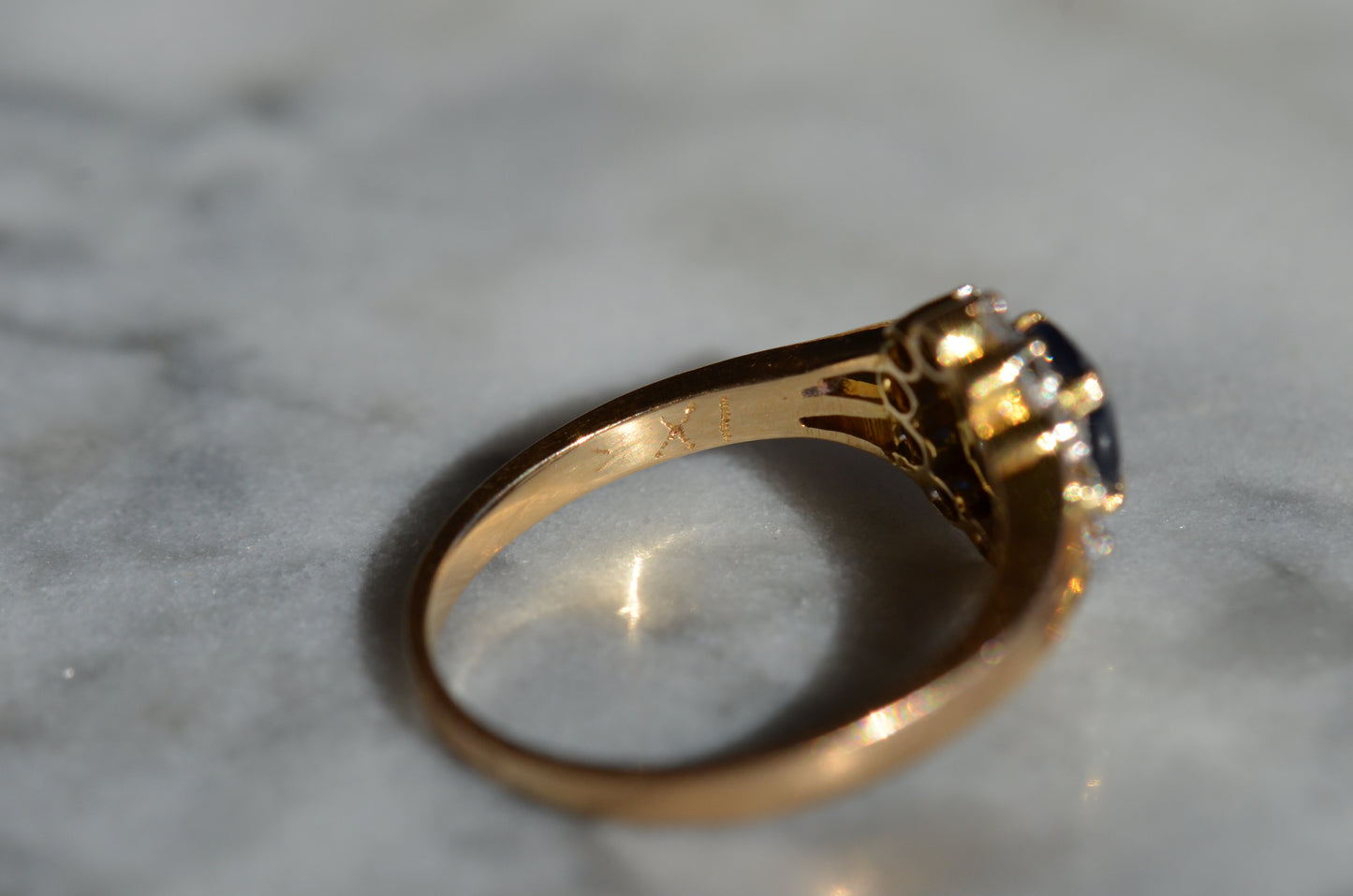 A dreamy vintage halo ring featuring a vivid blue sapphire nestled into a crown of twinkling diamonds - a ring fit for a princess and a style associated with one (or two) in particular. The mercurial sapphire at the centre of the ring vacillates between an deep-sea hue and an electric royal blue when the light strikes it just right. The diamonds wink from a setting that is lightly scalloped - a subtle bridge between a daisy and a halo - that is perfectly set off by elegant trifurcated shoulders.