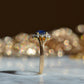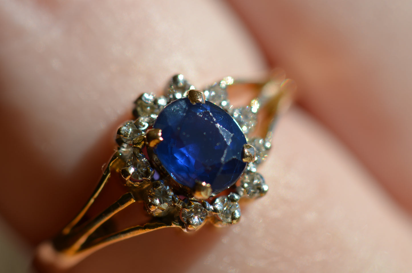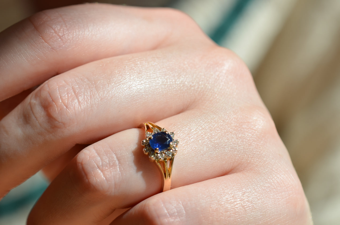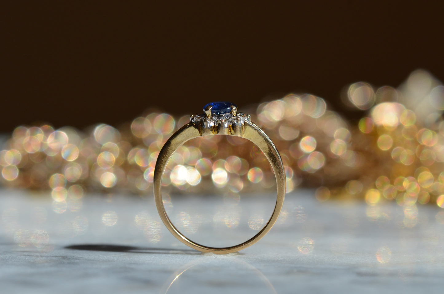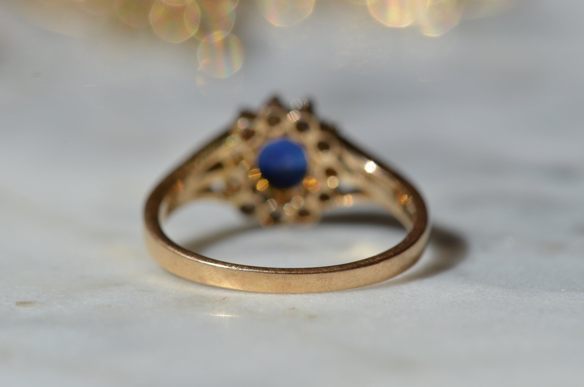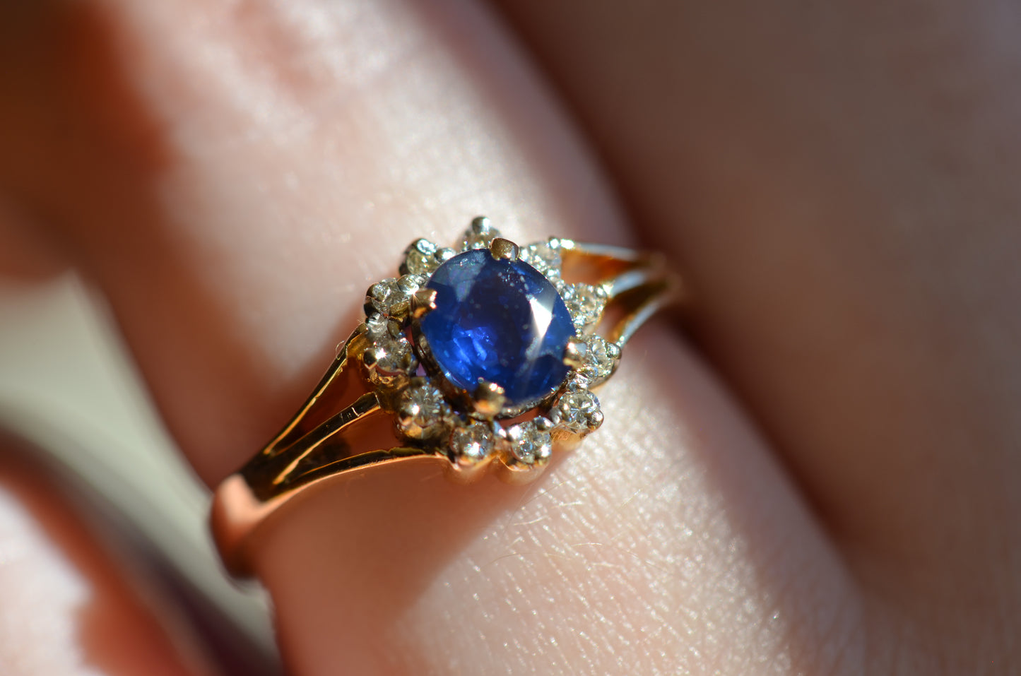 A dreamy vintage halo ring featuring a vivid blue sapphire nestled into a crown of twinkling diamonds - a ring fit for a princess and a style associated with one (or two) in particular. The mercurial sapphire at the centre of the ring vacillates between an deep-sea hue and an electric royal blue when the light strikes it just right. The diamonds wink from a setting that is lightly scalloped - a subtle bridge between a daisy and a halo - that is perfectly set off by elegant trifurcated shoulders.