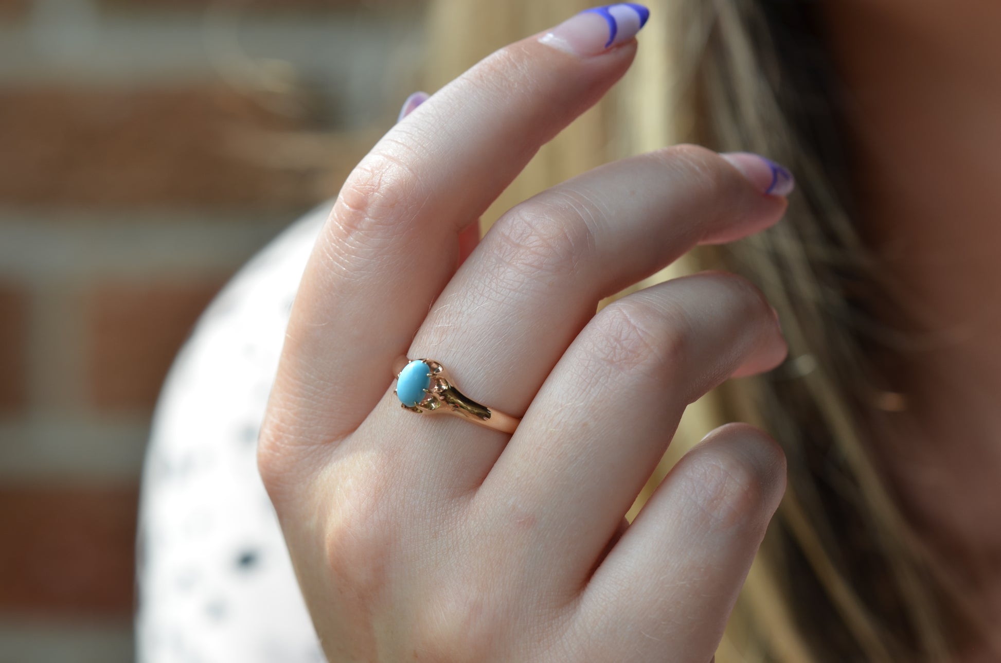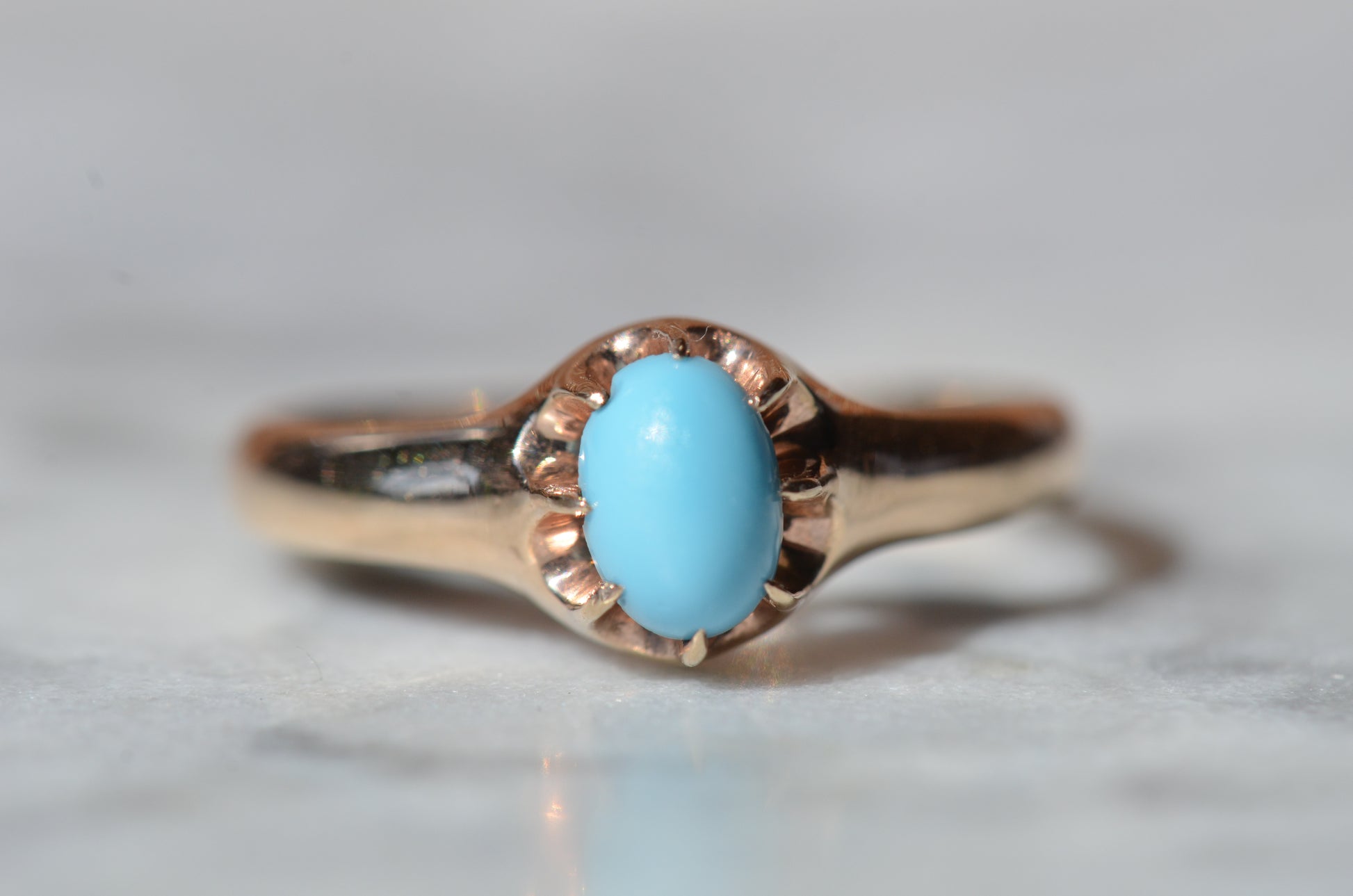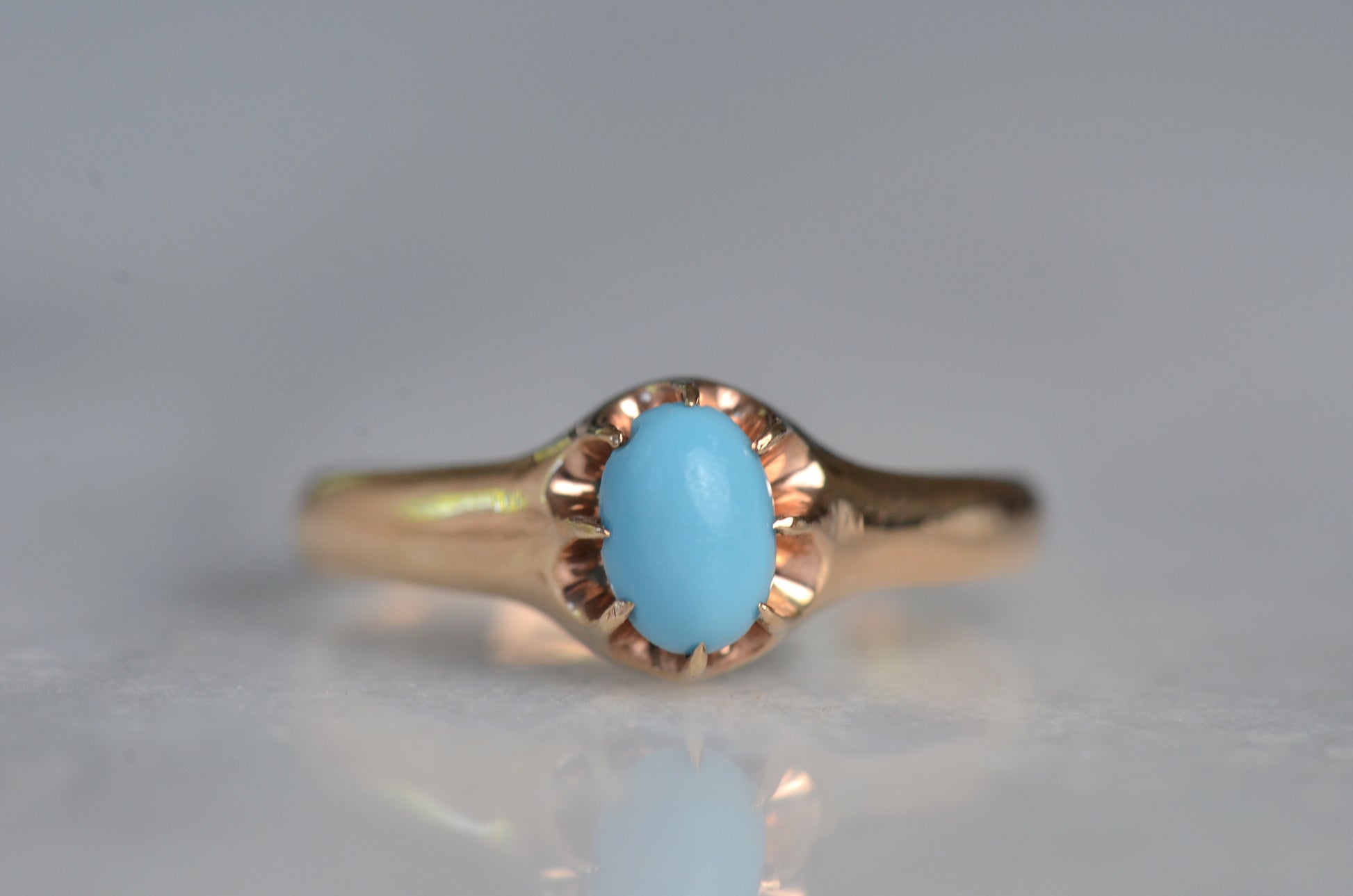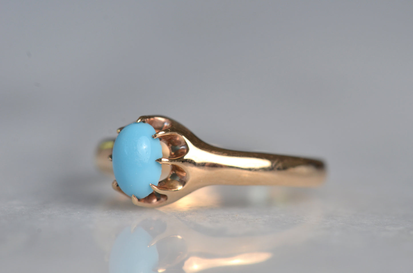 For over 5000 years, turquoise has captivated lovers of beauty all around the world. Mined primarily in arid climates, from Iran to Mexico to the United States to Australia, the stone has held popularity through the ages and across cultures. This Victorian-inspired vintage belcher ring combines smooth gold and a pop of colour with the negative space of the mount to create a piece that is at once visually interesting and low key.