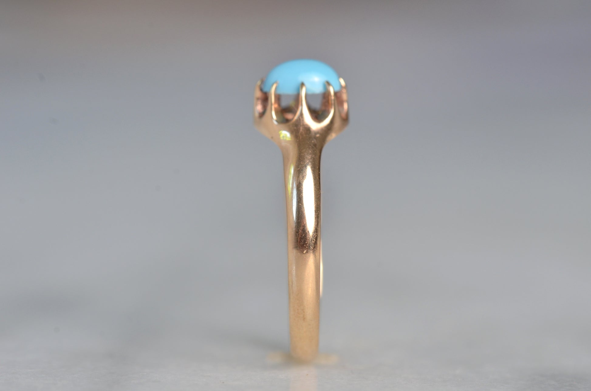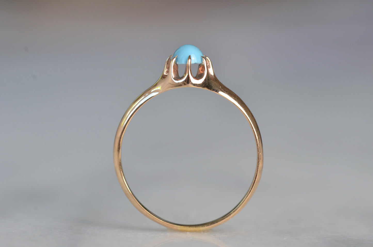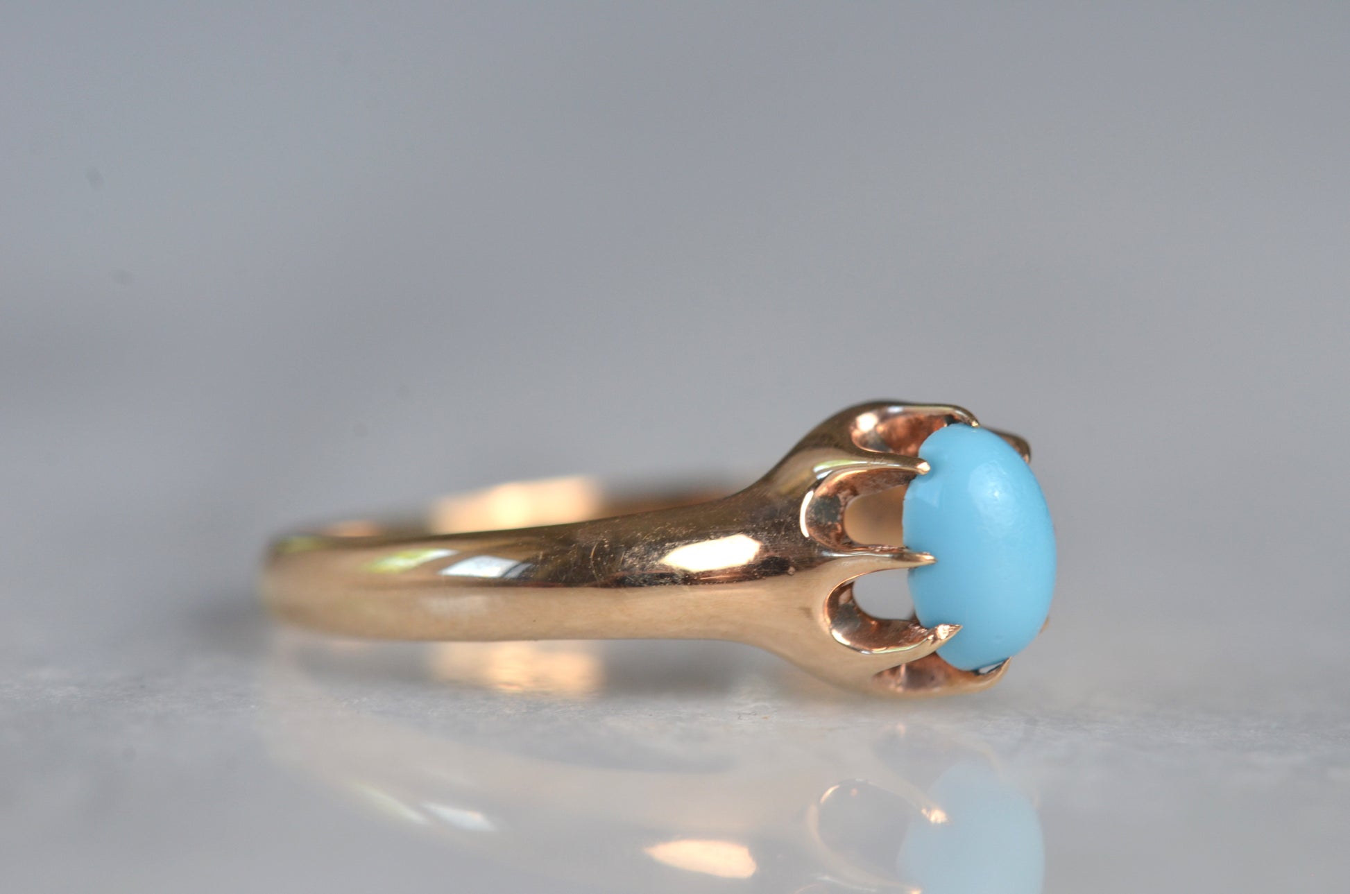 For over 5000 years, turquoise has captivated lovers of beauty all around the world. Mined primarily in arid climates, from Iran to Mexico to the United States to Australia, the stone has held popularity through the ages and across cultures. This Victorian-inspired vintage belcher ring combines smooth gold and a pop of colour with the negative space of the mount to create a piece that is at once visually interesting and low key.
