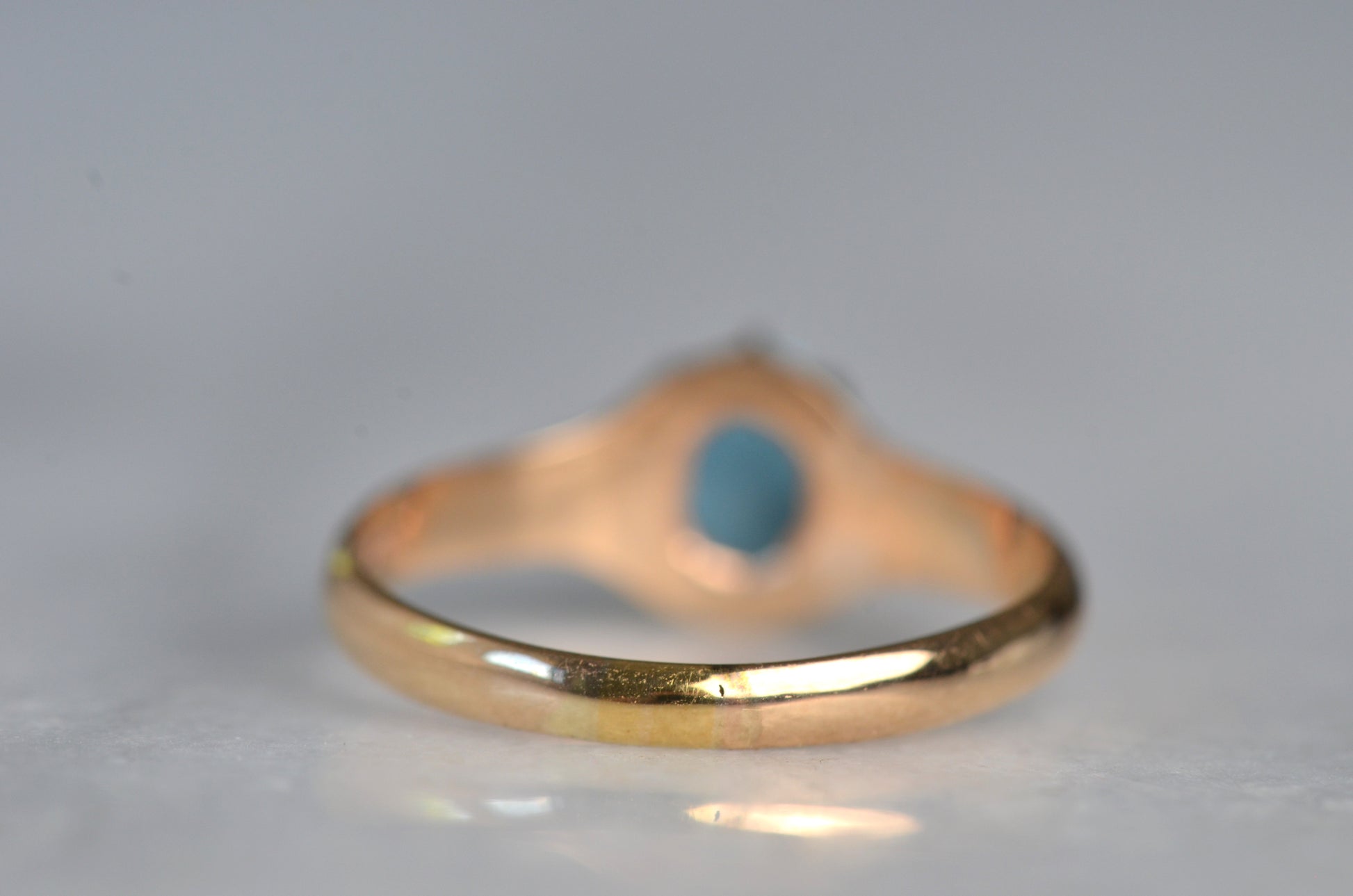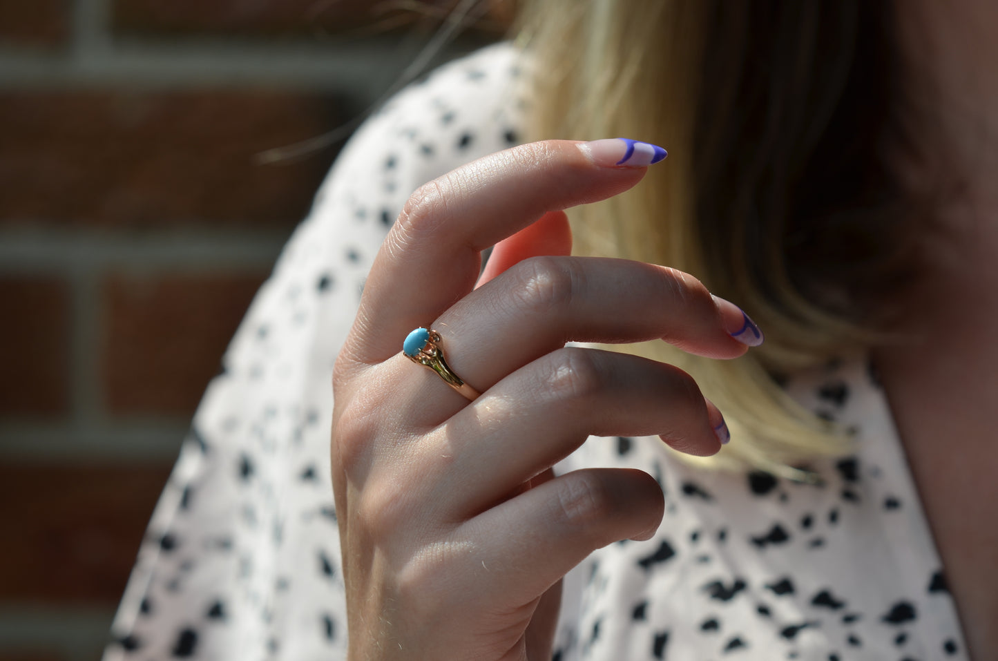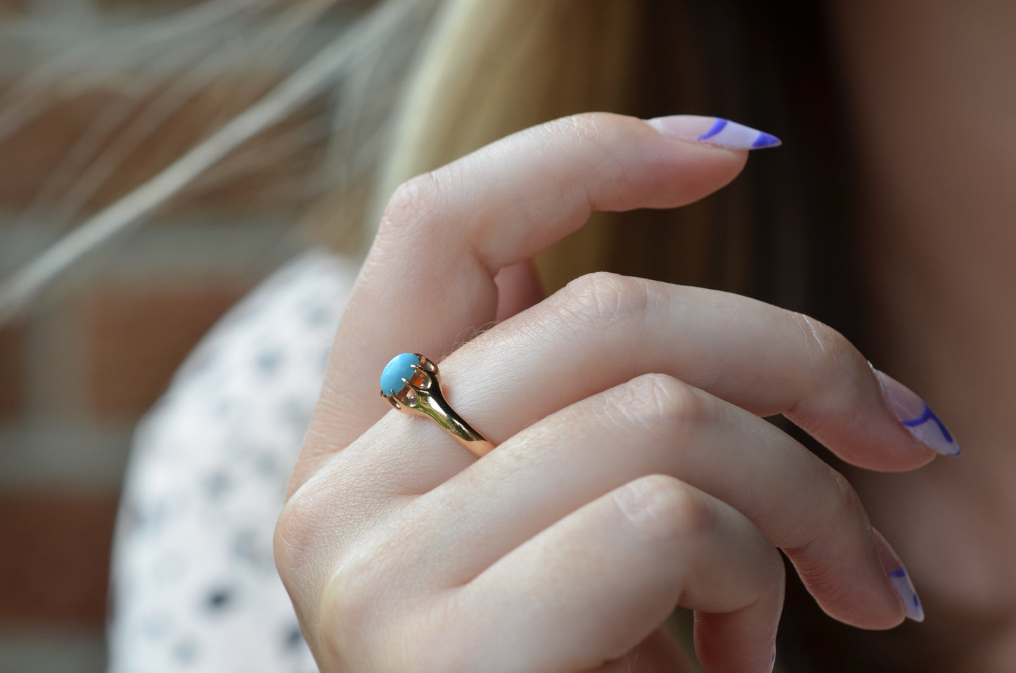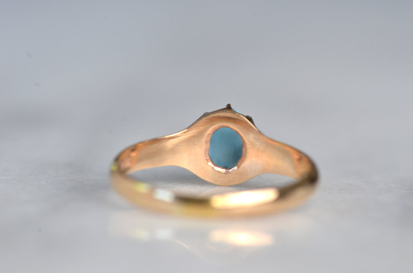 For over 5000 years, turquoise has captivated lovers of beauty all around the world. Mined primarily in arid climates, from Iran to Mexico to the United States to Australia, the stone has held popularity through the ages and across cultures. This Victorian-inspired vintage belcher ring combines smooth gold and a pop of colour with the negative space of the mount to create a piece that is at once visually interesting and low key.