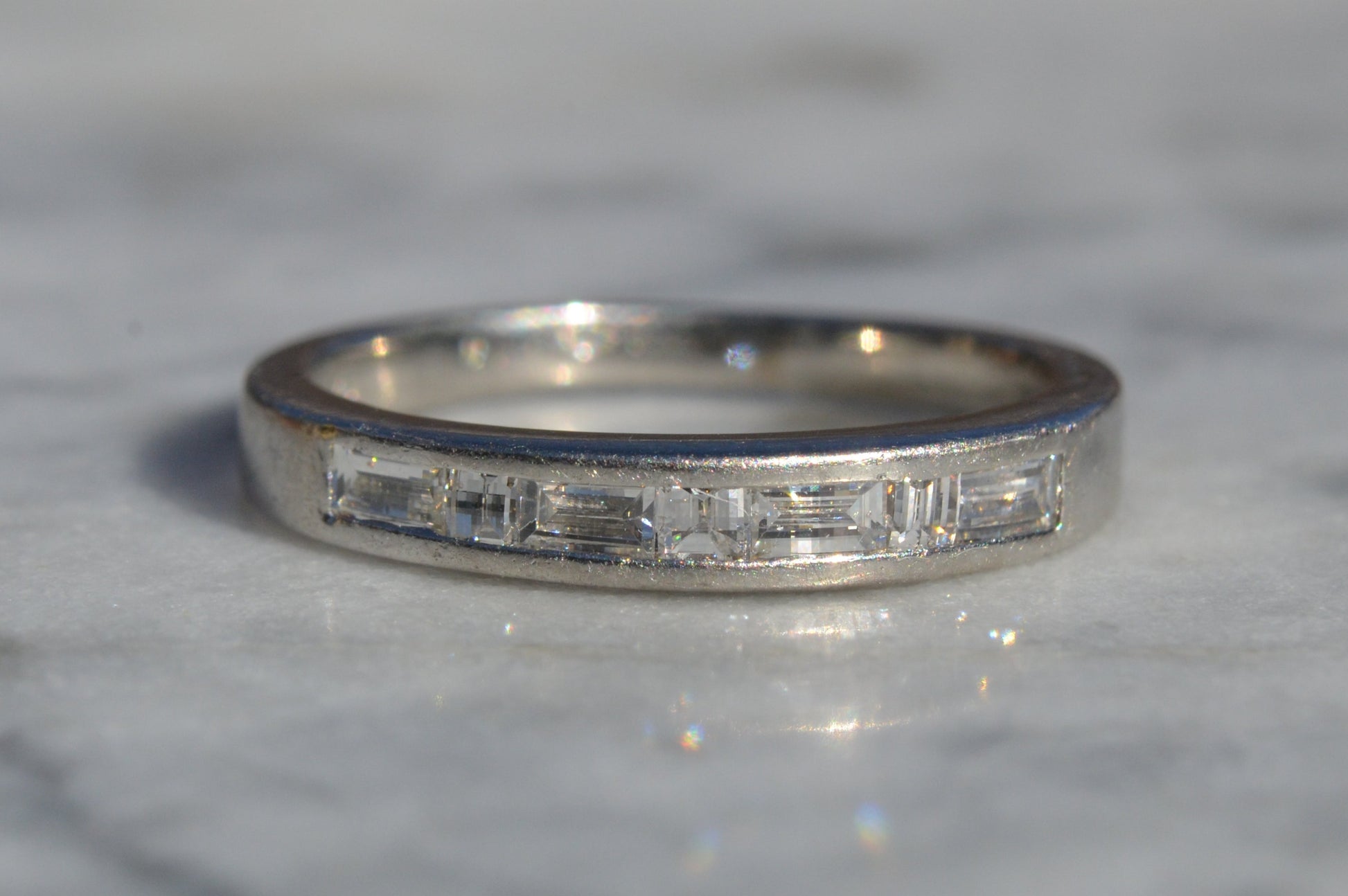 • Four modified baguette (with faceted tops) diamonds and 3 modified step cut square diamonds, approximately 0.49 carat total weight