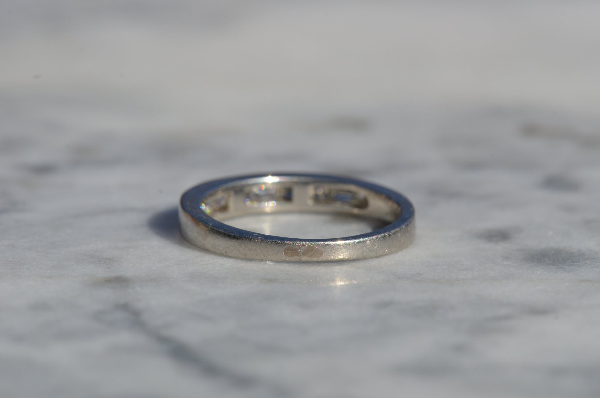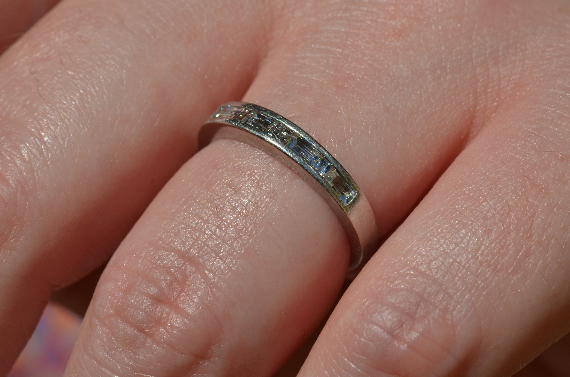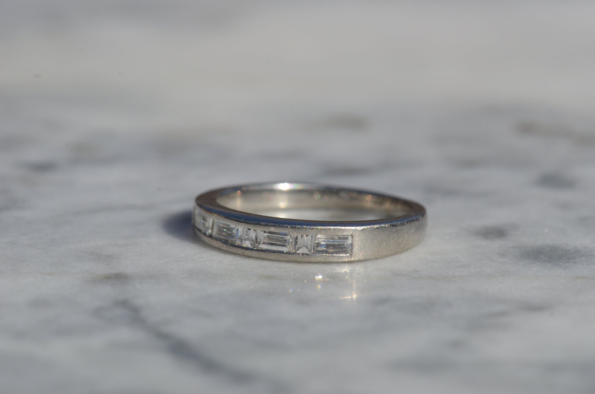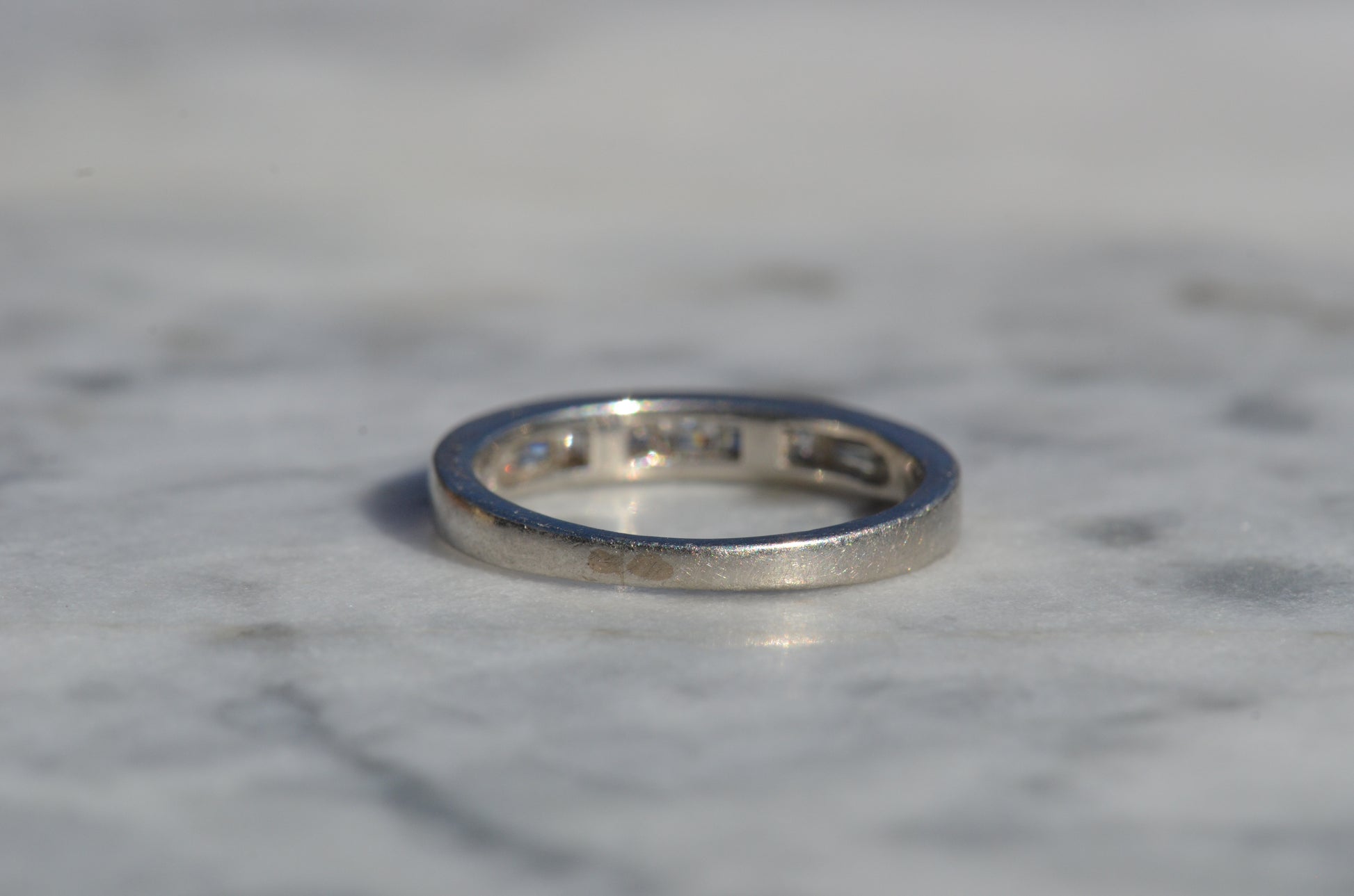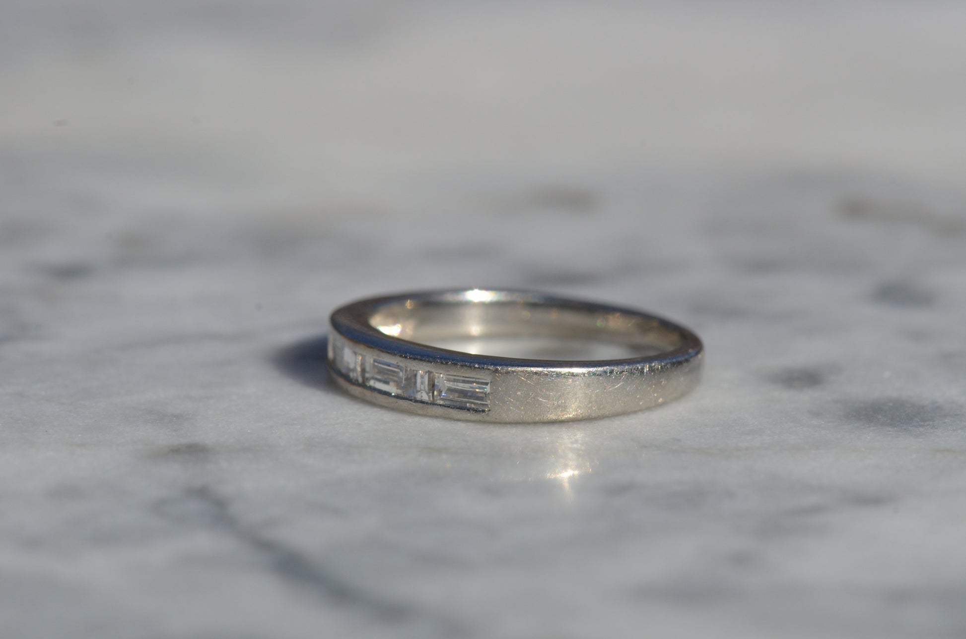 Crisp diamonds with extra faceting scintillate, offsetting the rich worn-in patina of platinum in this perfect band. Platinum, denser than gold, provides a satisfying heft in a ring while maintaining sleek lines.
