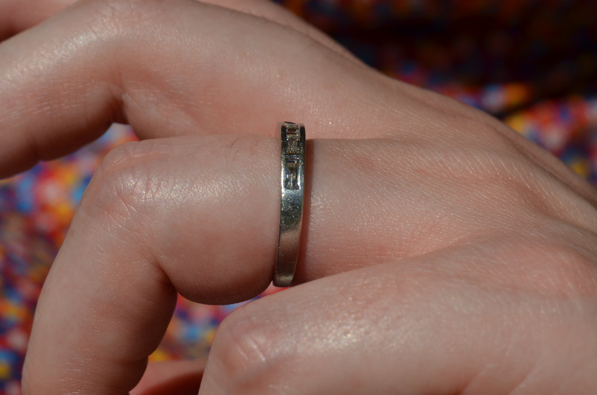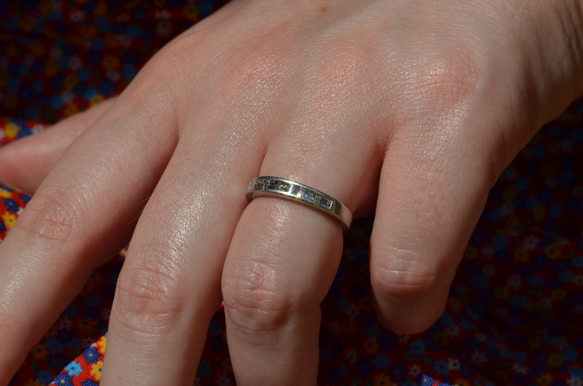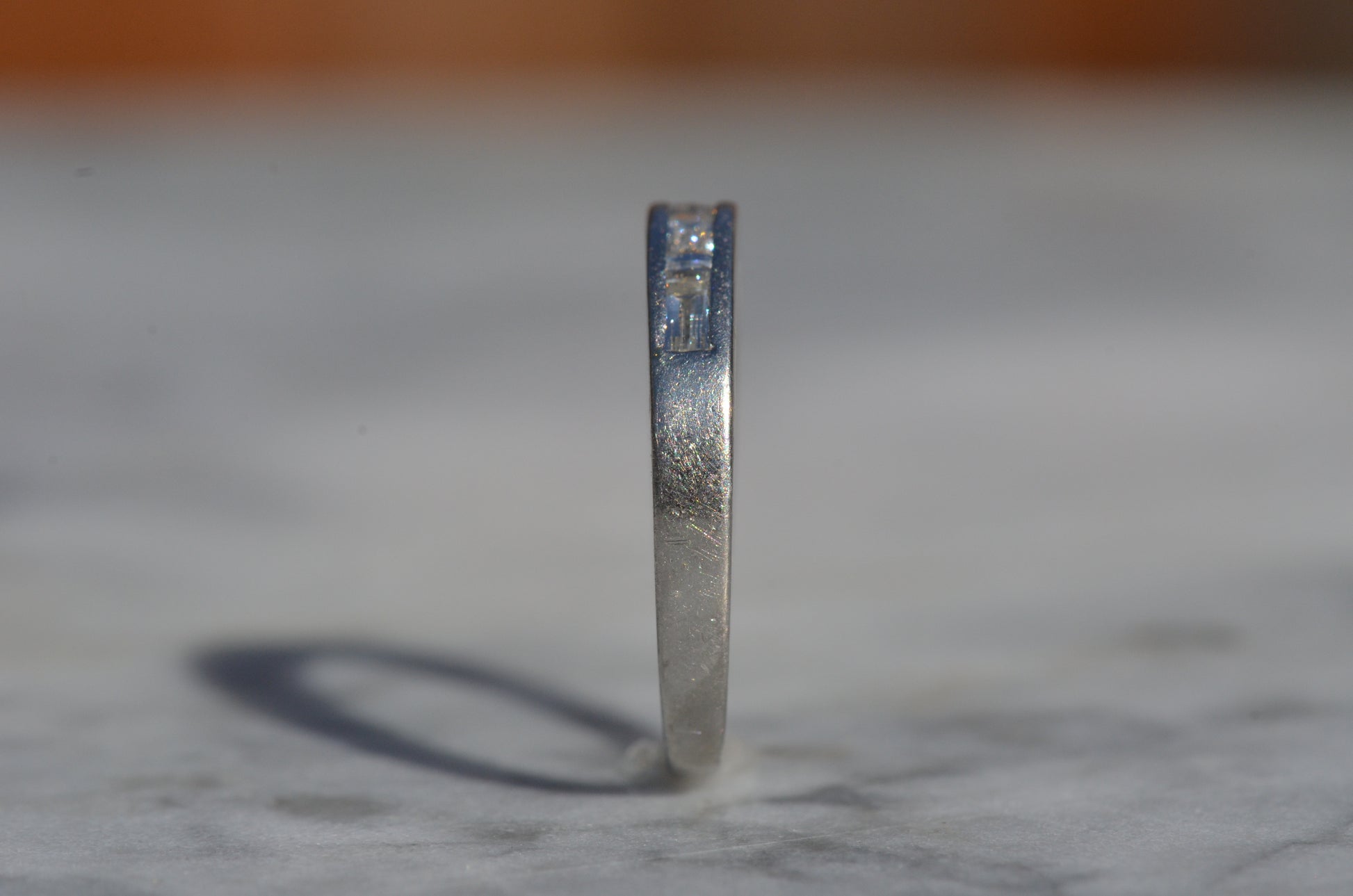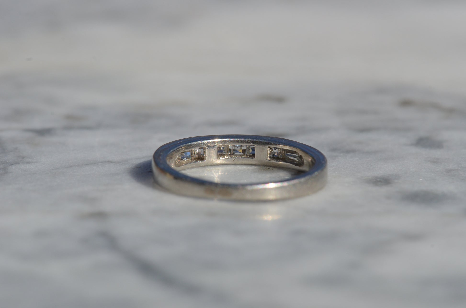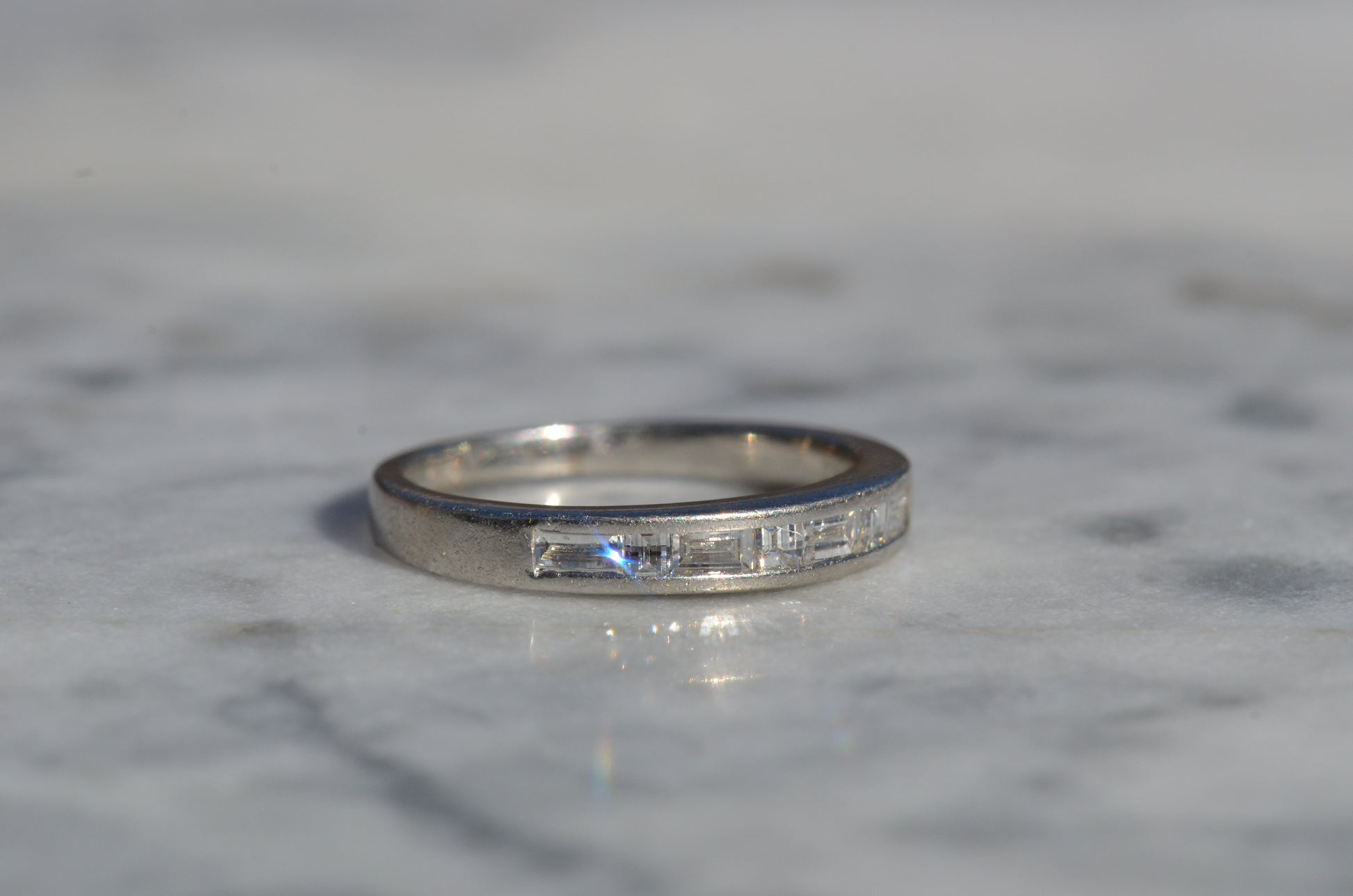 Crisp diamonds with extra faceting scintillate, offsetting the rich worn-in patina of platinum in this perfect band. Platinum, denser than gold, provides a satisfying heft in a ring while maintaining sleek lines.