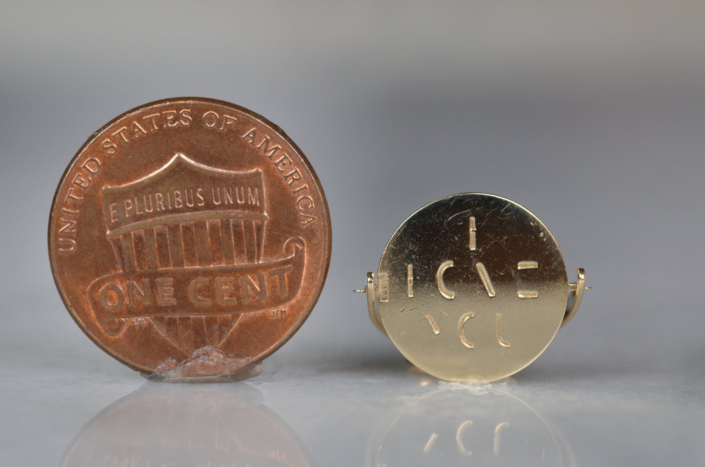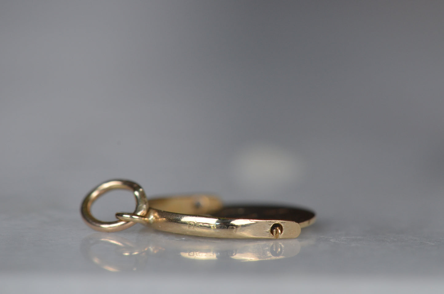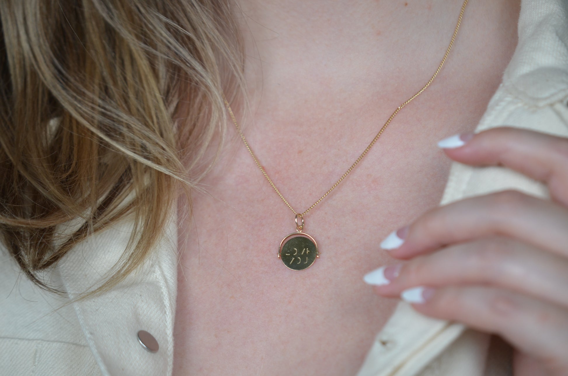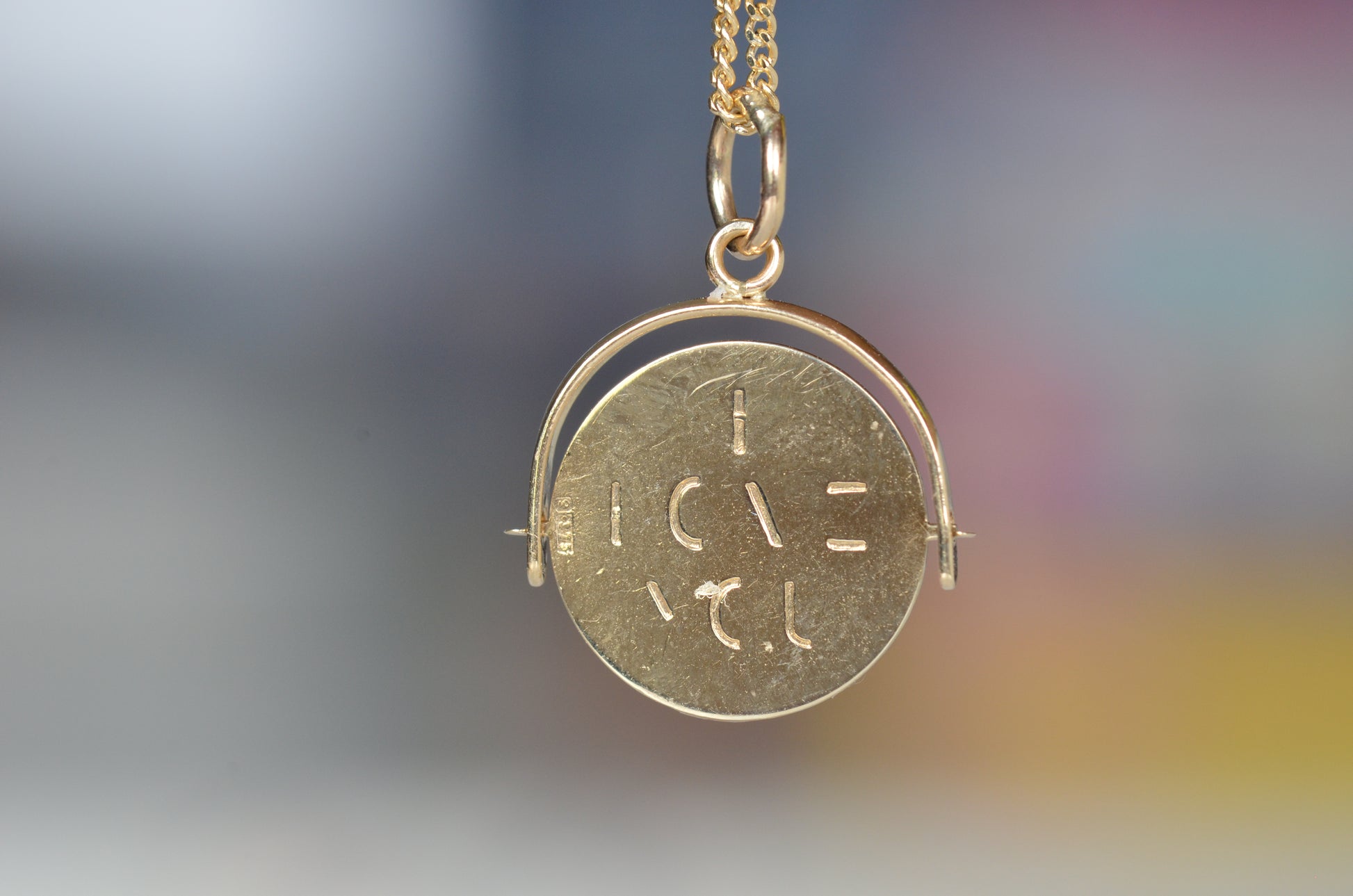 Straight from the mid-century charm craze, these delightful pieces can be added to your own charm bracelet or necklace, or worn alone on a chain to give them all the focus. Each side of the disc bears only a portion of each letter, creating a secret message that is only revealed when the disc is spun and in motion.