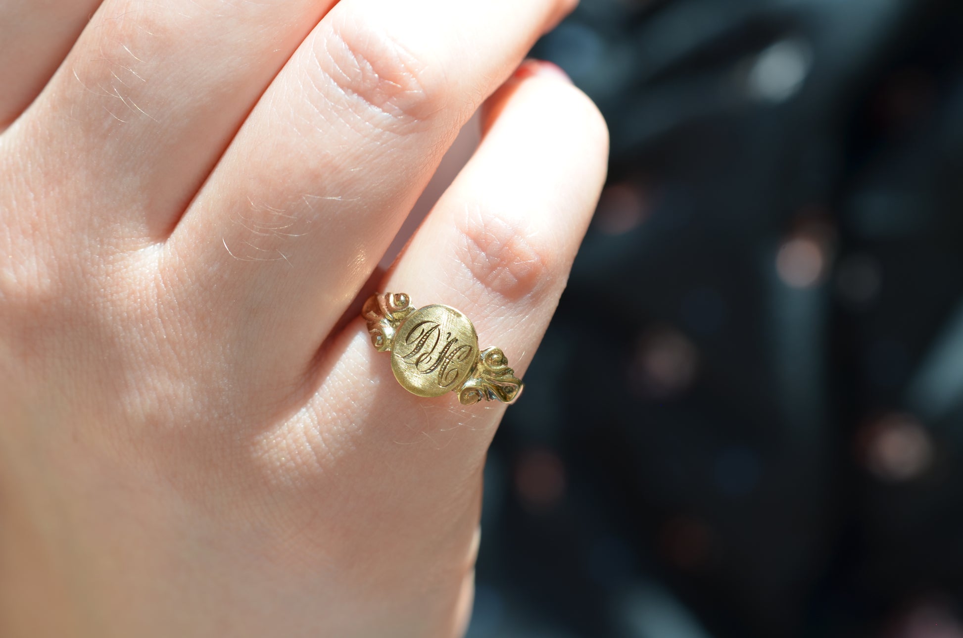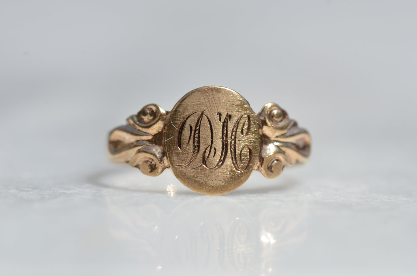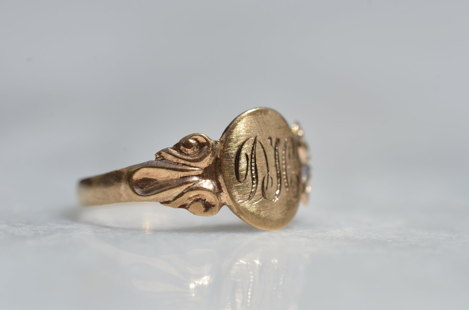 A crisply rendered take on a classic style, this signet features swooping initials to match scrolled shoulders. There's such a special feeling in finding a preloved piece that already has letters on it that are meaningful to you, that we play pretty fast and loose - maybe it's the first or last initials of you and your lover, or your own in another order, or the initials of a loved one: no matter what, it will feel sentimental every time it catches your eye.