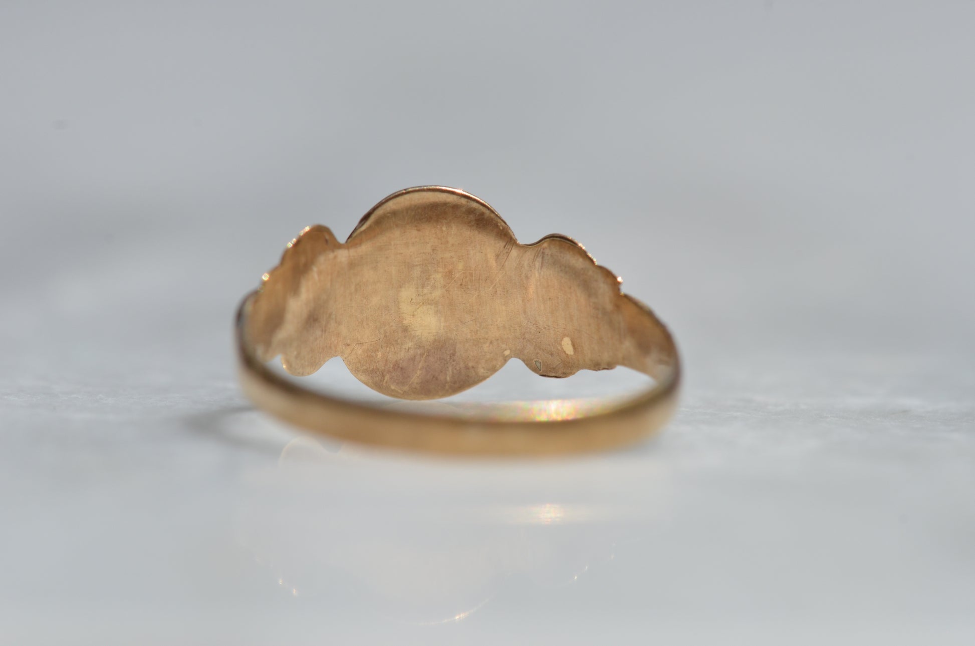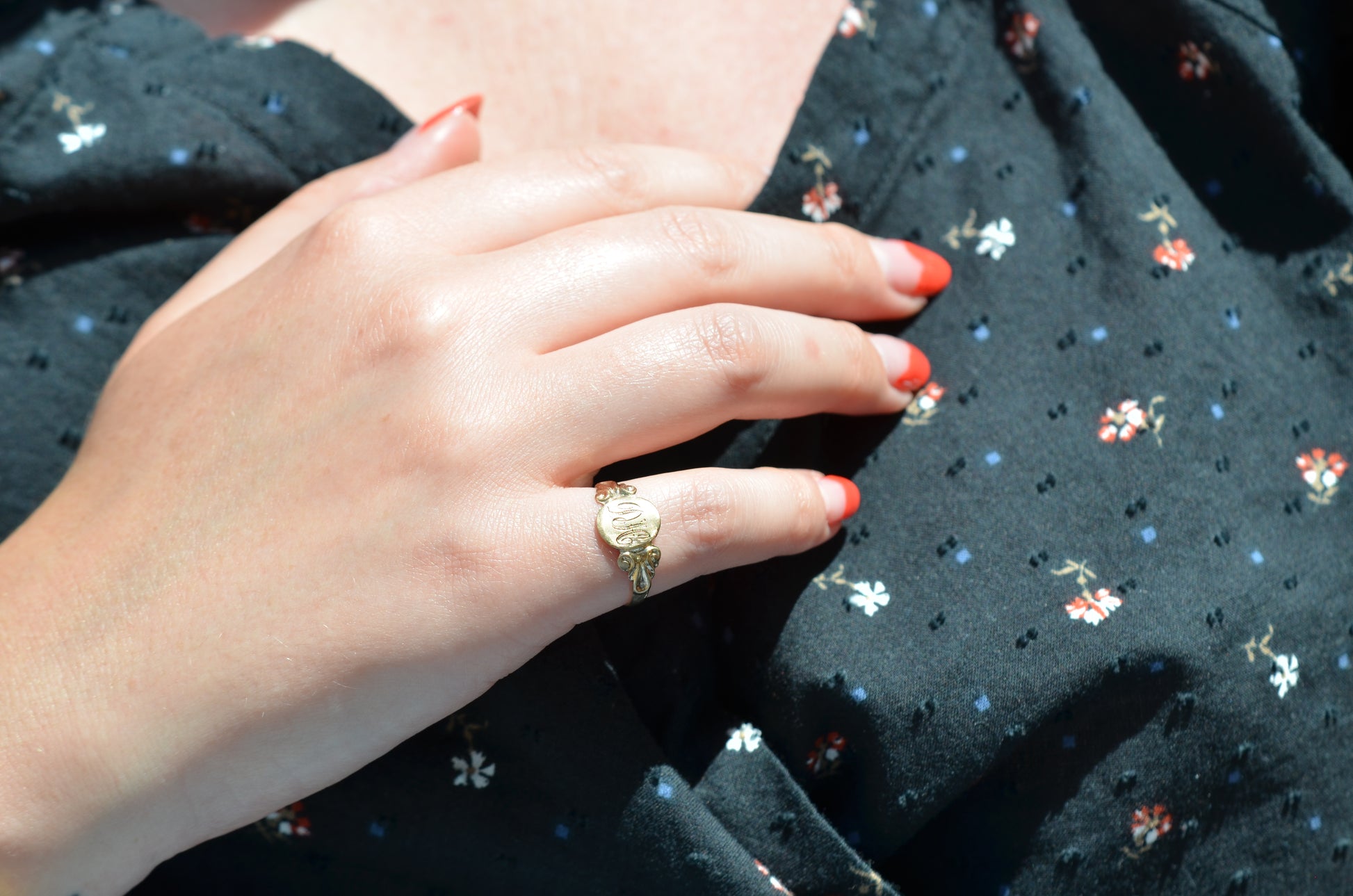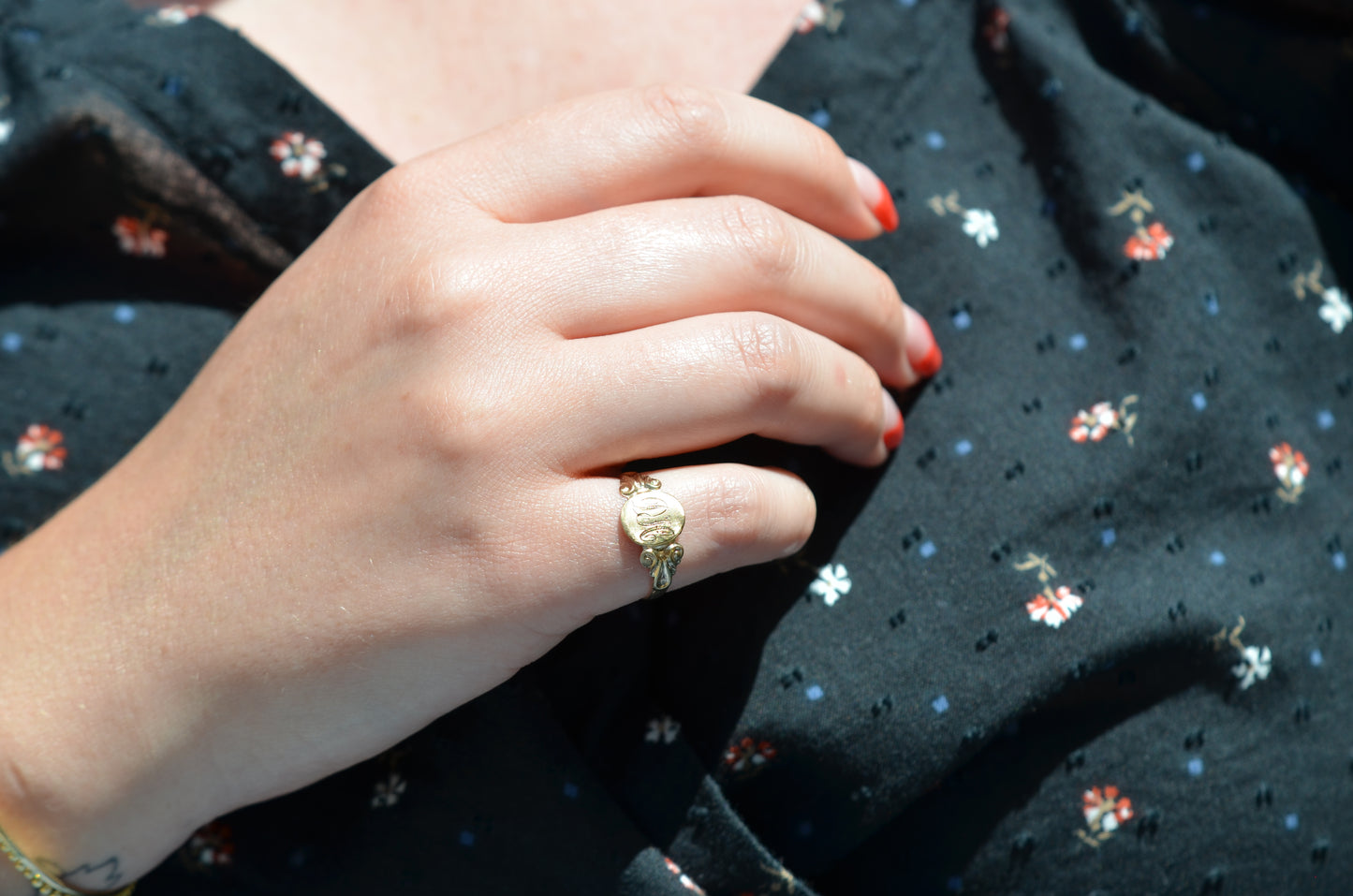A crisply rendered take on a classic style, this signet features swooping initials to match scrolled shoulders. There's such a special feeling in finding a preloved piece that already has letters on it that are meaningful to you, that we play pretty fast and loose - maybe it's the first or last initials of you and your lover, or your own in another order, or the initials of a loved one: no matter what, it will feel sentimental every time it catches your eye.
