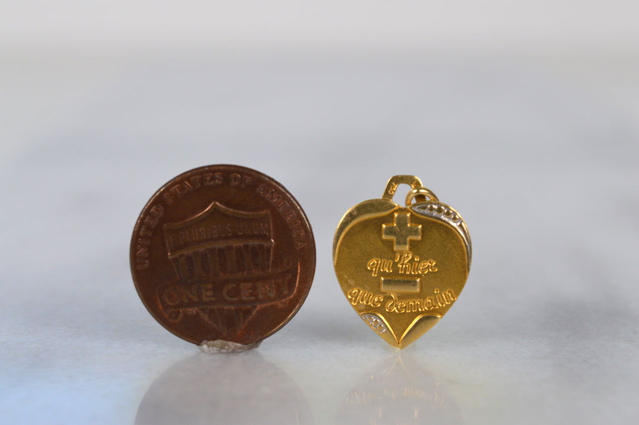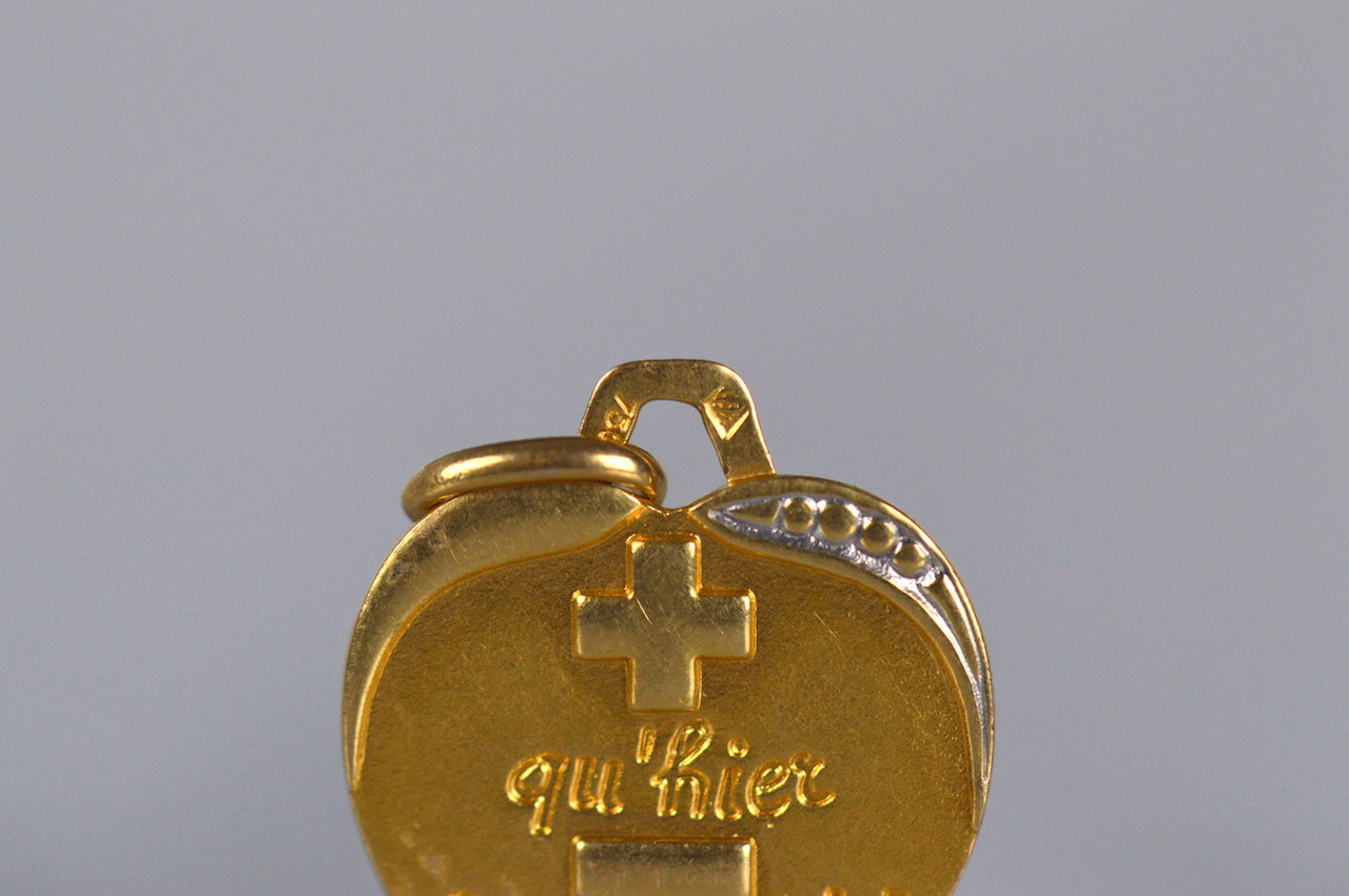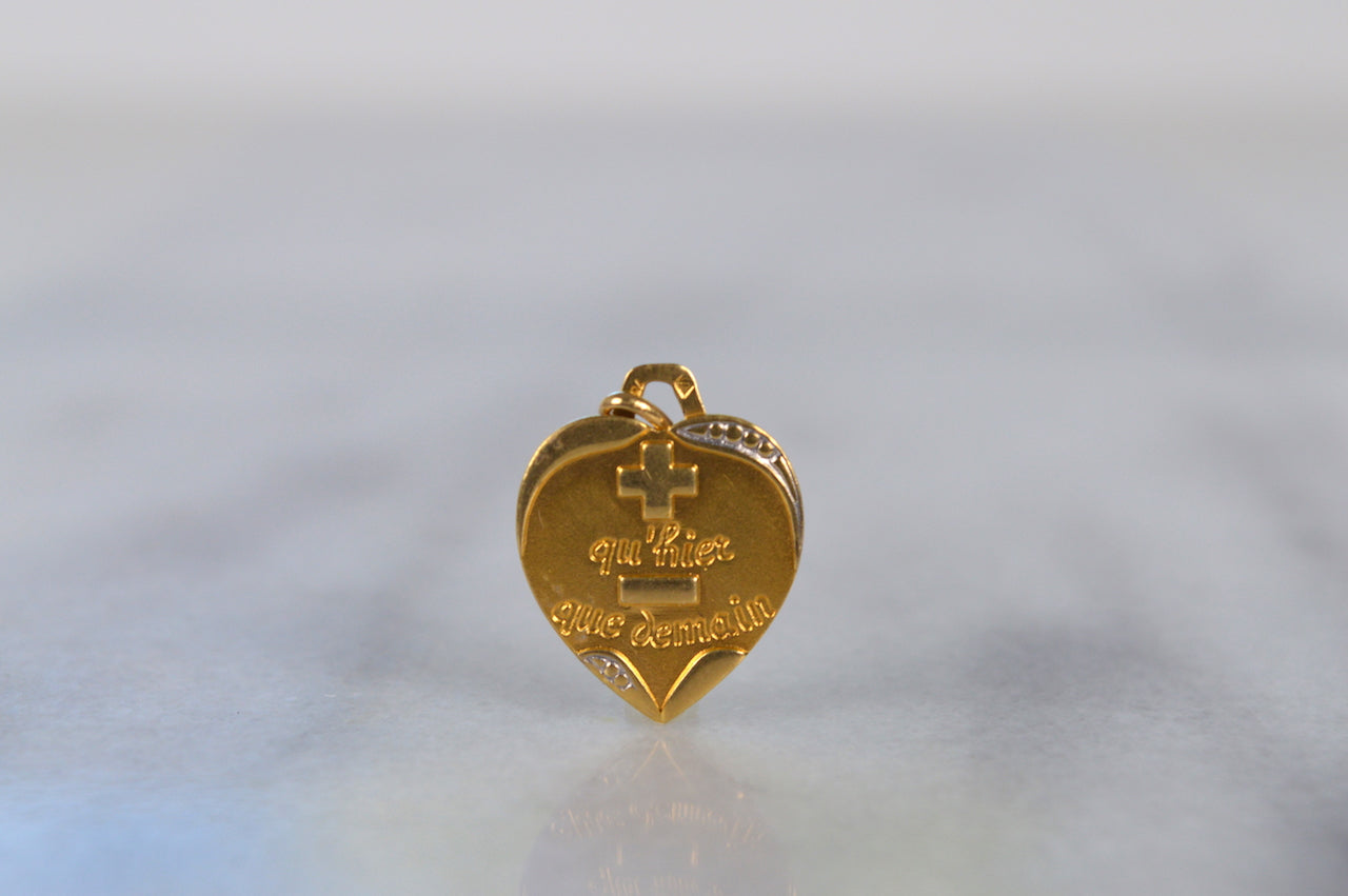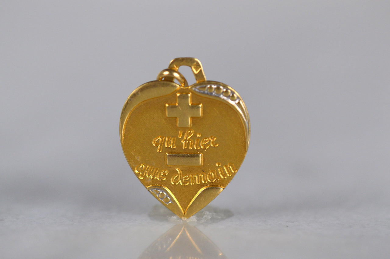 A beautiful vintage French love token, in a sweet detailed heart version. Created by Alphonse Augis and inspired by a letter poet Rosemonde Gérard wrote to her husband, the writer Edmond Rostand, the pendant features a rebus reading "+ qu'hier - que demain" for the lines,