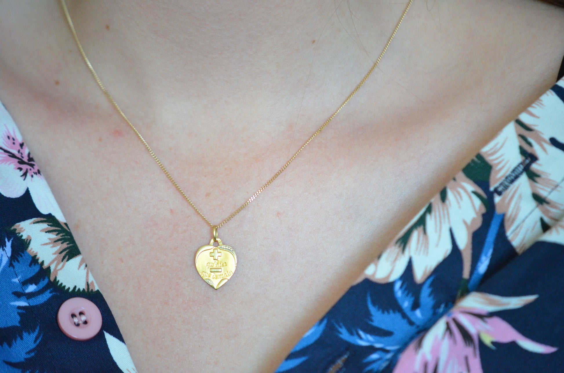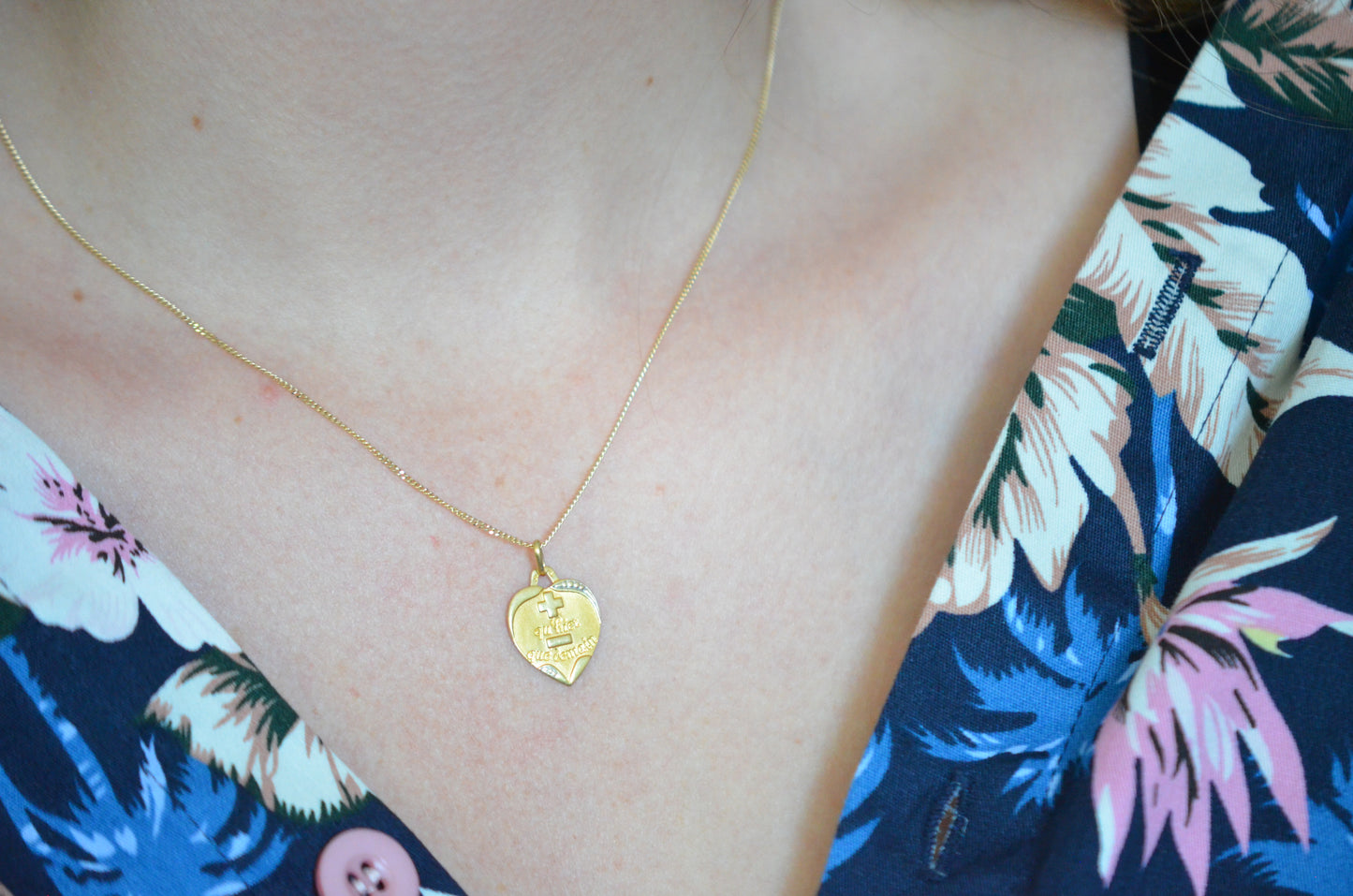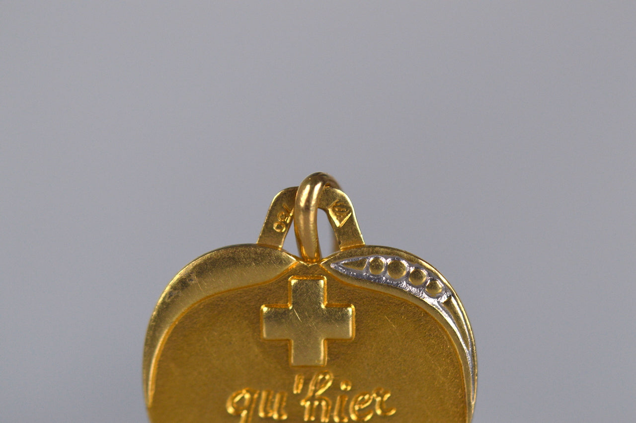 A beautiful vintage French love token, in a sweet detailed heart version. Created by Alphonse Augis and inspired by a letter poet Rosemonde Gérard wrote to her husband, the writer Edmond Rostand, the pendant features a rebus reading "+ qu'hier - que demain" for the lines,