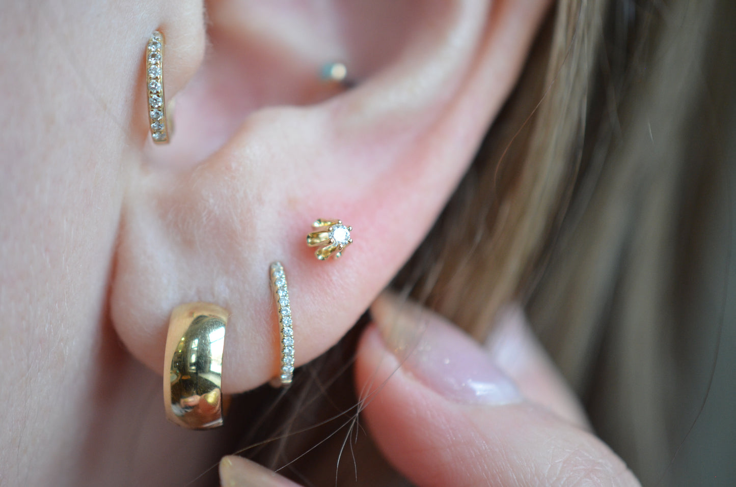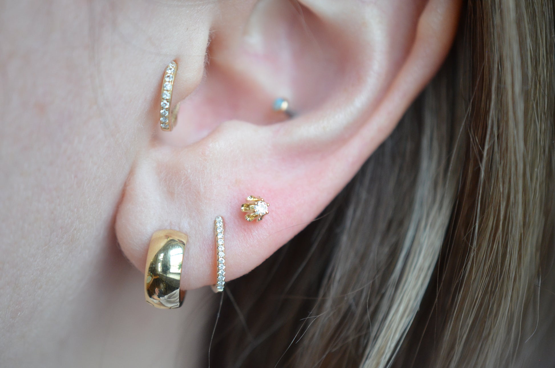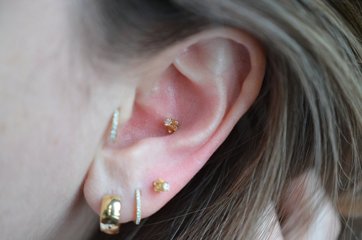 Airy, feminine, and floral, we love these as a classic look in an earlobe, or given a sweet little edge in any one of your cartilage piercings (see the last photo for an example in a conch piercing).