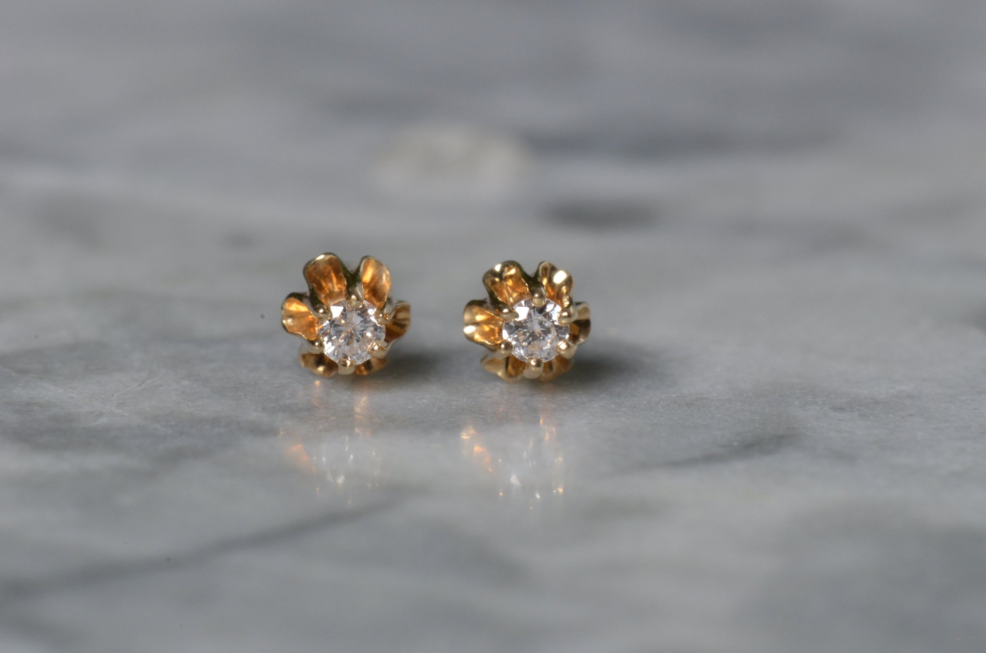 Delicate Victorian-inspired buttercup settings hold a pair of twinkling diamonds aloft in this pair of charming stud earrings, perfect for everyday wear. This style of setting enjoyed popularity in the Victorian era and a revival in the 1940s, with these earrings dating to the mid-twentieth century.