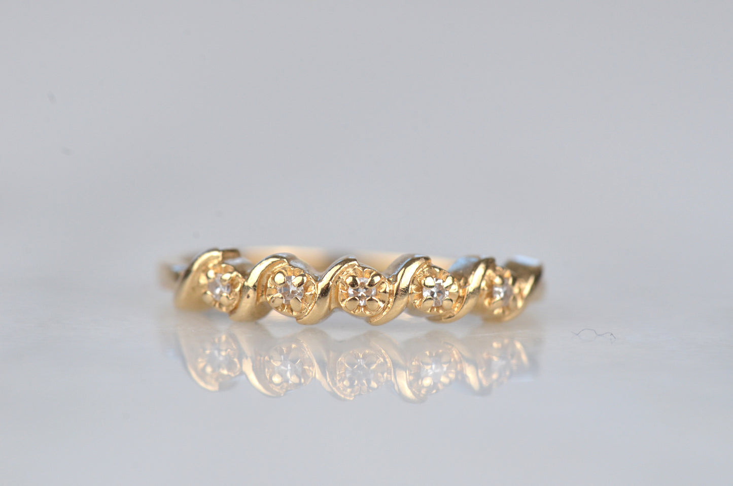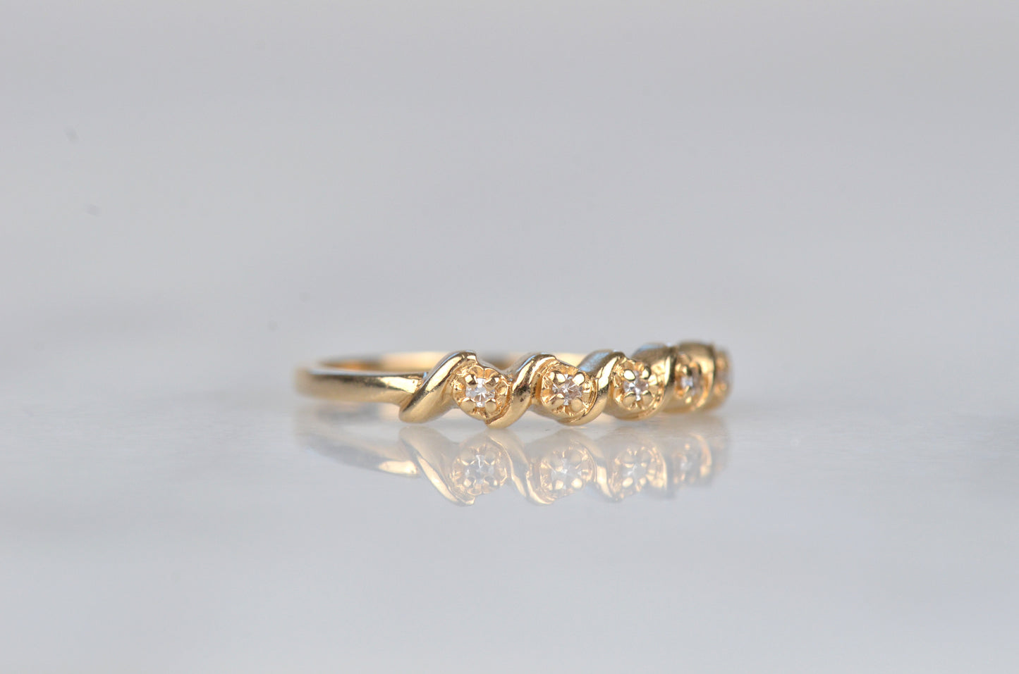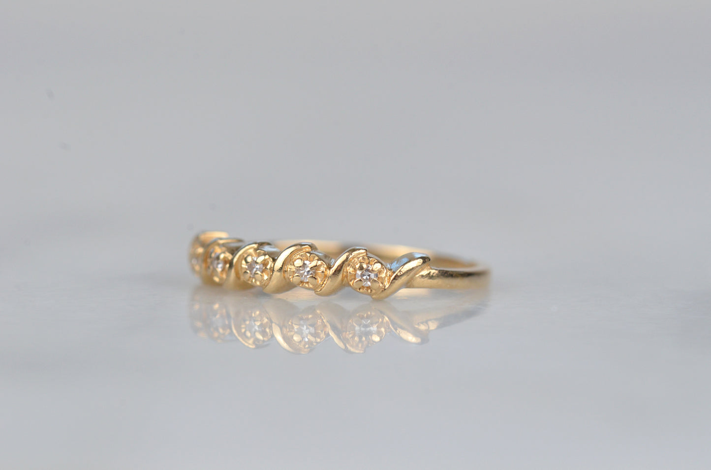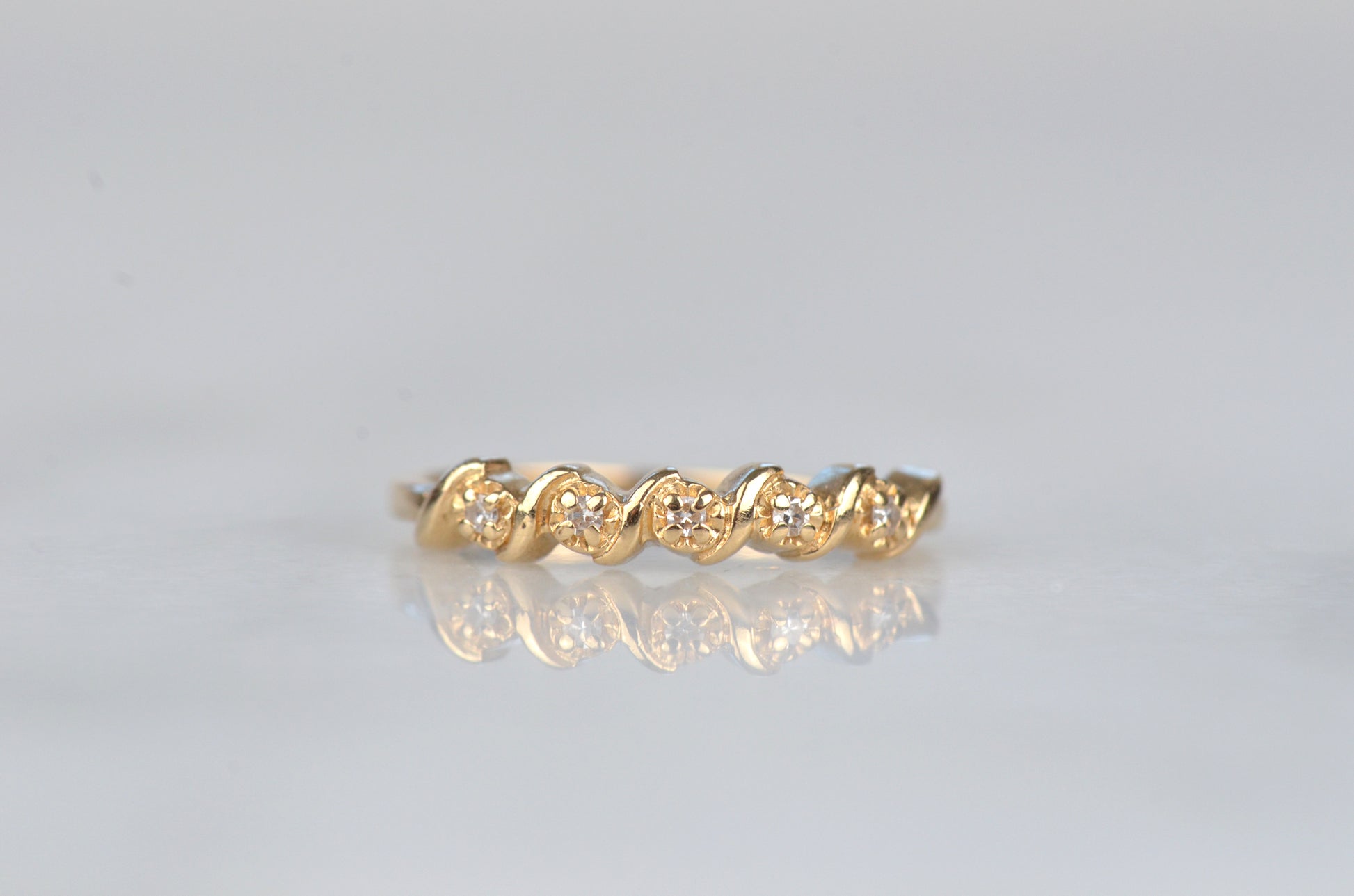 A sweet and comfortable ring that stacks like a champ but catches eyes solo as well, thanks to a fine band faced with five twinkling diamonds. Each stone is set with a quartet of prongs that creates a milgrain-like look on the settings, perfectly enhanced by a smooth S of gold between each one. Low rise and slim between the fingers, you'll find yourself reaching for this piece time and again.