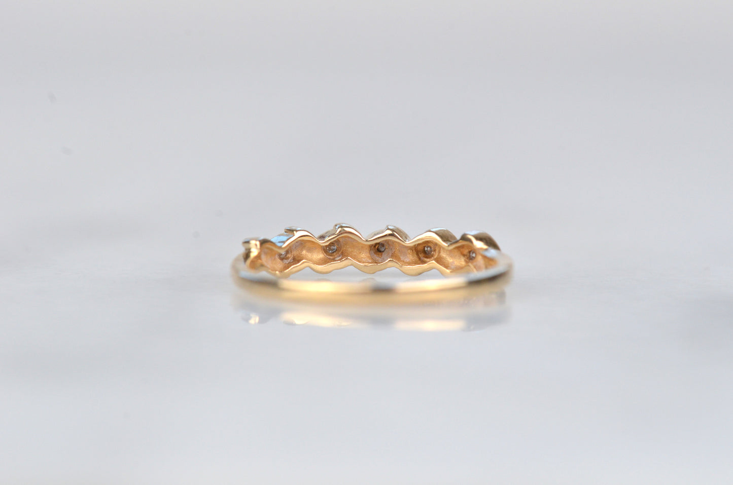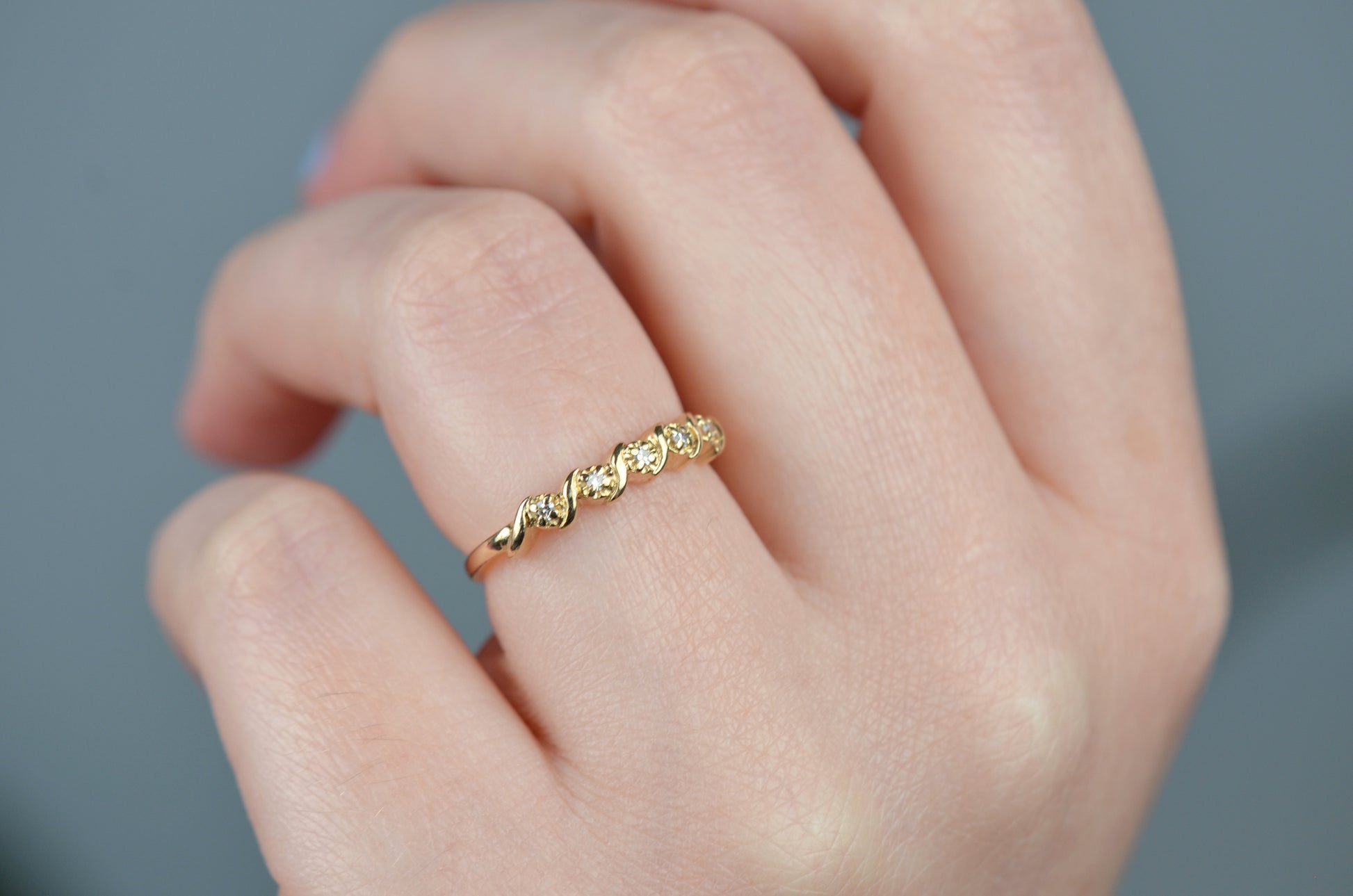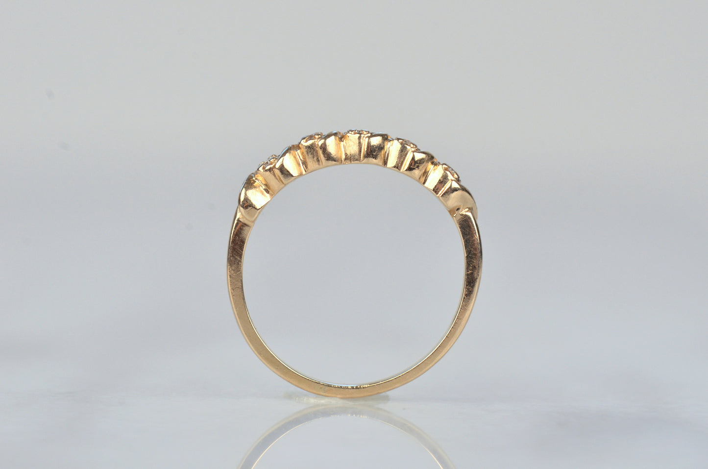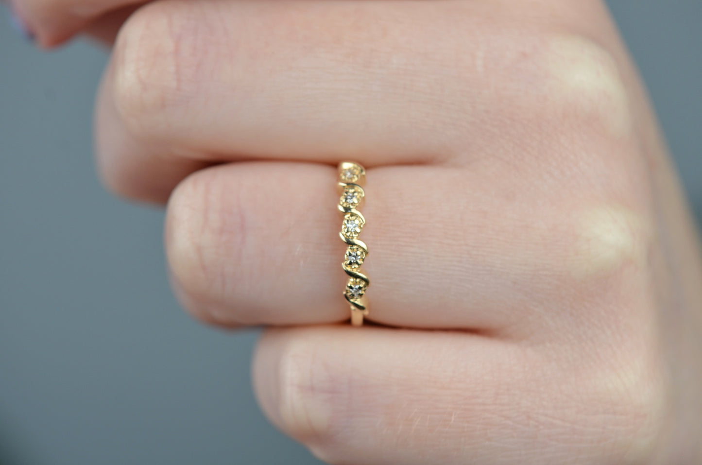 A sweet and comfortable ring that stacks like a champ but catches eyes solo as well, thanks to a fine band faced with five twinkling diamonds. Each stone is set with a quartet of prongs that creates a milgrain-like look on the settings, perfectly enhanced by a smooth S of gold between each one. Low rise and slim between the fingers, you'll find yourself reaching for this piece time and again.