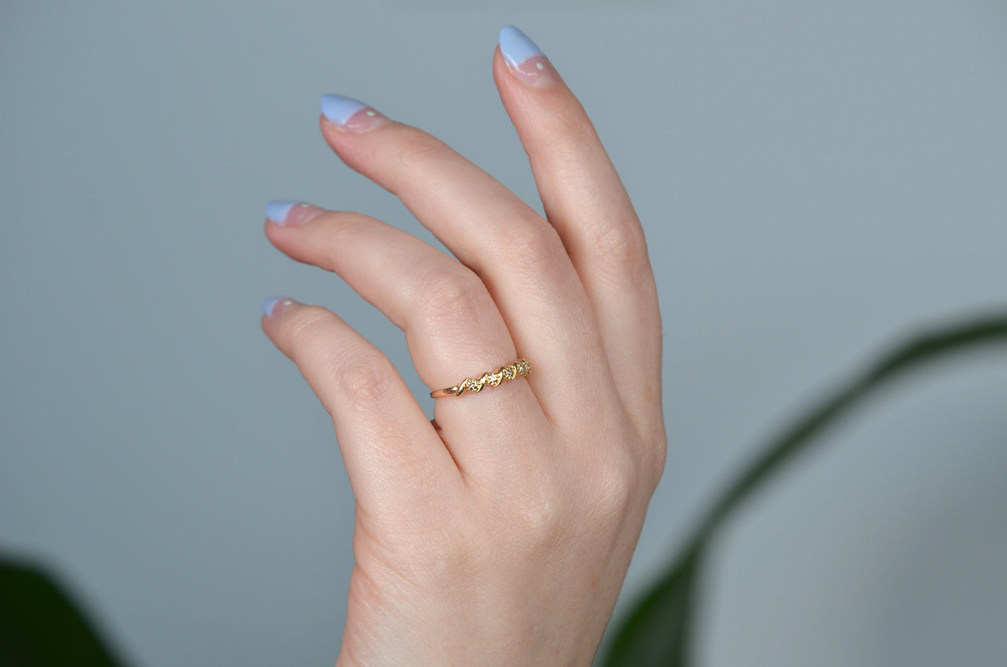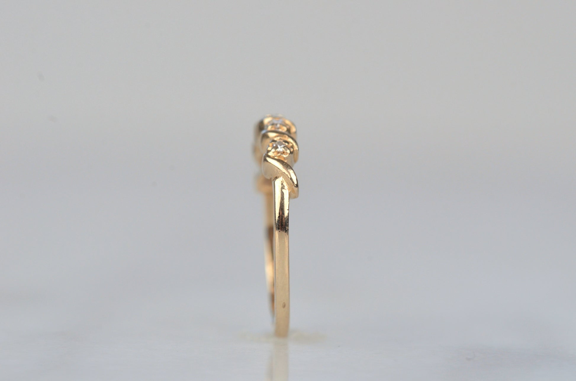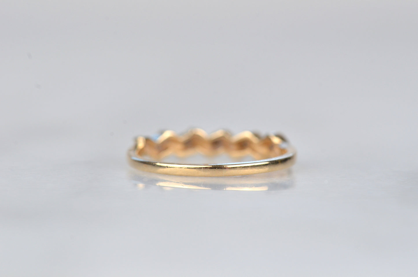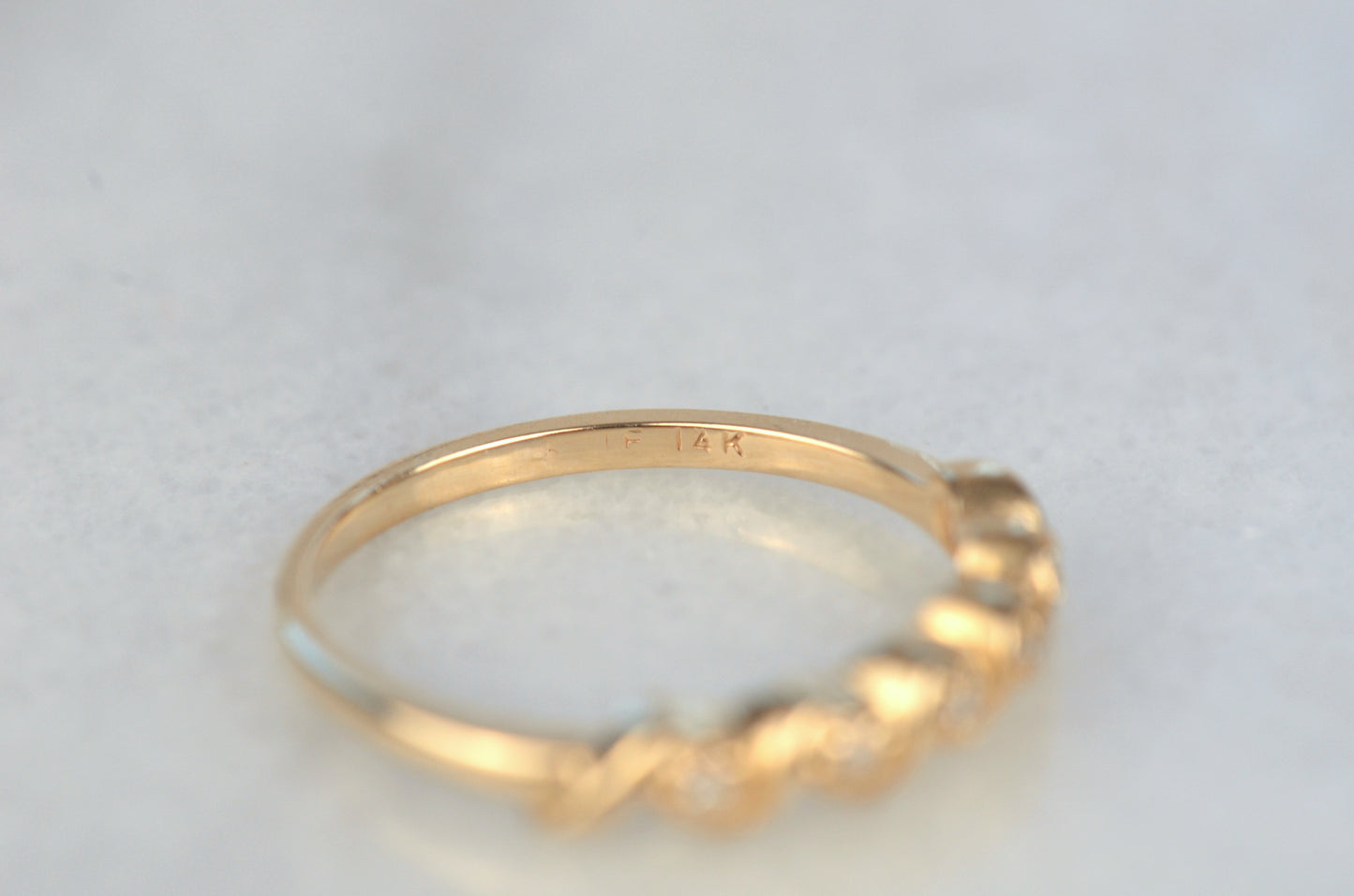 A sweet and comfortable ring that stacks like a champ but catches eyes solo as well, thanks to a fine band faced with five twinkling diamonds. Each stone is set with a quartet of prongs that creates a milgrain-like look on the settings, perfectly enhanced by a smooth S of gold between each one. Low rise and slim between the fingers, you'll find yourself reaching for this piece time and again.