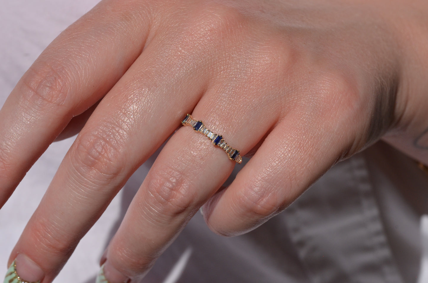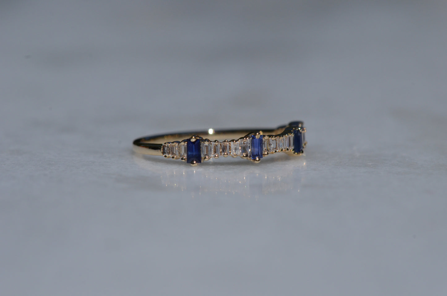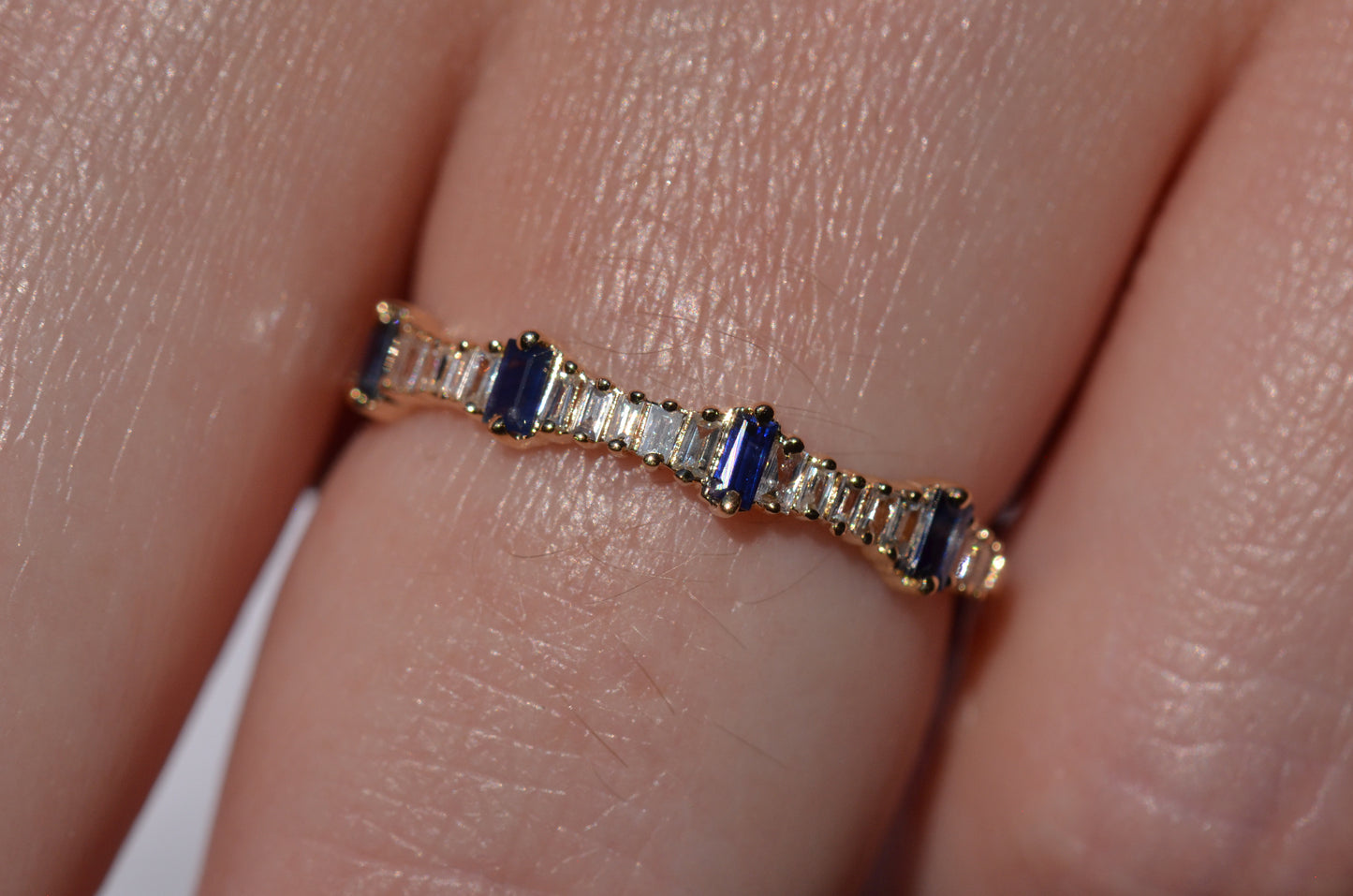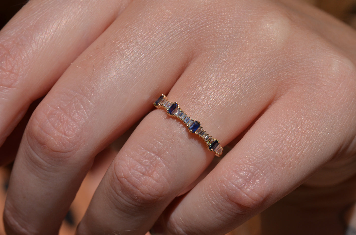 Petite and sweet, this barely-there band features a wave of baguette cut diamonds and sapphires in graduating sizes, ebbing and flowing like the tides. Baguette cuts were developed in the early 20th century for the geometry- and precision-minded designs of the Art Deco period and have continued to thrill as accent stones and stand alones ever since.