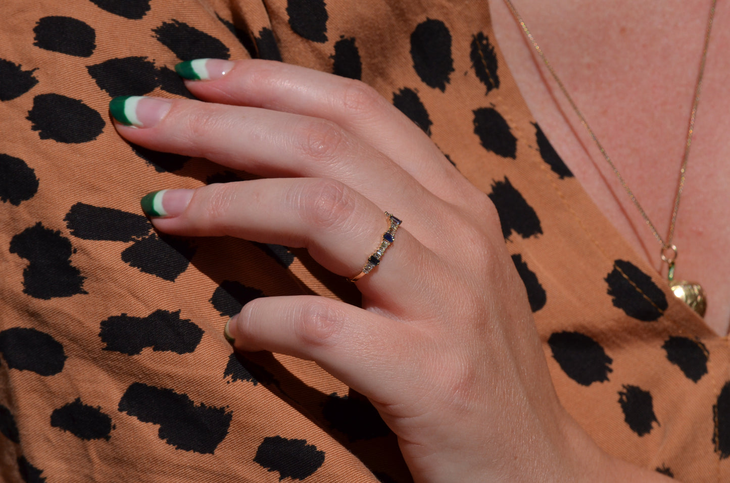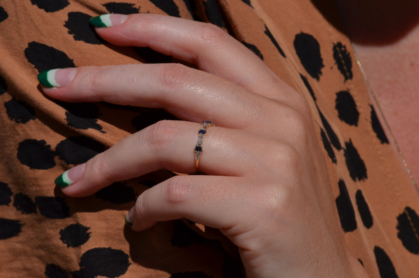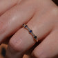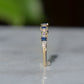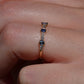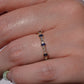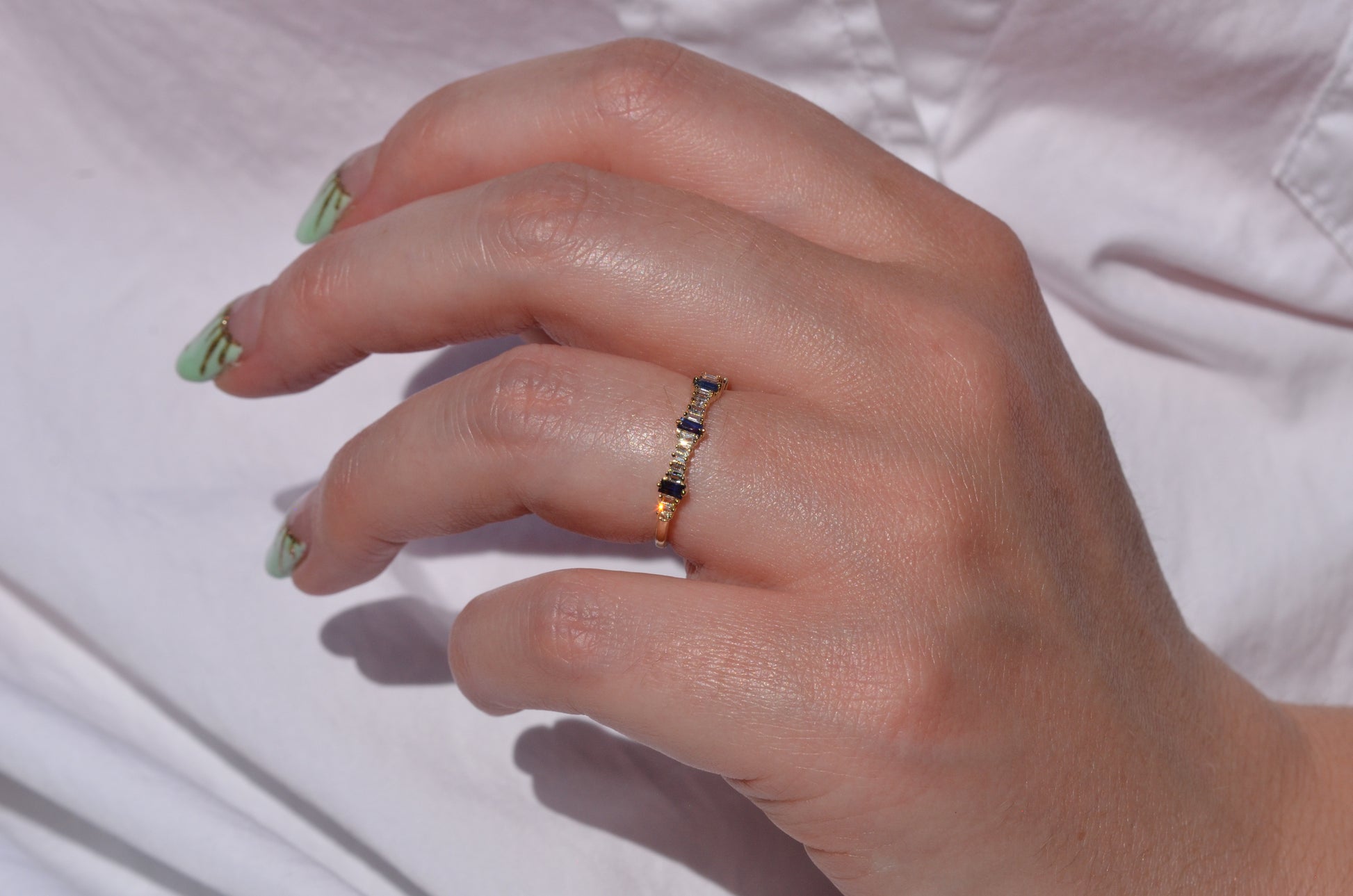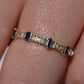 Petite and sweet, this barely-there band features a wave of baguette cut diamonds and sapphires in graduating sizes, ebbing and flowing like the tides. Baguette cuts were developed in the early 20th century for the geometry- and precision-minded designs of the Art Deco period and have continued to thrill as accent stones and stand alones ever since.