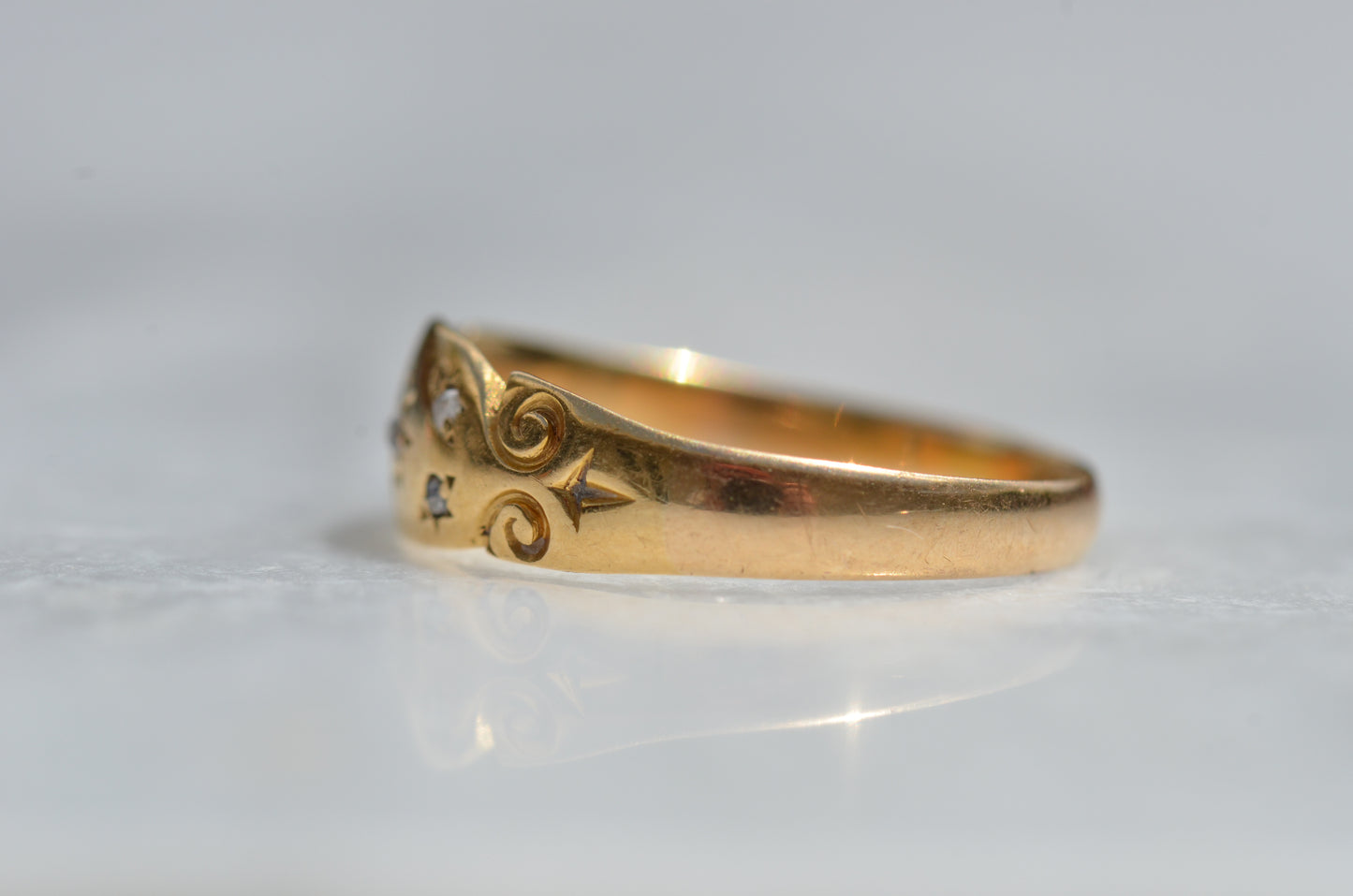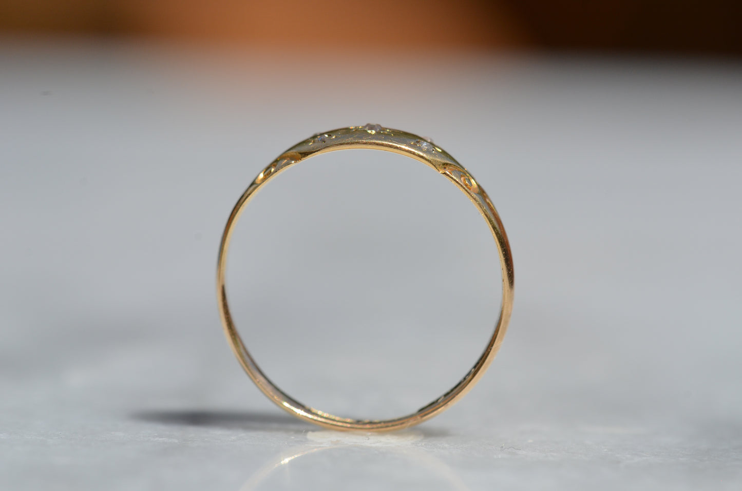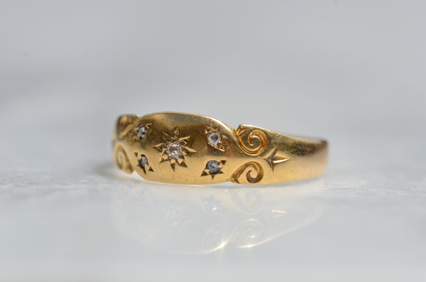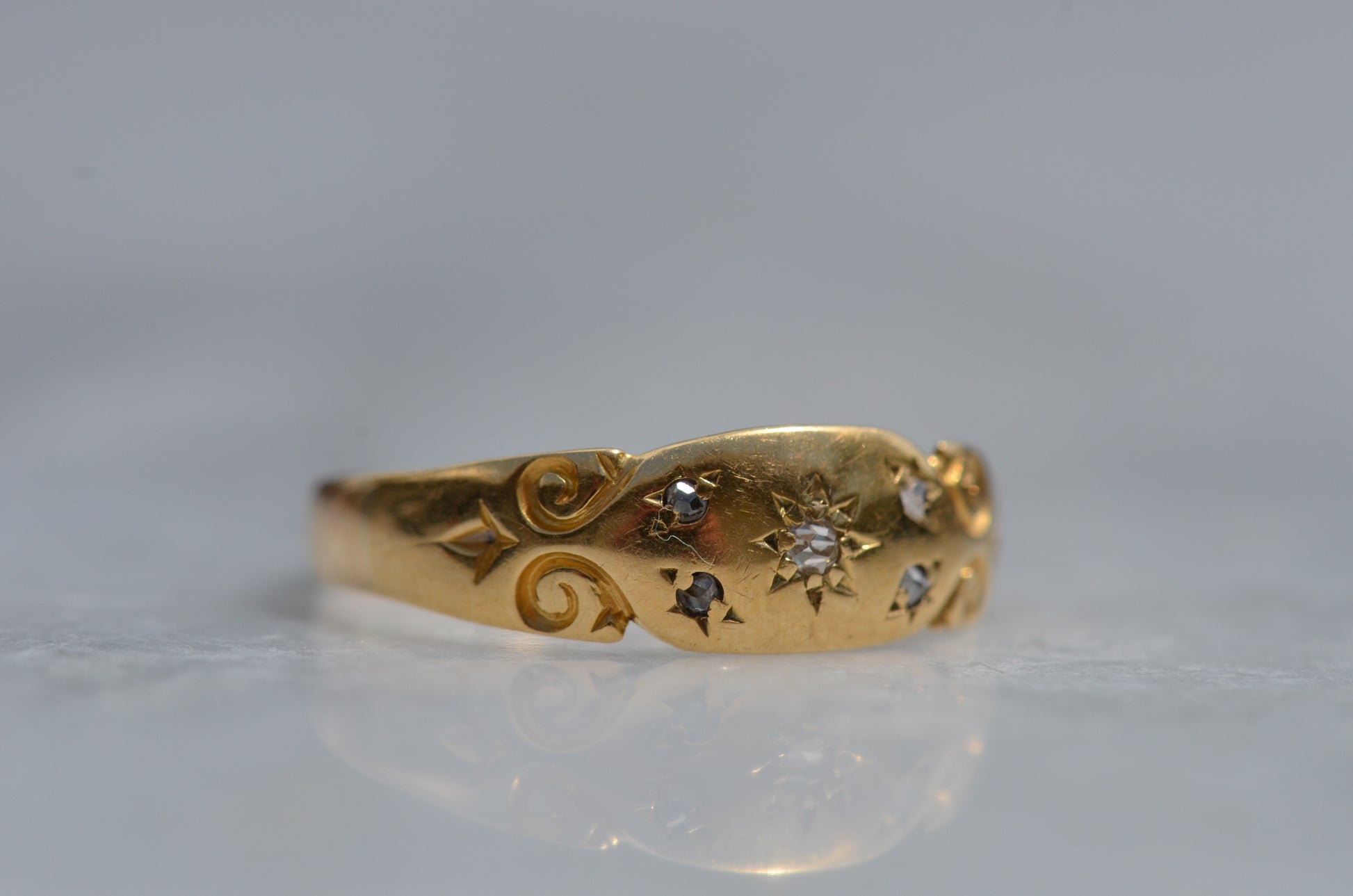 A darling Edwardian ring from the early 20th century, this warm gold band features a quintet of subtly sparkling diamonds in star settings designed to catch the eye. We love the additional flourishes of scrolls and stars at the shoulders, and how comfortable this band feels on the hand.