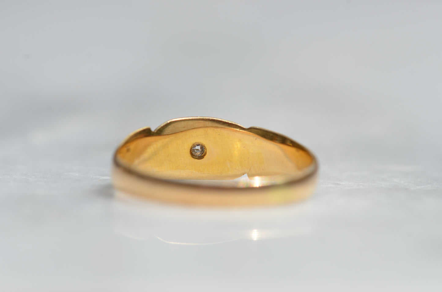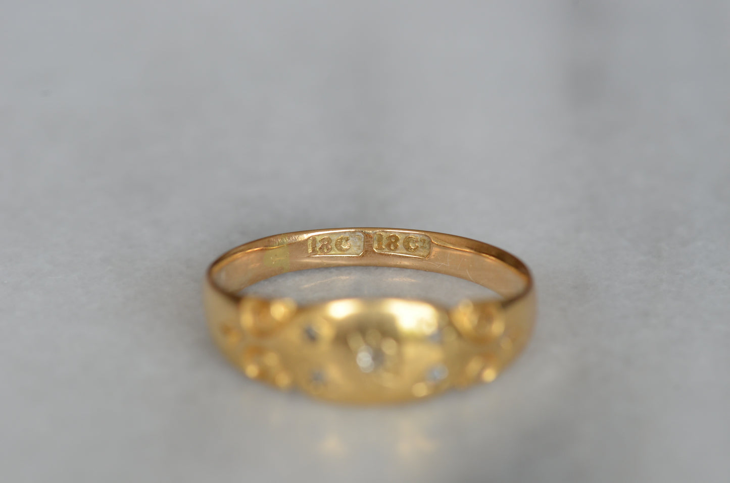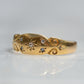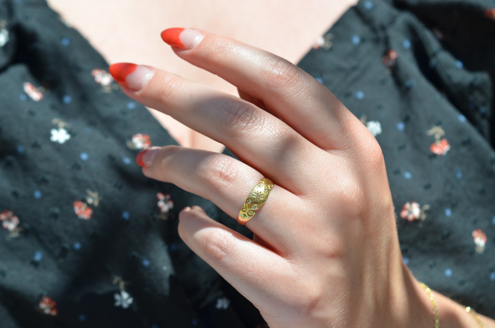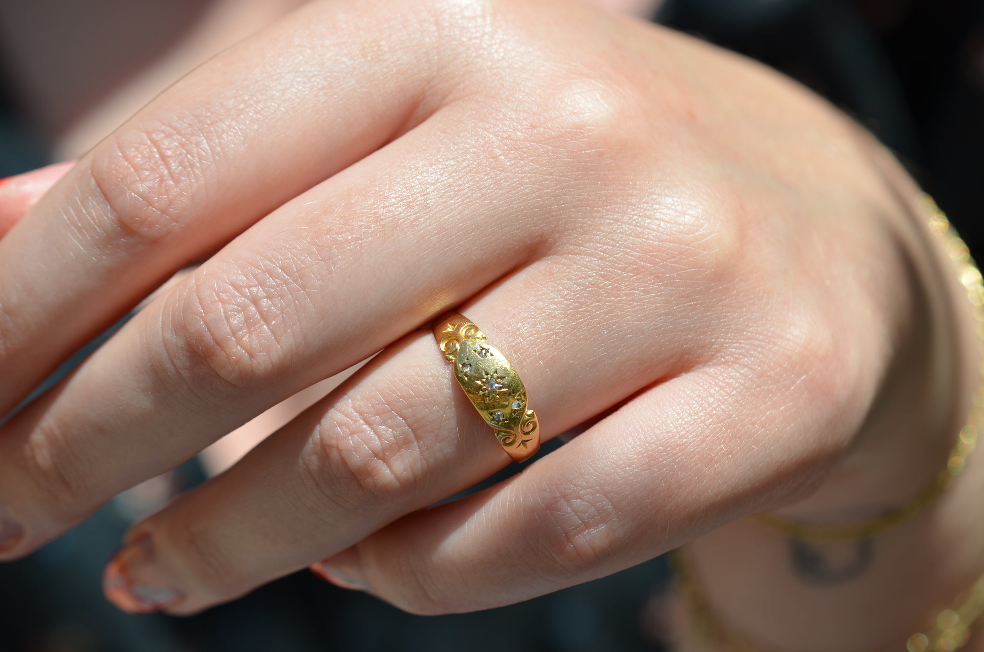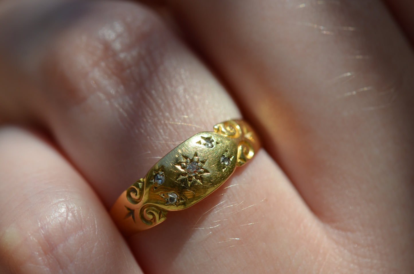 A darling Edwardian ring from the early 20th century, this warm gold band features a quintet of subtly sparkling diamonds in star settings designed to catch the eye. We love the additional flourishes of scrolls and stars at the shoulders, and how comfortable this band feels on the hand.