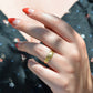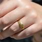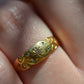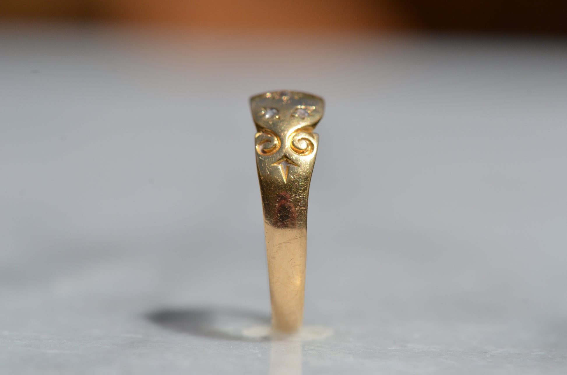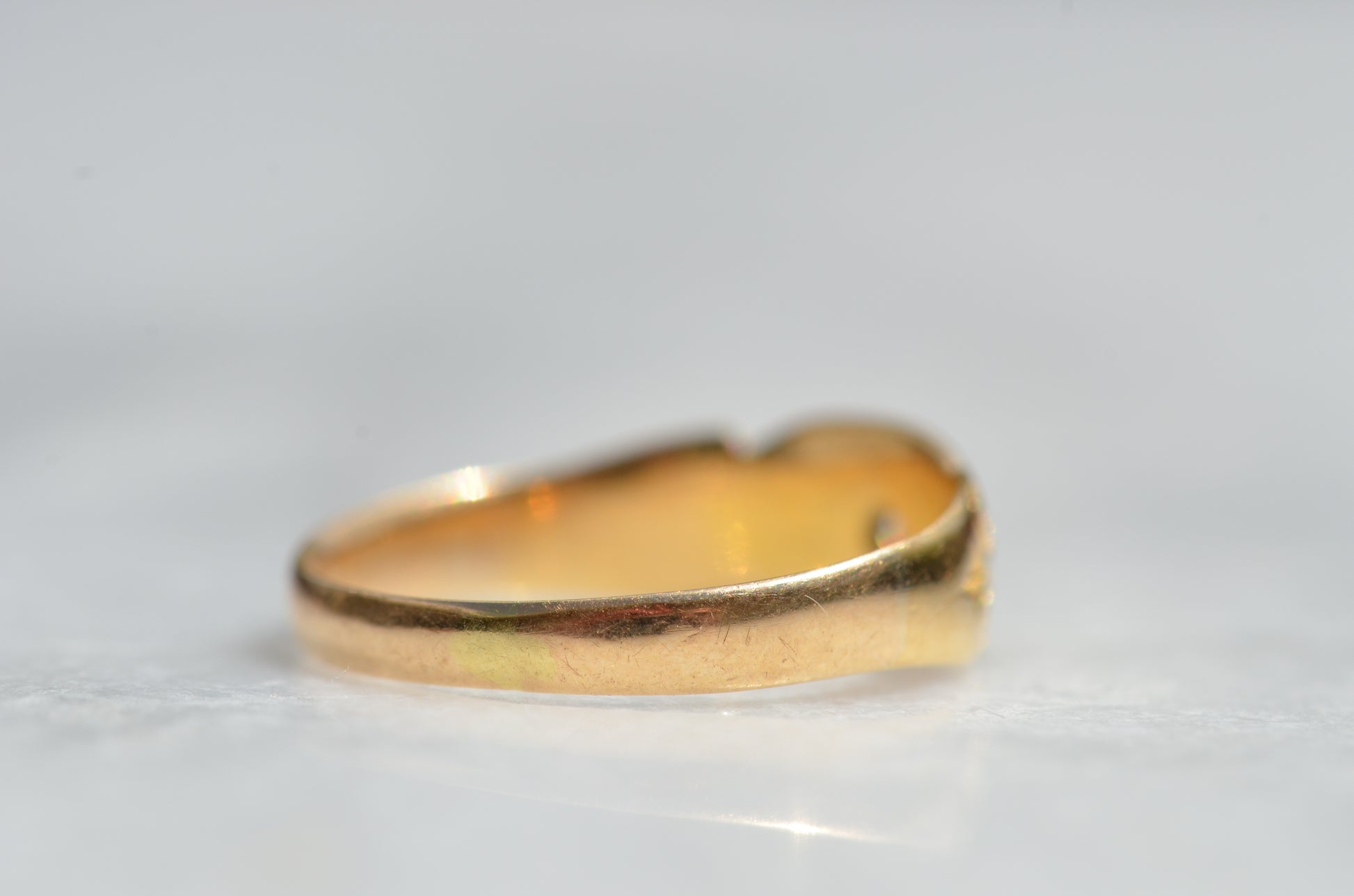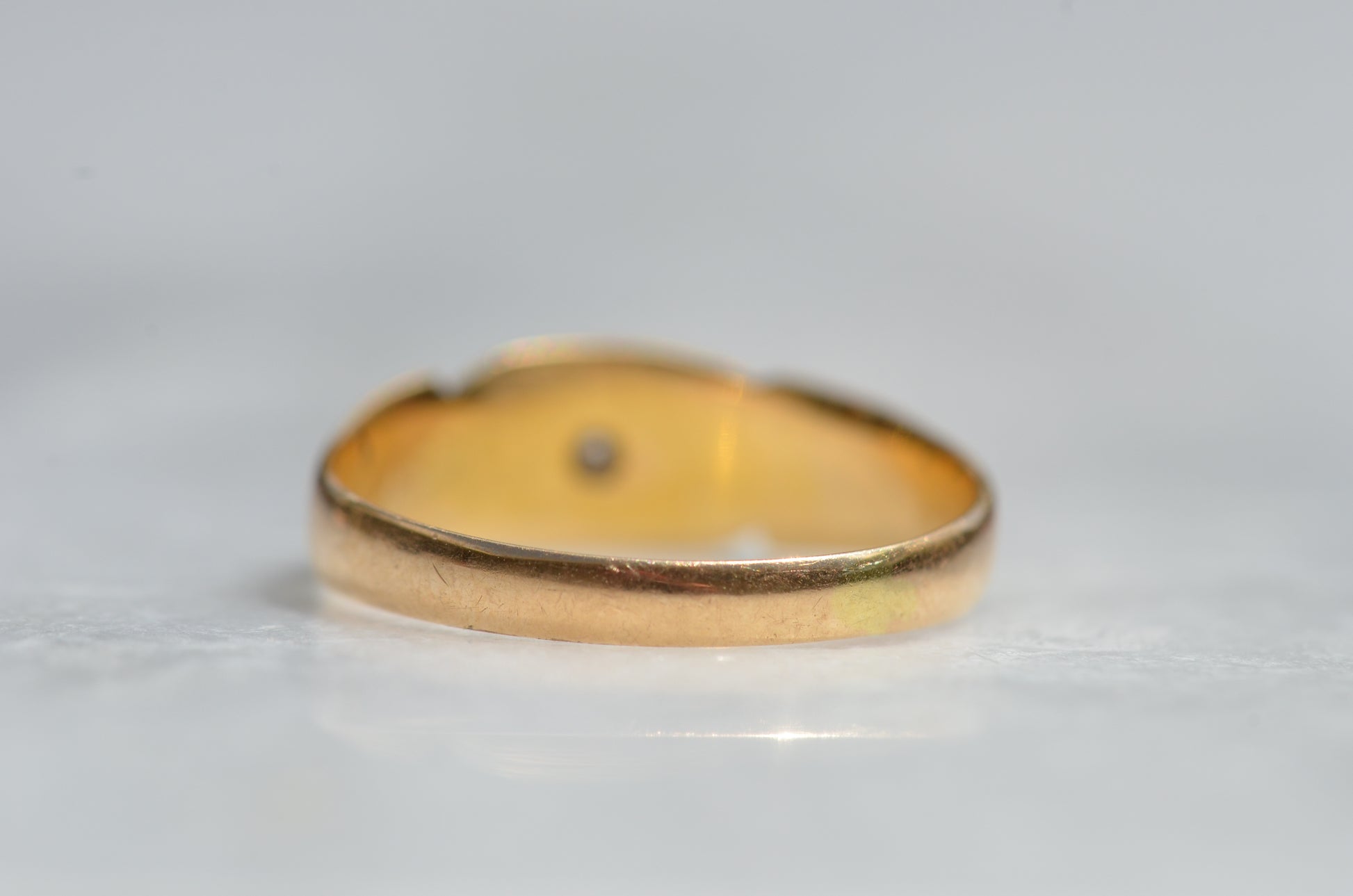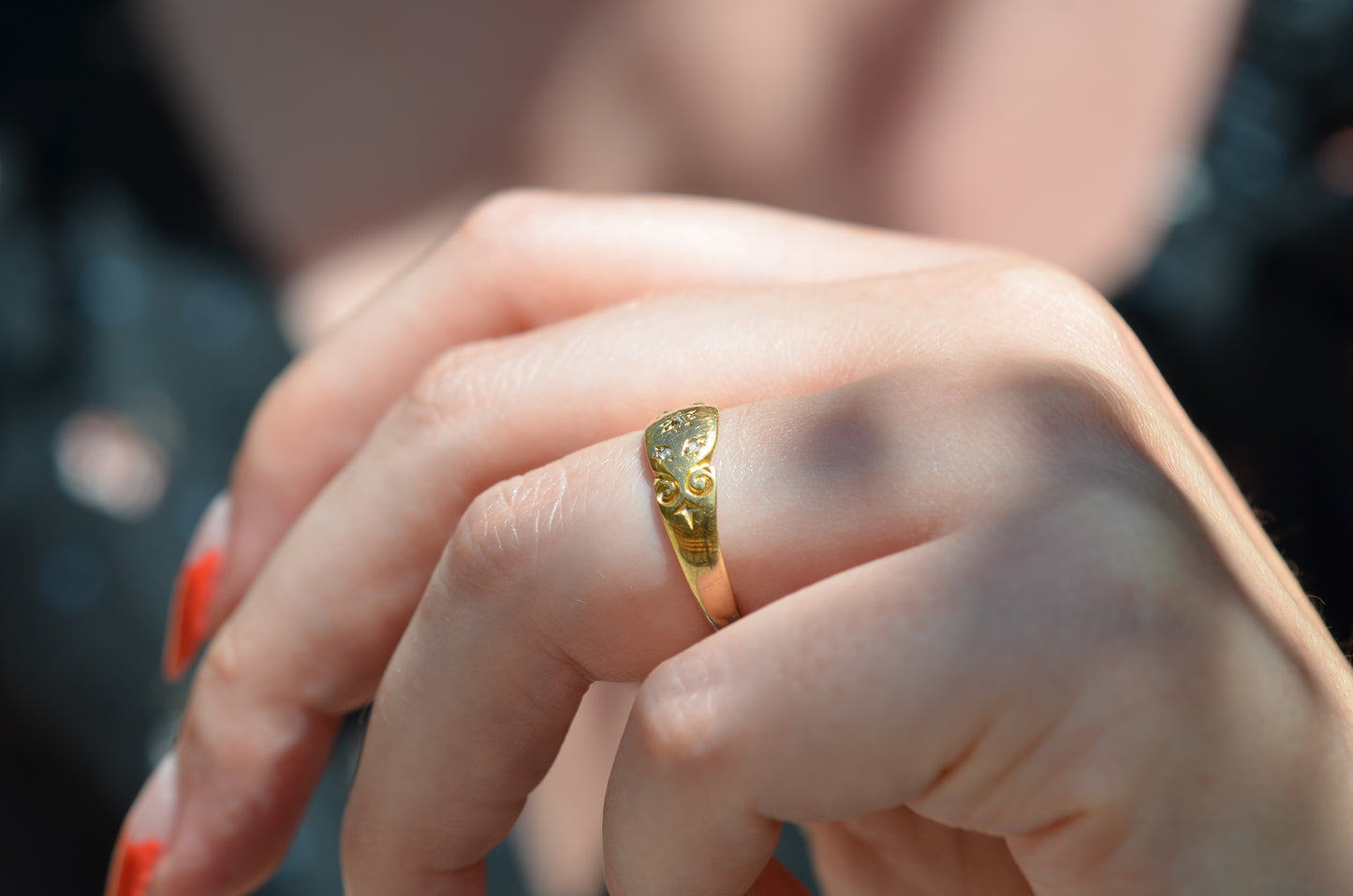 A darling Edwardian ring from the early 20th century, this warm gold band features a quintet of subtly sparkling diamonds in star settings designed to catch the eye. We love the additional flourishes of scrolls and stars at the shoulders, and how comfortable this band feels on the hand.