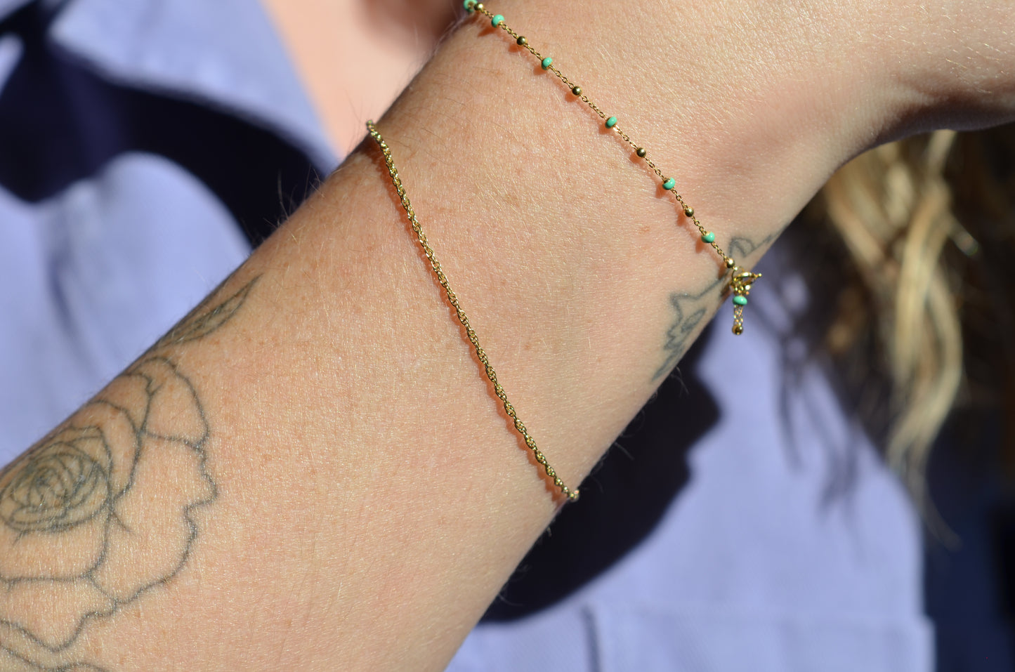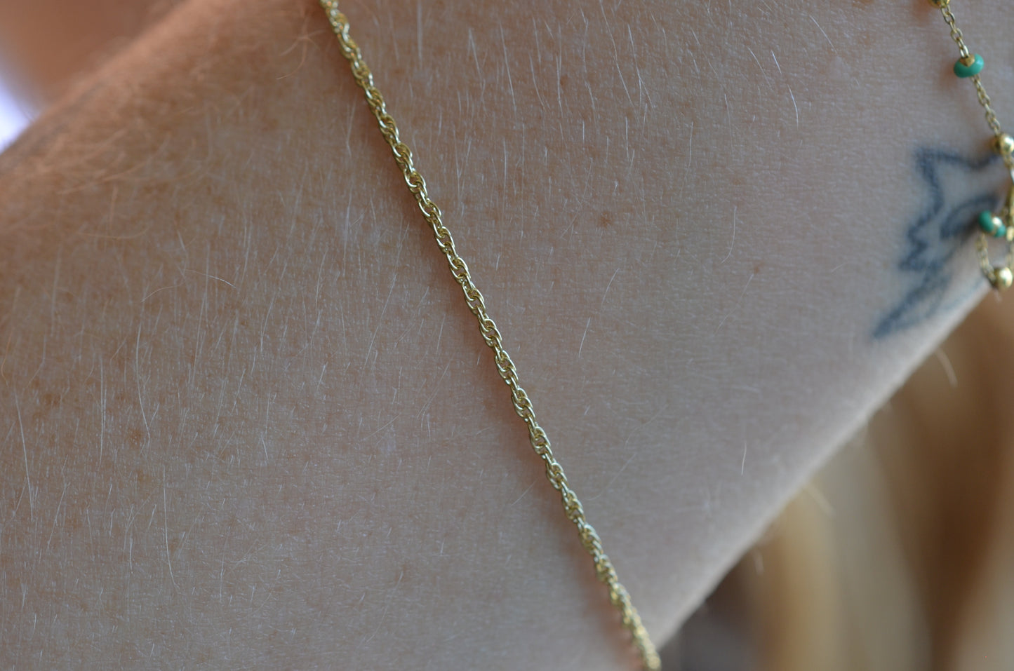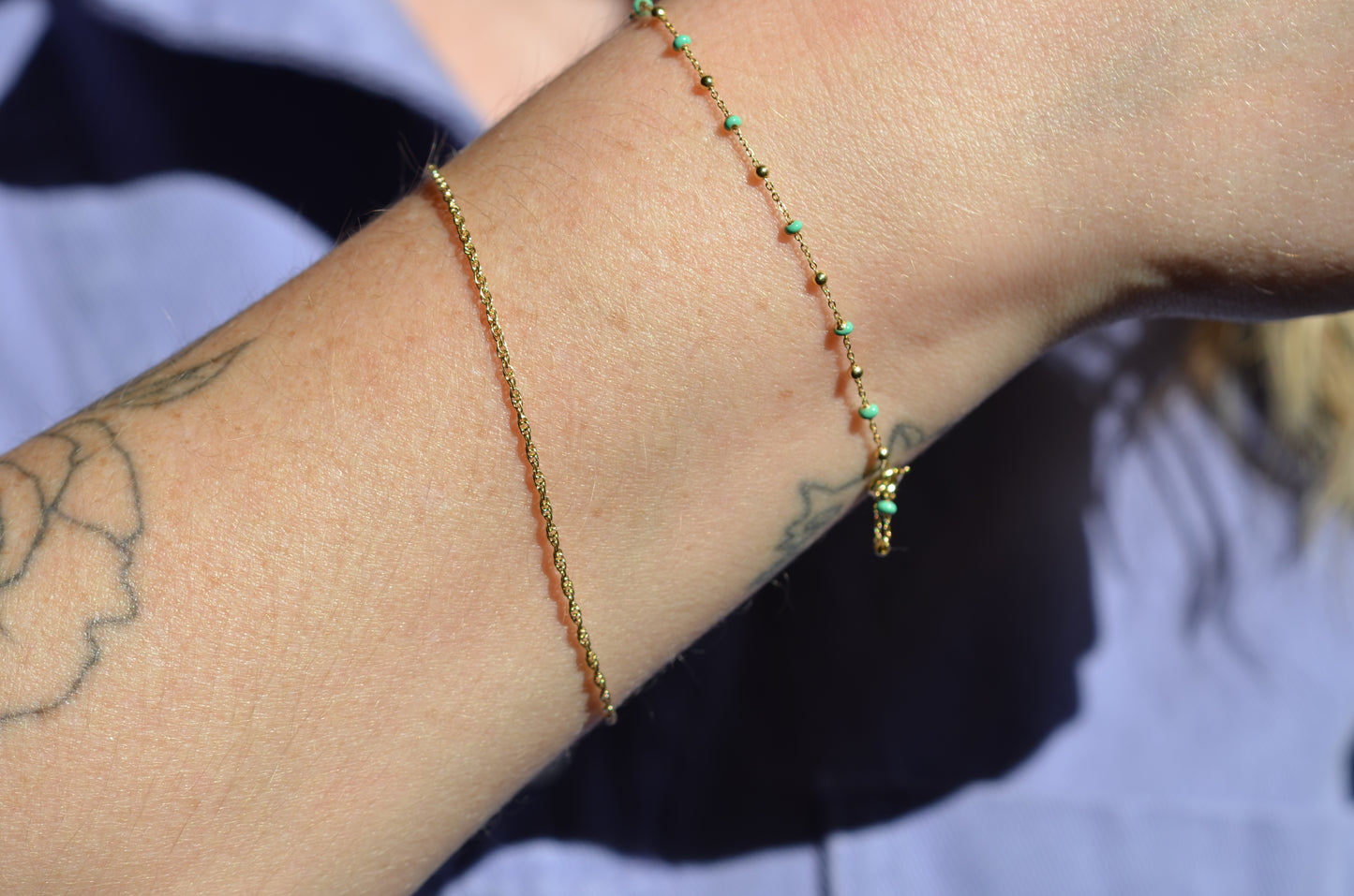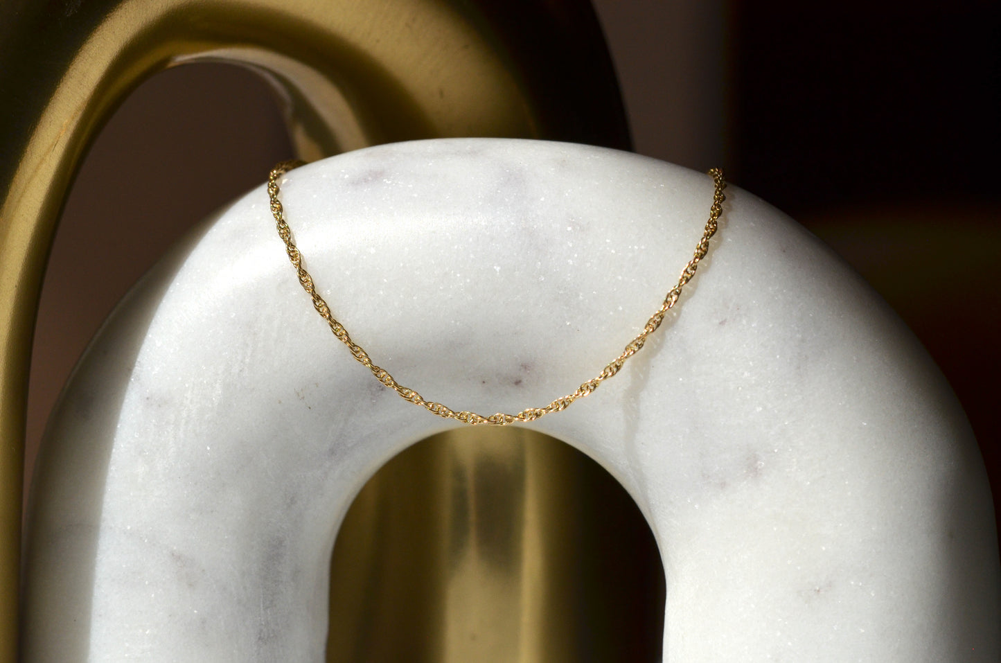 Like the most delicate angel's hair, this fine chain is just a whisper of gold sparkling and shimmering right along your wrist. A classic bracelet style, we love the way the twist of the Singapore style chain catches and bounces the light around. While we never recommend sleeping or showering in your jewelry, that's especially true of fine chains like this which can end up being gently tugged from the movement of rolling around in bed or a rough towelling off, which overtime weakens the links and can cause a break in the same was as a strong tug could. A little extra care can go a very long way to keeping your pieces in beautiful shape for many years to come!