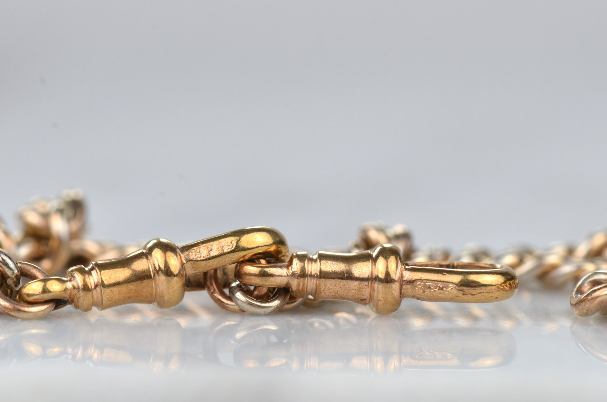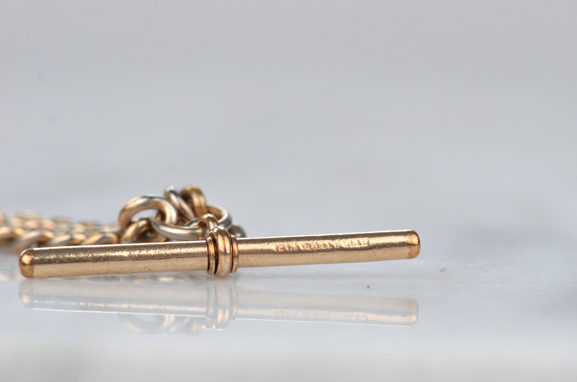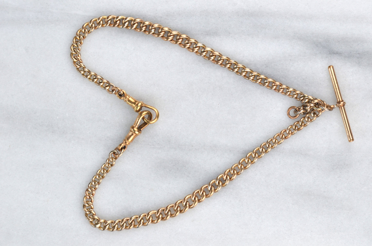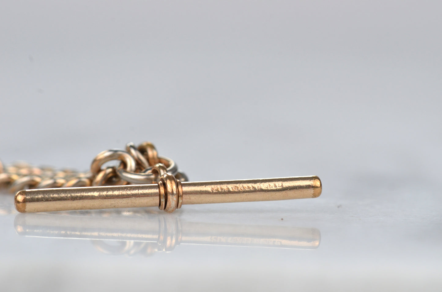 A gorgeous antique double Albert chain, these are a challenge to find in lengths long enough to wear as necklaces - and at affordable prices! Originally intended for use as watch chains, the t-bar was meant to slide through a vest's buttonhole to anchor the chain, while dogclips at either end were used to secure pocket watches, fobs, keys and the like. While they can certainly still be worn in this way today, we also love to use them as necklaces now - the dogclips perfect to attach charms alone or on a charm ring. Crafted in rolled gold - extremely common for chains (especially men's chains) in the early 20th century, the gold plate is mechanically fused to a base metal core (rather than thinly deposited as in plating). This piece was certainly heavily worn and loved - much of the gold layer has worn away, but combined with the soft patina it still has a lovely tone.
